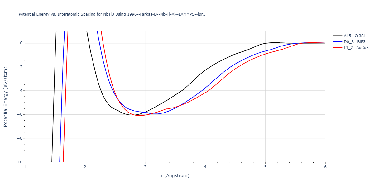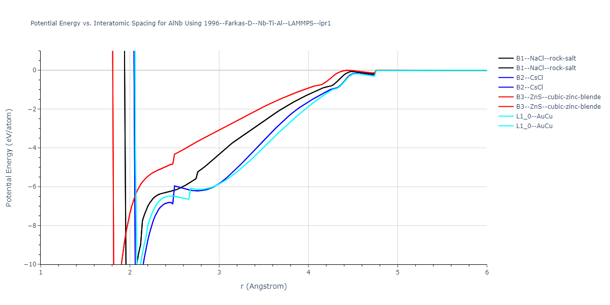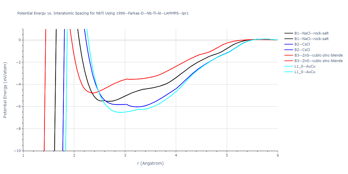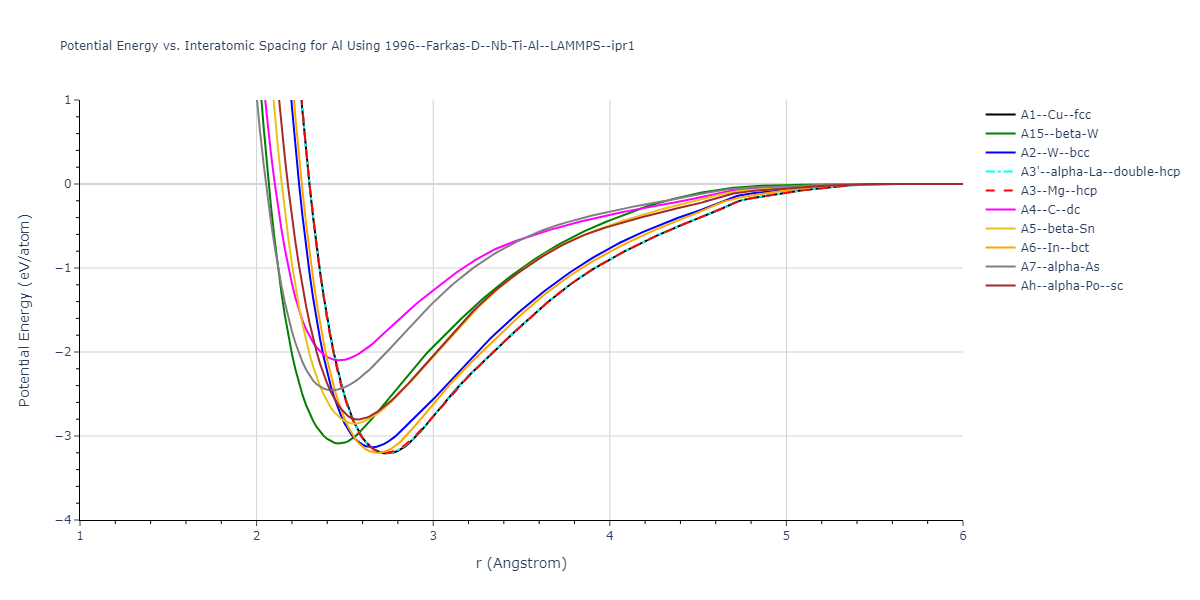 Plots of potential energy vs interatomic spacing, r, are shown below for a number of crystal structures. The structures are generated based on the ideal atomic positions and b/a and c/a lattice parameter ratios for a given crystal prototype. The size of the system is then uniformly scaled, and the energy calculated without relaxing the system. To obtain these plots, values of r are evaluated every 0.02 Å up to 6 Å.