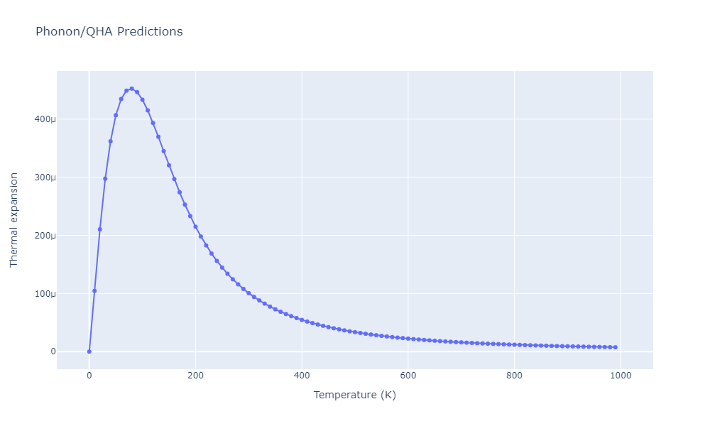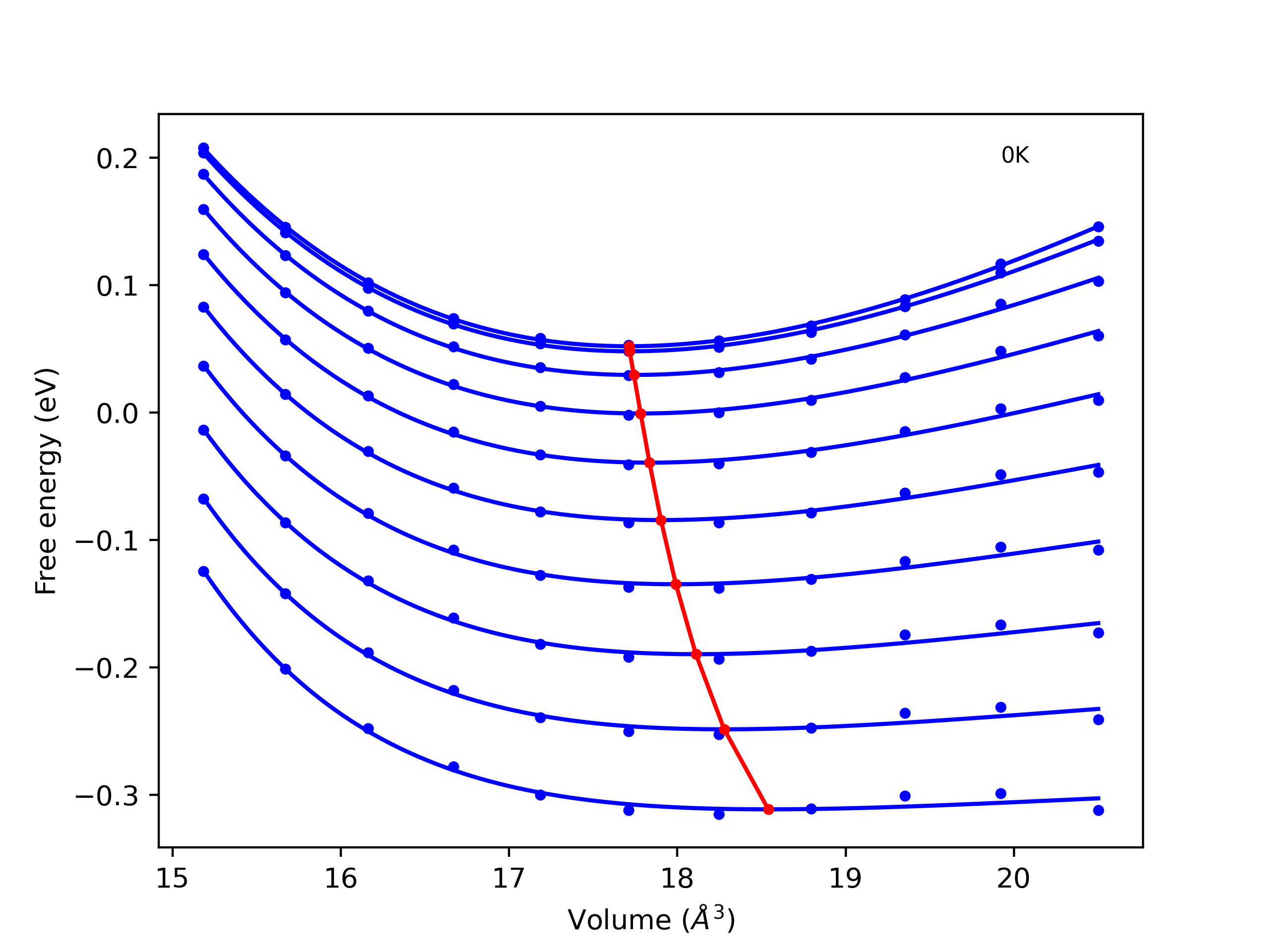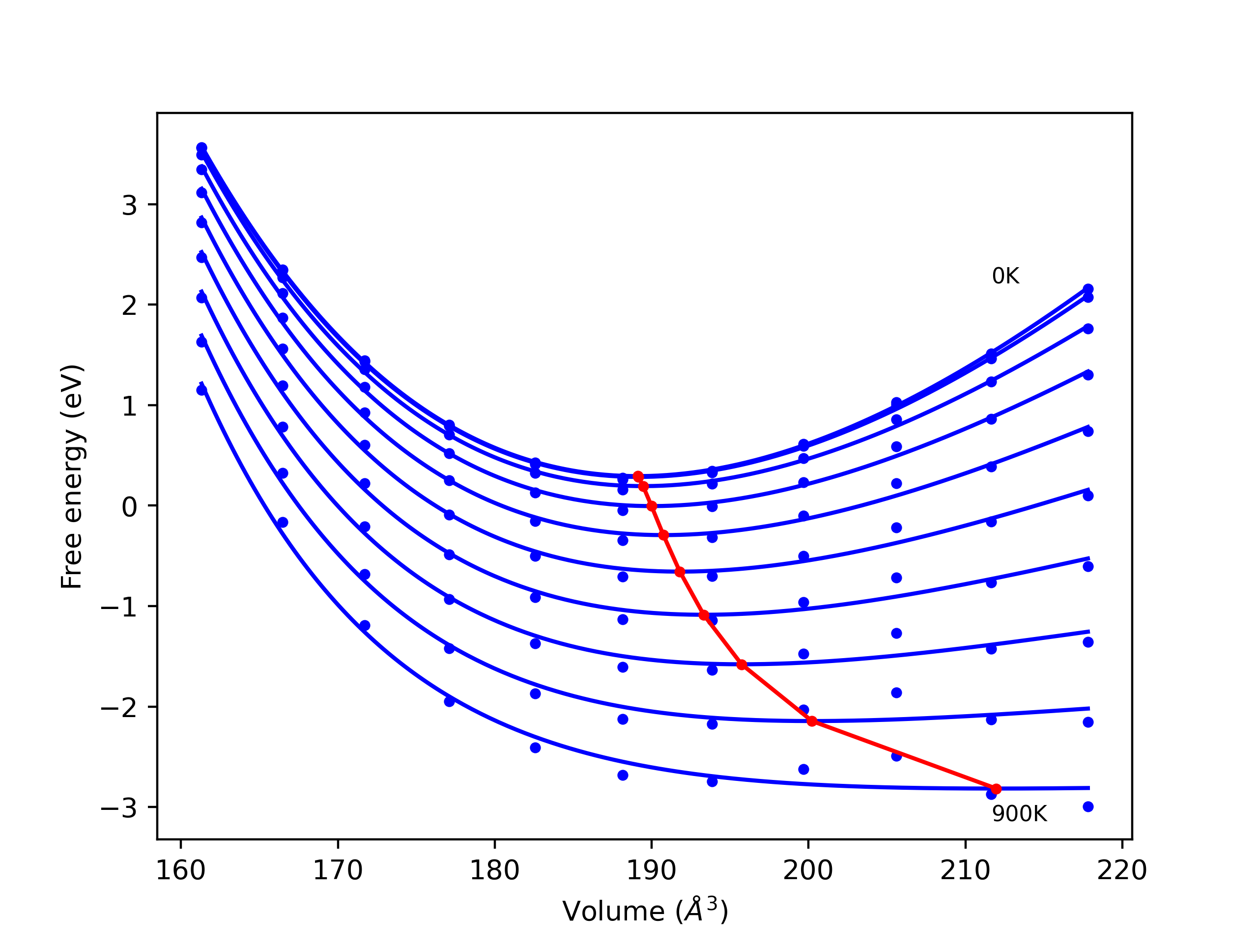 Plots of lattice and elastic constants are shown as a function of temperature. The 0K points were taken from the Crystal Structure Predictions and the Elastic Constants Predictions sections above for the unique crystal structures relaxed with the "dynamic" method. Starting from the 0 K relaxed crystal unit cells, supercell systems are created by replicating all three dimensions by the same multiplier to achieve at least 4000 atoms. The systems are then relaxed at 50 K and zero pressure using 1 million NPT steps. Lattice constants are estimated by averaging the measured box dimensions. Temperatures are iteratively increased by 50 K, with each subsequent relaxation calculation starting from the final atomic configuration at the previous temperature and relaxing for another 1 million steps.
