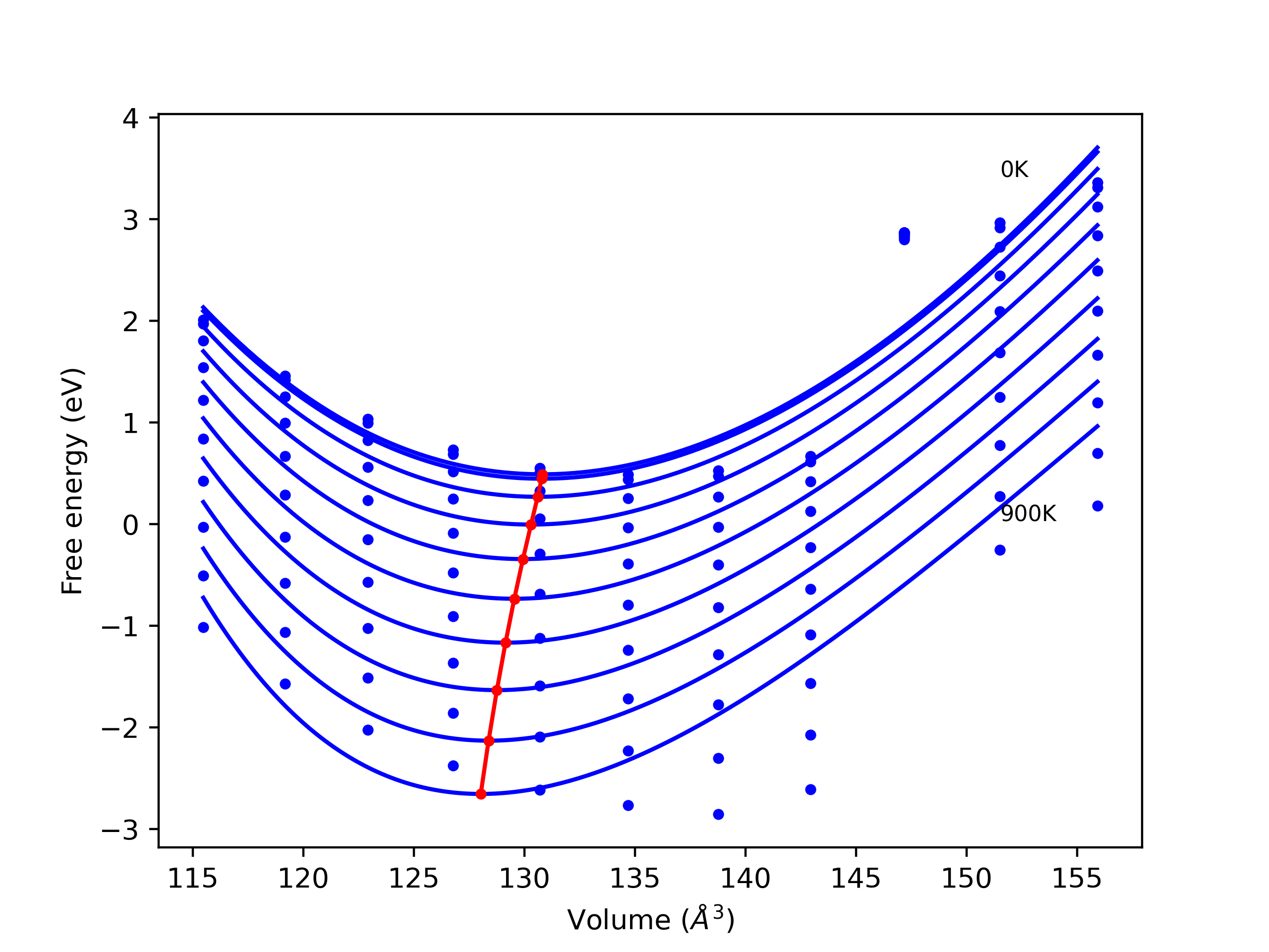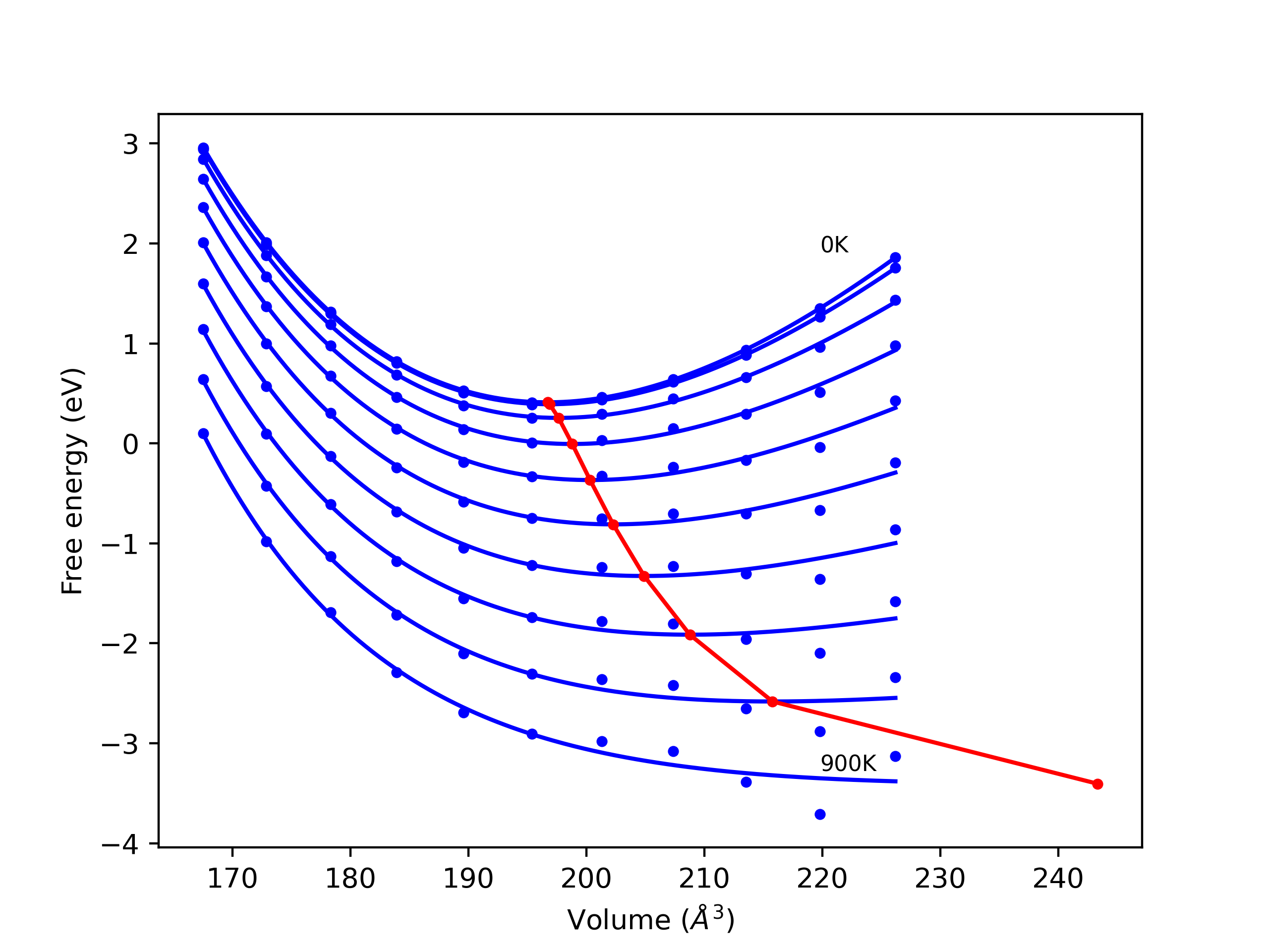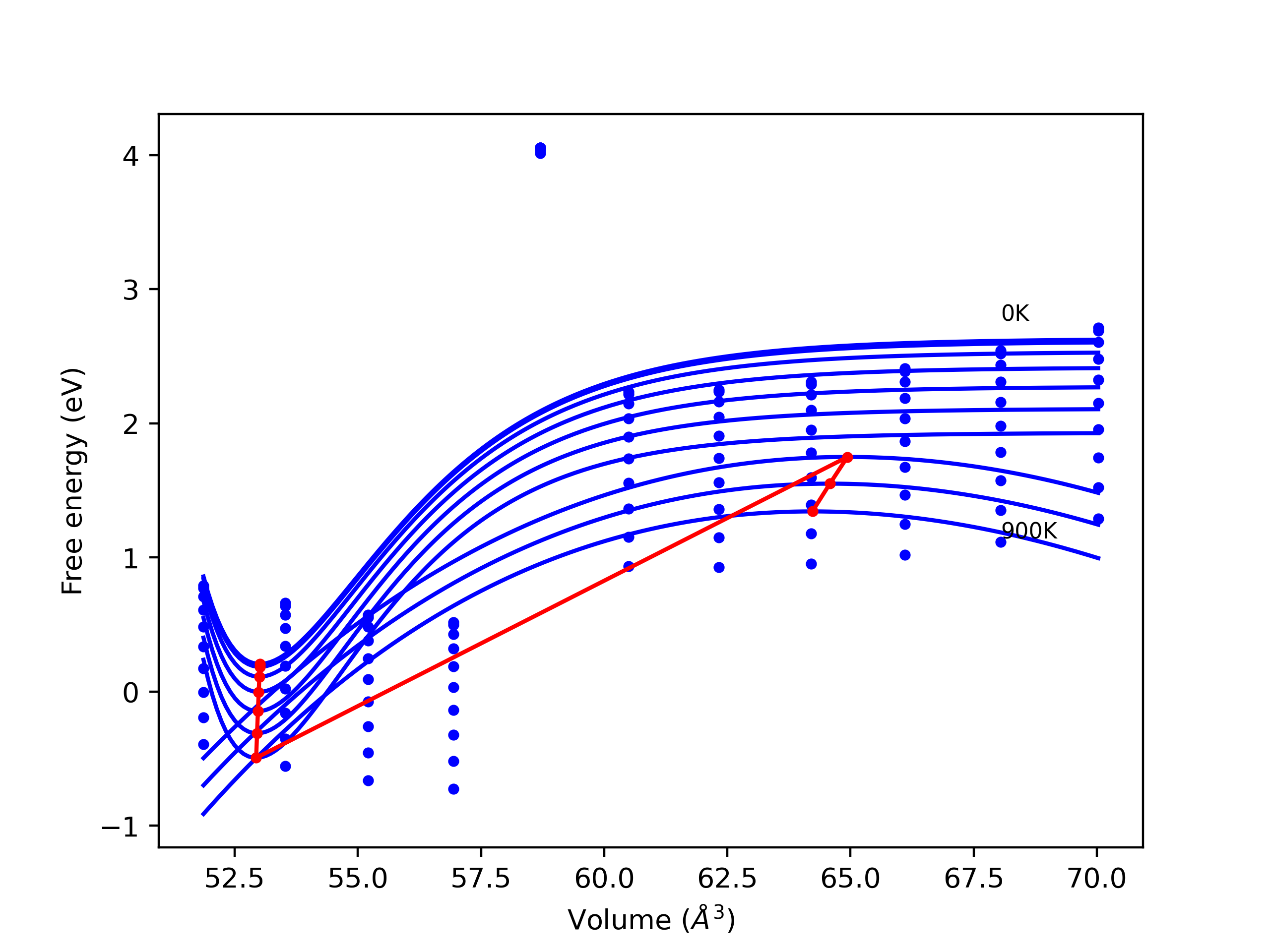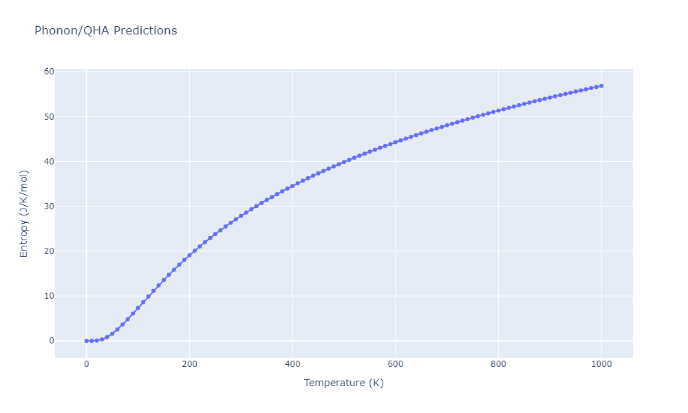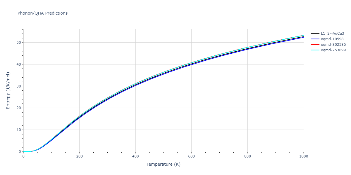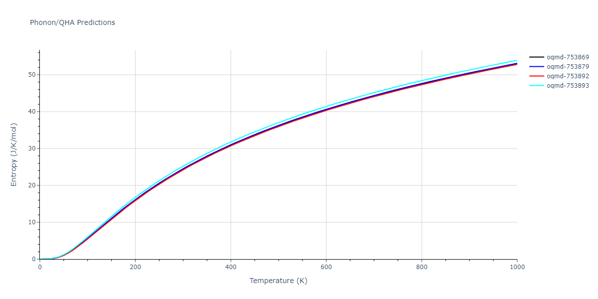 The Gibbs energies of the phases are estimated using thermodynamic integration between the interatomic potential in question and a simpler model with known Gibbs free energy values. For solids, the reference model is an Einstein solid, while for liquids it is the Uhlenbeck-Ford potential. Besides a short run at the start of the solid calculations to estimate Einstein model spring constants, the two calculations proceed similarly. Starting with the final relaxation configurations, the systems are stabilized for 25,000 steps. Then, over the next 50,000 steps the potential is swapped out for the reference potential. The system is then stabilized for another 25,000 steps with the reference model before a reverse swap of 50,000 steps is performed. The simulation ends with one final 25,000 step stabilization period. From the simulation, the irreversible work of transformation is estimated and used to compute the absolute Gibbs free energy of the target phase and potential relative to the reference potential. Entropy is estimated as the difference in enthalpy and Gibbs free energy and divided by temperature.