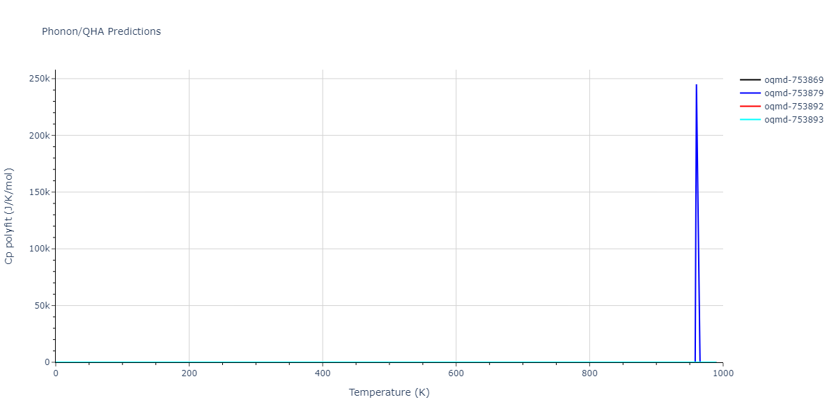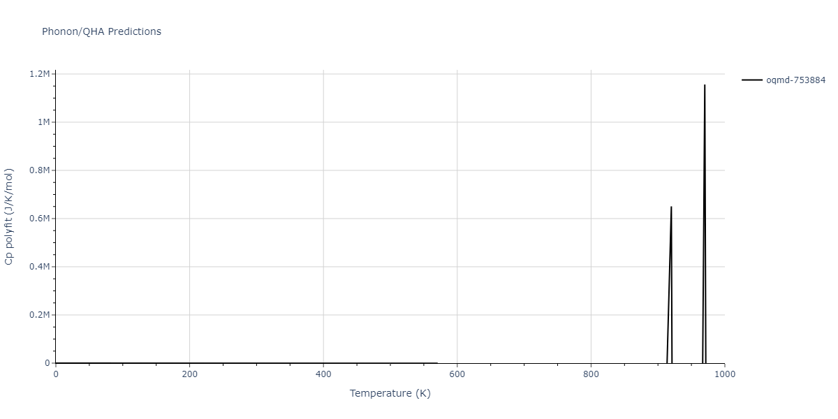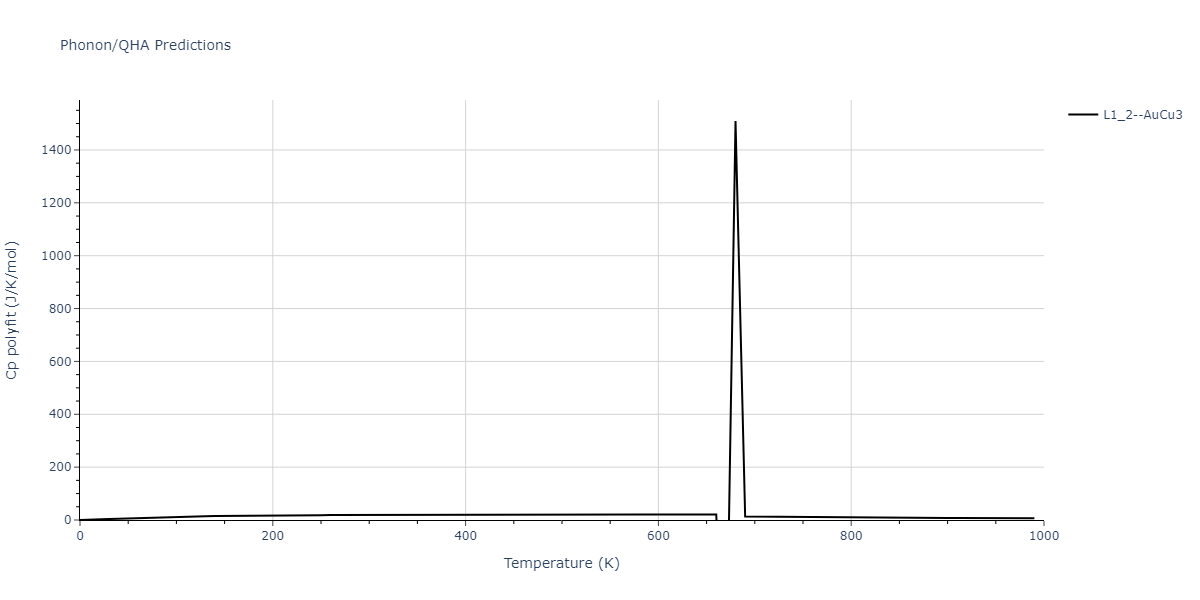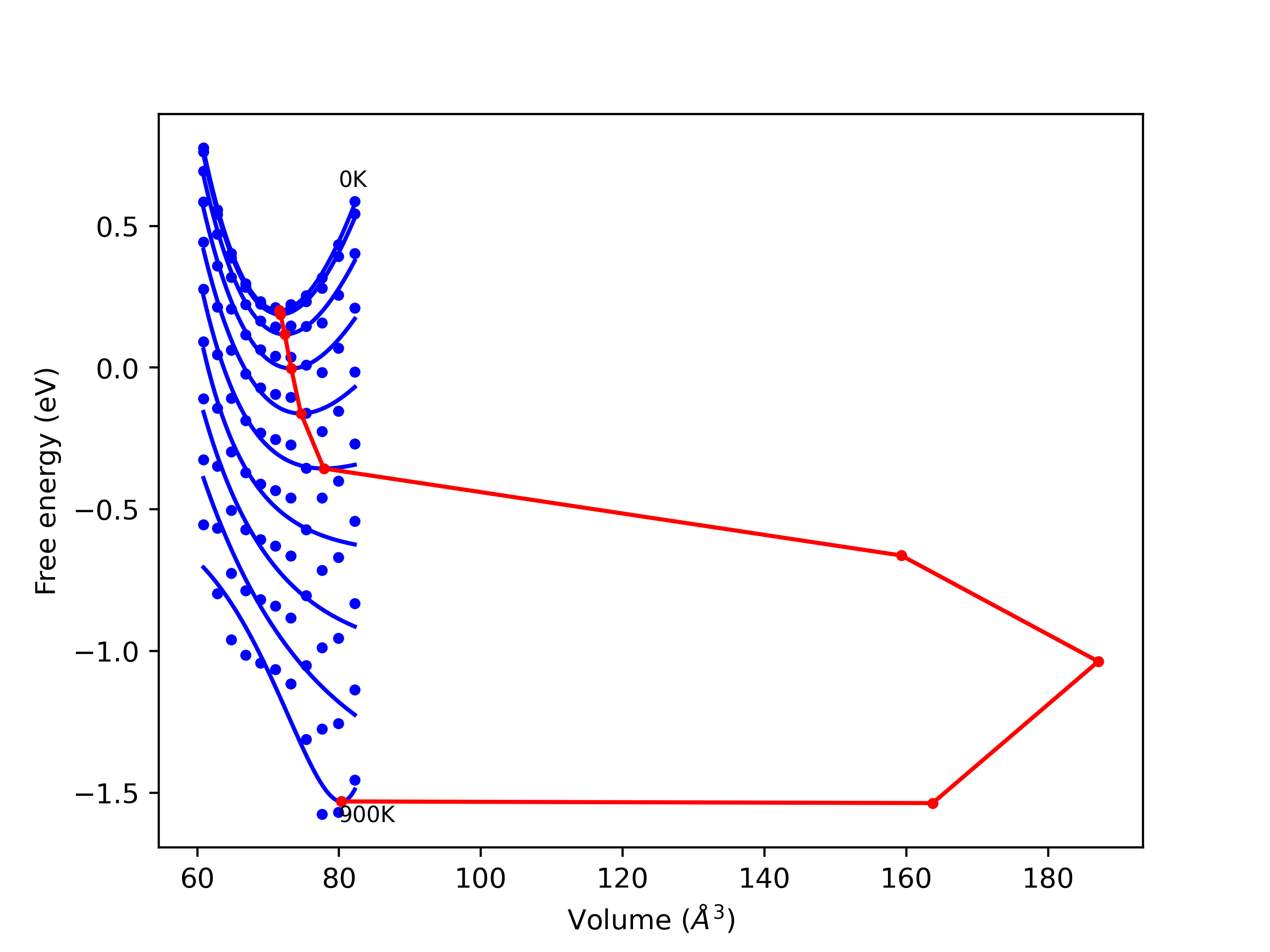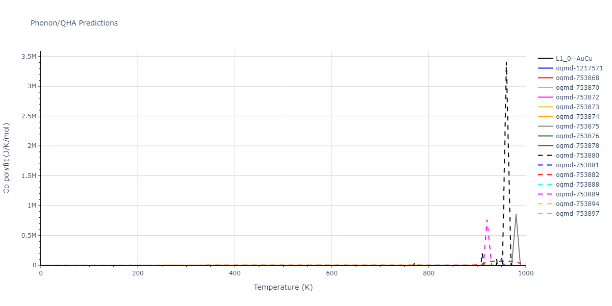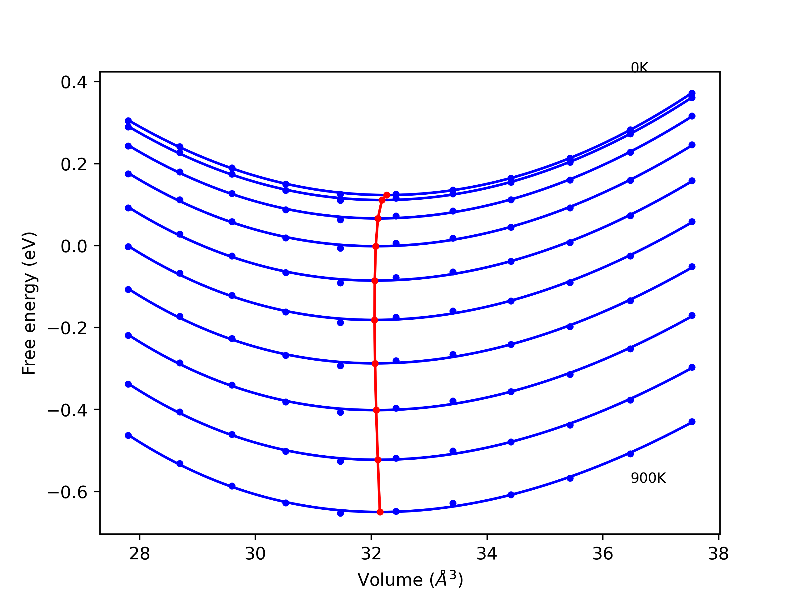 The Gibbs energies of the phases are estimated using thermodynamic integration between the interatomic potential in question and a simpler model with known Gibbs free energy values. For solids, the reference model is an Einstein solid, while for liquids it is the Uhlenbeck-Ford potential. Besides a short run at the start of the solid calculations to estimate Einstein model spring constants, the two calculations proceed similarly. Starting with the final relaxation configurations, the systems are stabilized for 25,000 steps. Then, over the next 50,000 steps the potential is swapped out for the reference potential. The system is then stabilized for another 25,000 steps with the reference model before a reverse swap of 50,000 steps is performed. The simulation ends with one final 25,000 step stabilization period. From the simulation, the irreversible work of transformation is estimated and used to compute the absolute Gibbs free energy of the target phase and potential relative to the reference potential. Entropy is estimated as the difference in enthalpy and Gibbs free energy and divided by temperature.