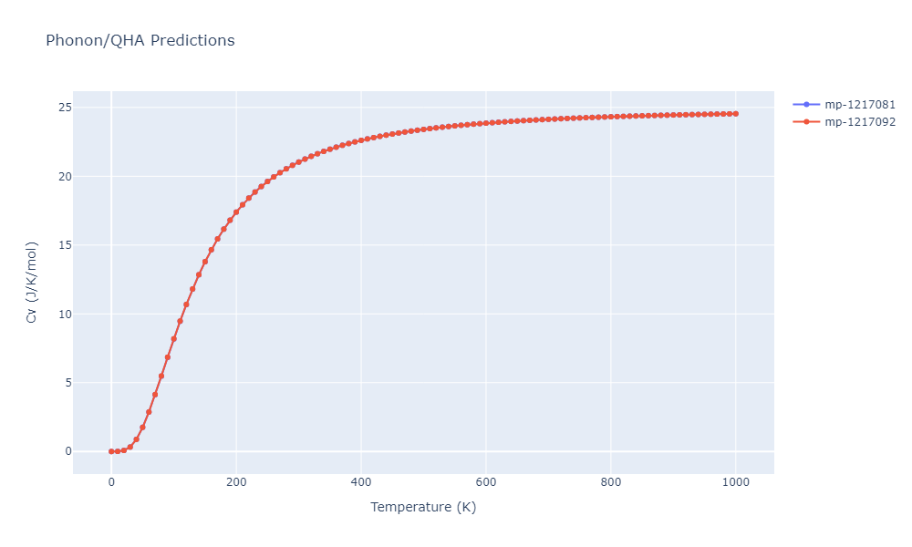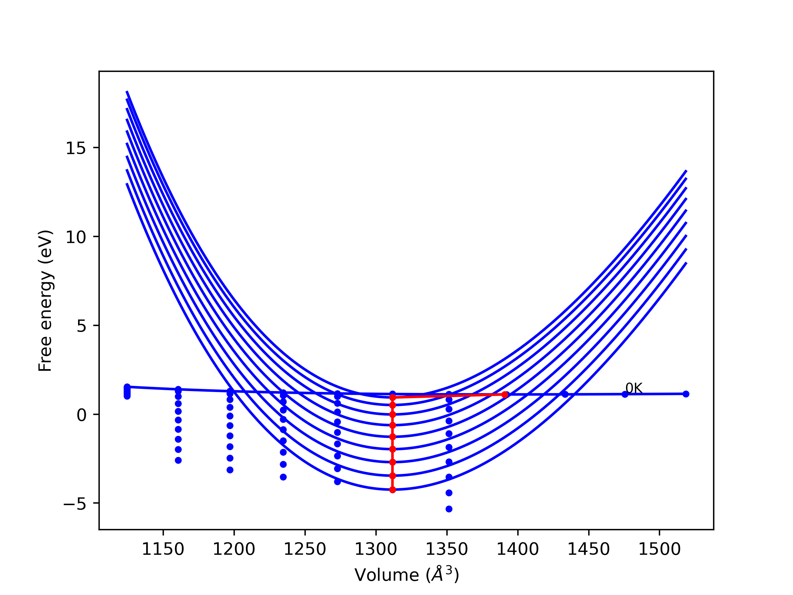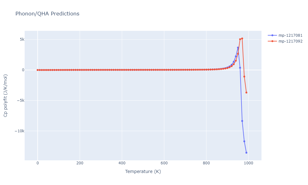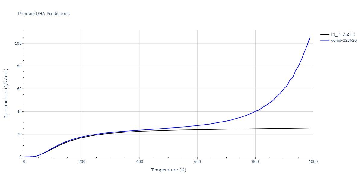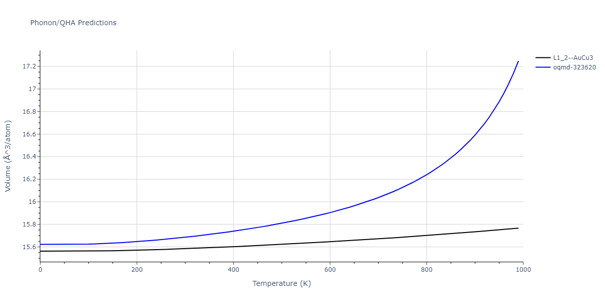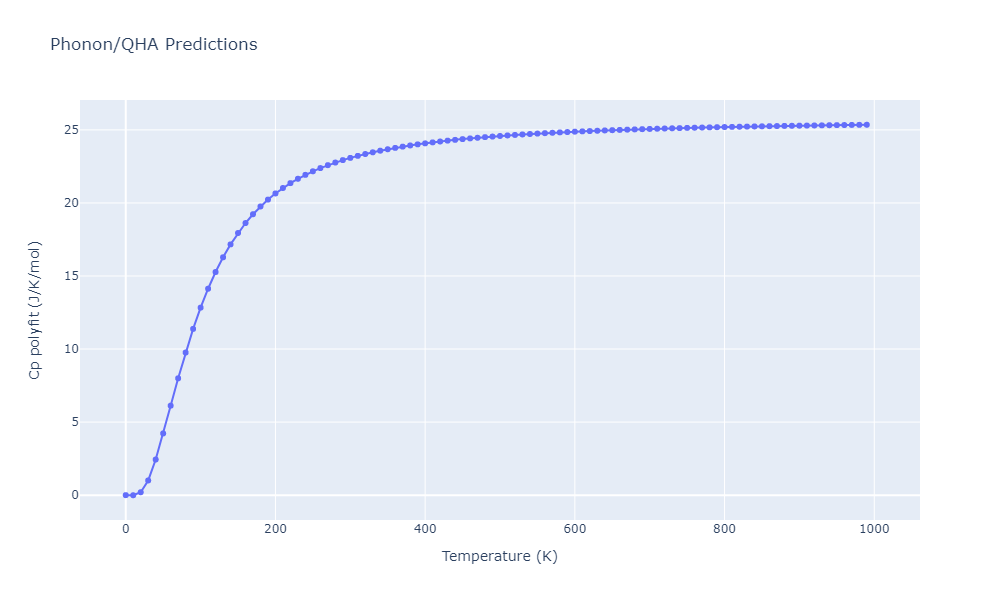 Plots of internal energy, Gibbs free energy, entropy, heat capacity and volume are shown here as a function of temperature for various crystal structures and liquid phases. The included crystal structures correspond to those in the Solid Structures vs. Temperature section, and the liquid phases to those in the Liquid Properties section. Internal energy and volume are taken from the associated structure relaxations mentioned in those previous sections. Constant pressure heat capacity is estimated using 3-point numerical derivatives of enthalpy versus temperature. Note that since all simulations done here are at 0 pressure, internal energy and enthalpy are equivalent.