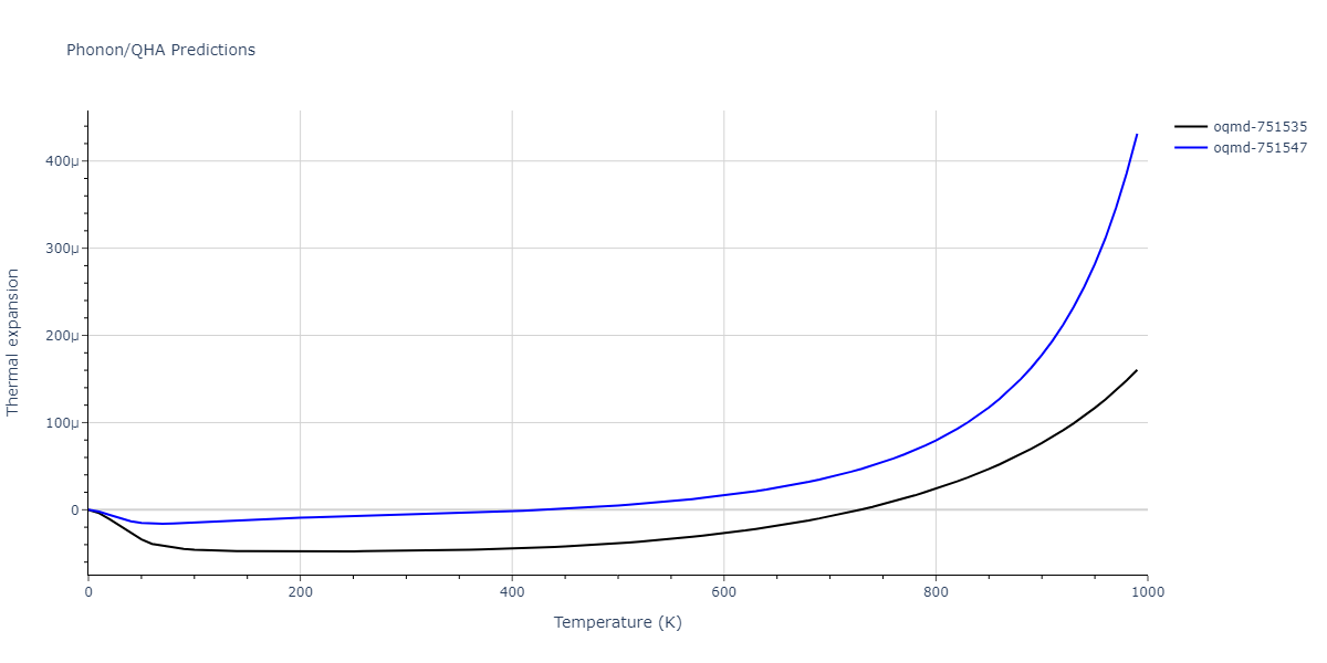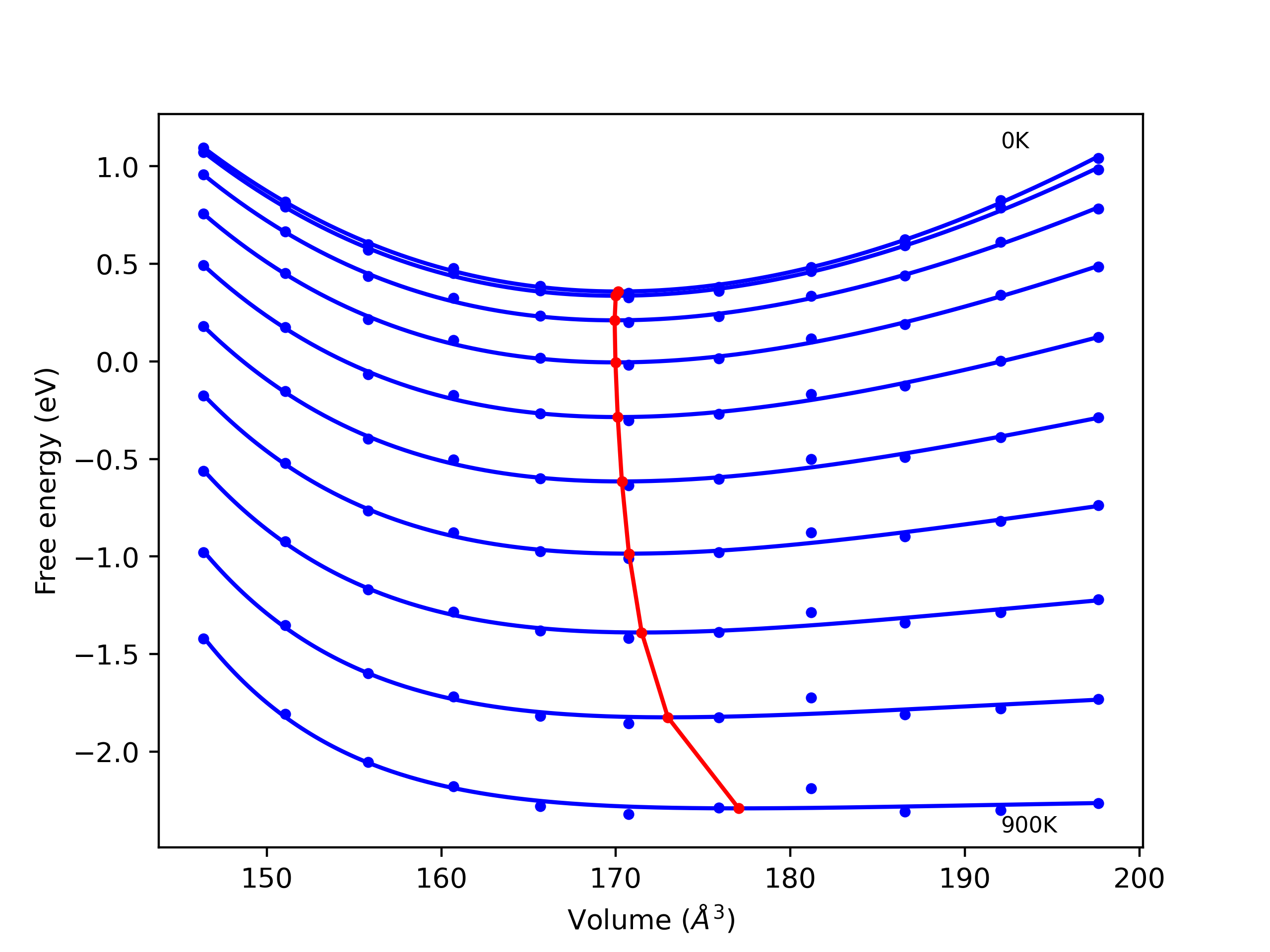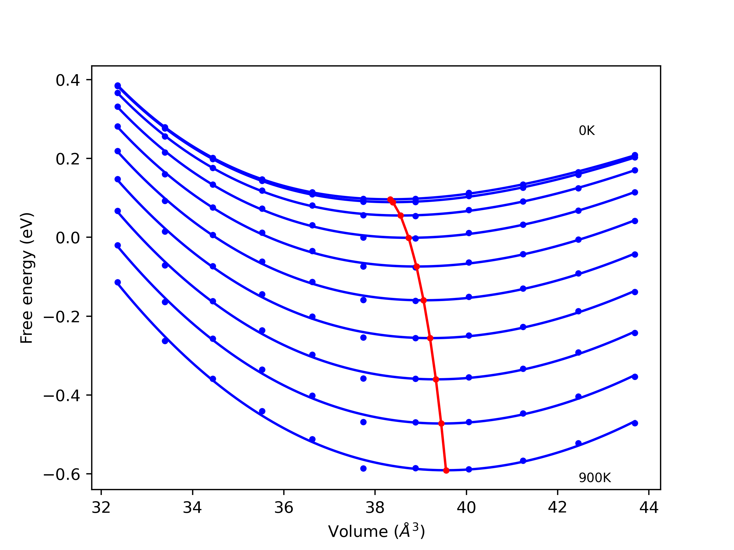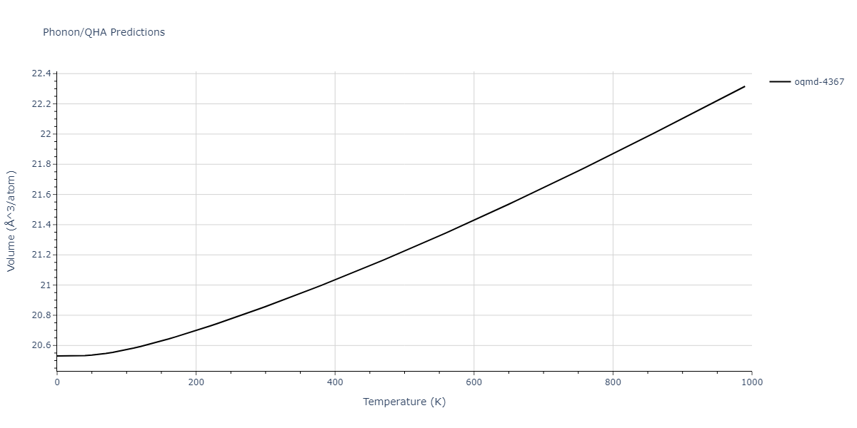 Plots of lattice and elastic constants are shown as a function of temperature. The 0K points were taken from the Crystal Structure Predictions and the Elastic Constants Predictions sections above for the unique crystal structures relaxed with the "dynamic" method. Starting from the 0 K relaxed crystal unit cells, supercell systems are created by replicating all three dimensions by the same multiplier to achieve at least 4000 atoms. The systems are then relaxed at 50 K and zero pressure using 1 million NPT steps. Lattice constants are estimated by averaging the measured box dimensions. Temperatures are iteratively increased by 50 K, with each subsequent relaxation calculation starting from the final atomic configuration at the previous temperature and relaxing for another 1 million steps.