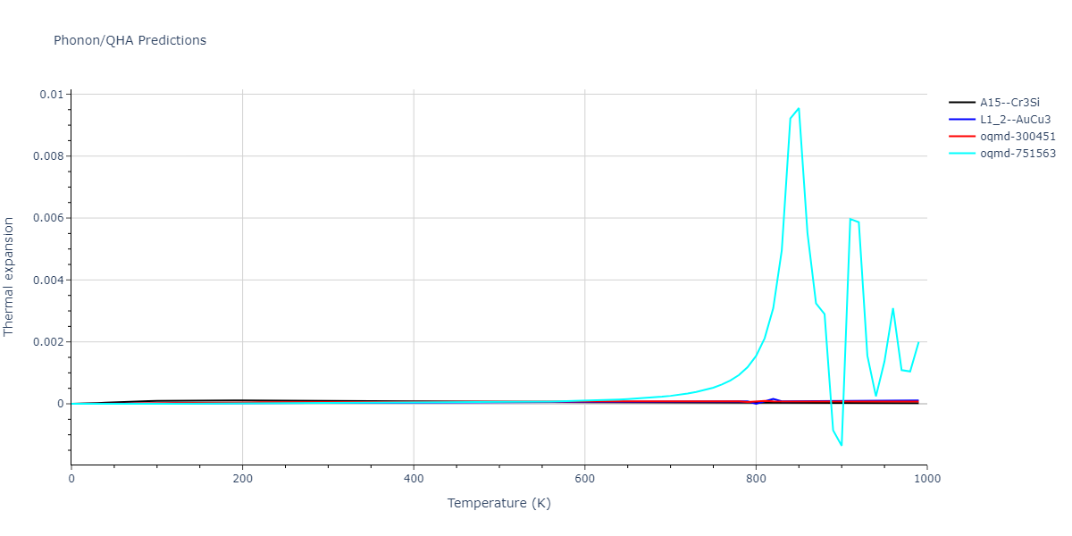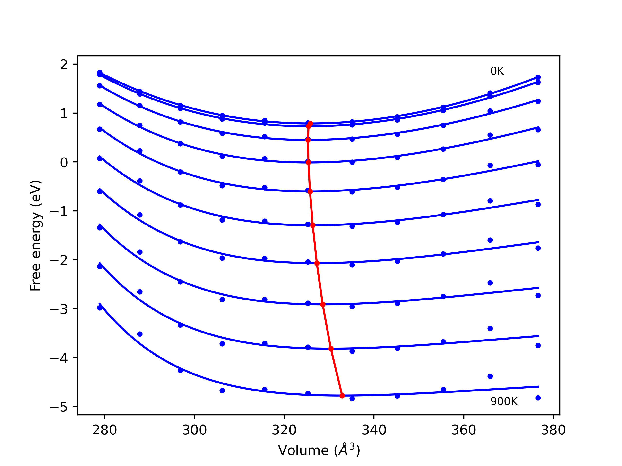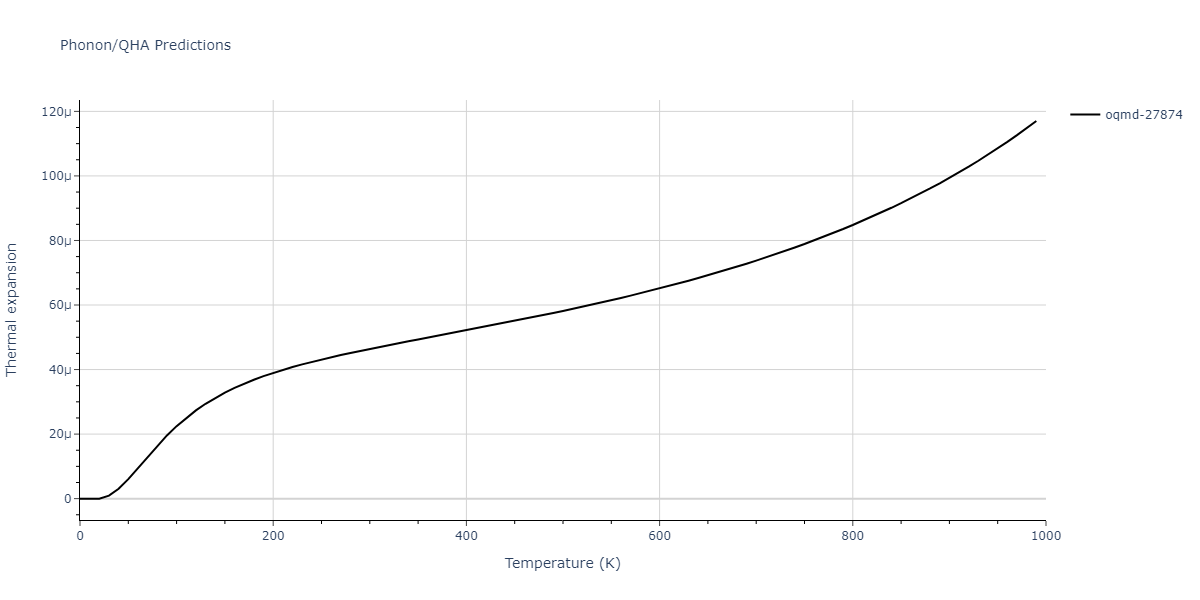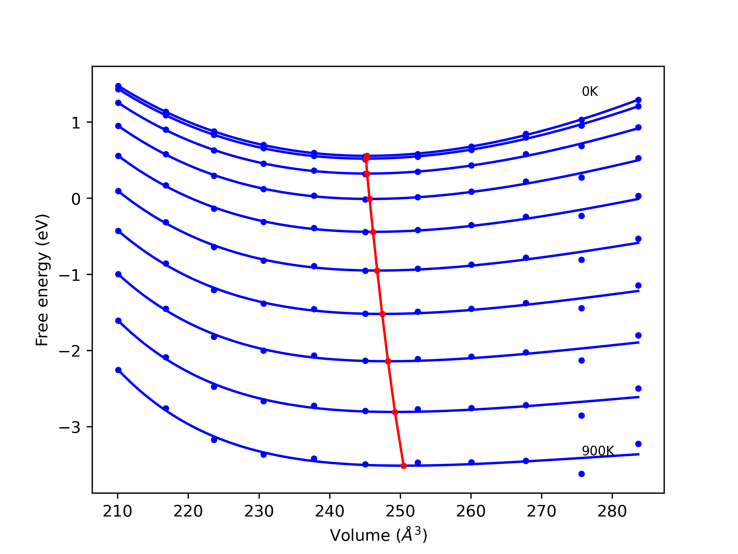 Plots of lattice and elastic constants are shown as a function of temperature. The 0K points were taken from the Crystal Structure Predictions and the Elastic Constants Predictions sections above for the unique crystal structures relaxed with the "dynamic" method. Starting from the 0 K relaxed crystal unit cells, supercell systems are created by replicating all three dimensions by the same multiplier to achieve at least 4000 atoms. The systems are then relaxed at 50 K and zero pressure using 1 million NPT steps. Lattice constants are estimated by averaging the measured box dimensions. Temperatures are iteratively increased by 50 K, with each subsequent relaxation calculation starting from the final atomic configuration at the previous temperature and relaxing for another 1 million steps.