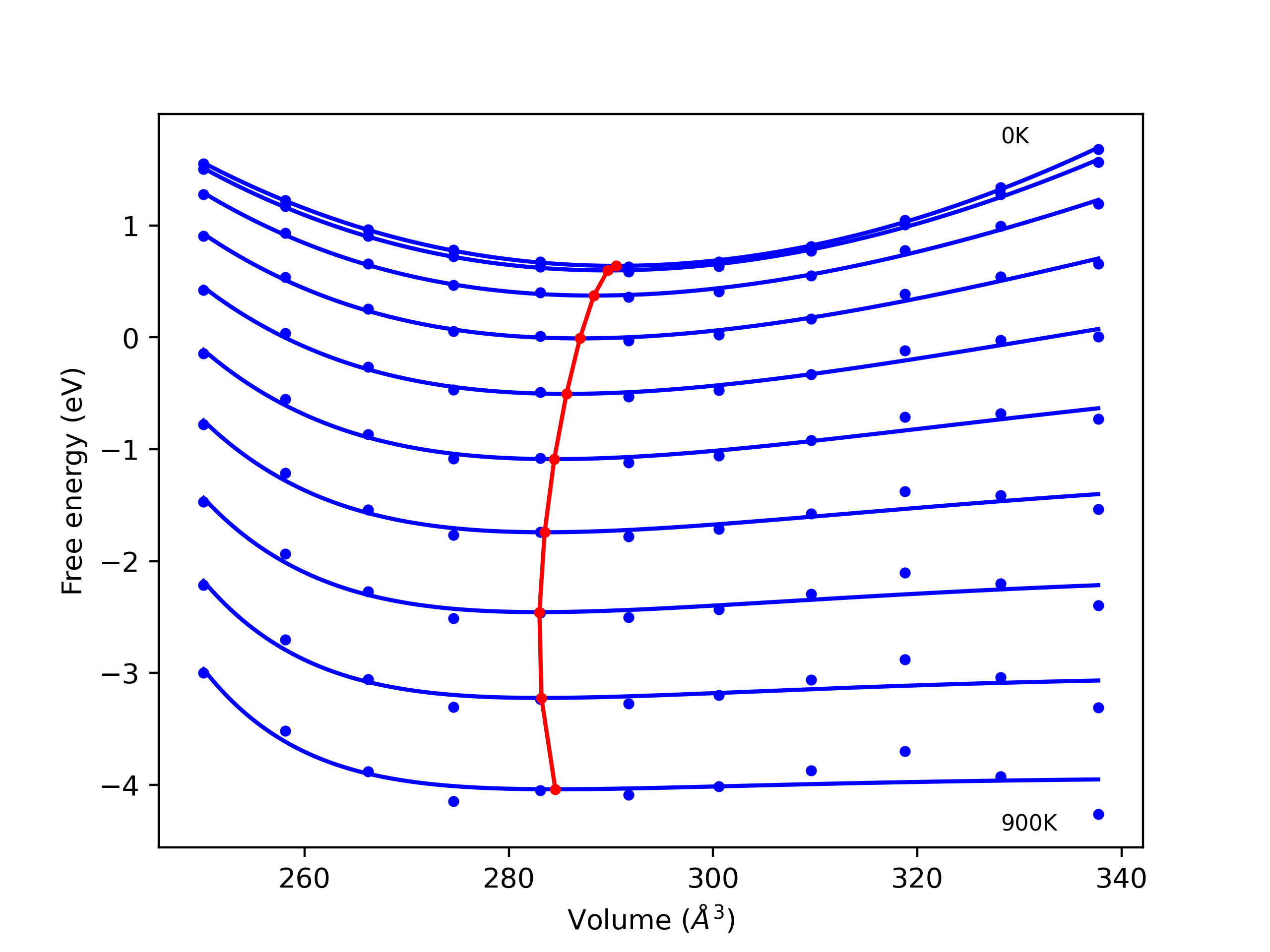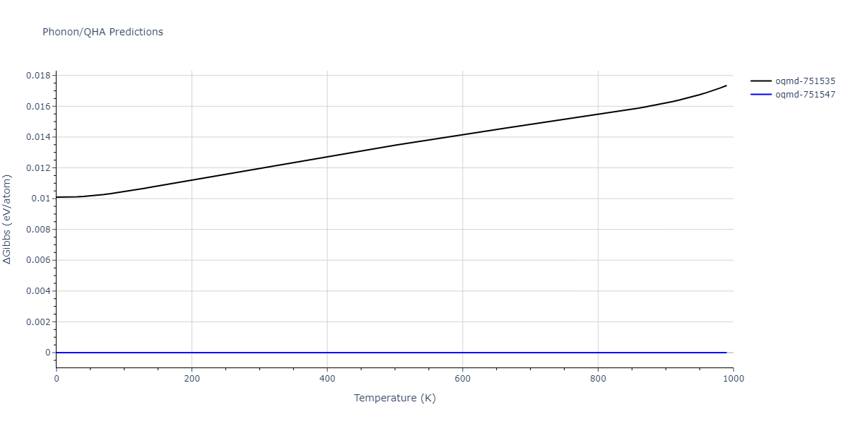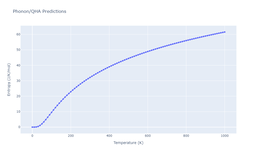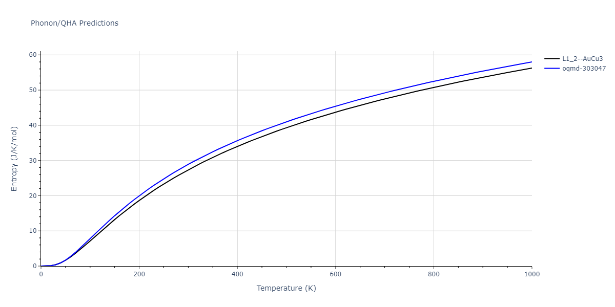 The Gibbs energies of the phases are estimated using thermodynamic integration between the interatomic potential in question and a simpler model with known Gibbs free energy values. For solids, the reference model is an Einstein solid, while for liquids it is the Uhlenbeck-Ford potential. Besides a short run at the start of the solid calculations to estimate Einstein model spring constants, the two calculations proceed similarly. Starting with the final relaxation configurations, the systems are stabilized for 25,000 steps. Then, over the next 50,000 steps the potential is swapped out for the reference potential. The system is then stabilized for another 25,000 steps with the reference model before a reverse swap of 50,000 steps is performed. The simulation ends with one final 25,000 step stabilization period. From the simulation, the irreversible work of transformation is estimated and used to compute the absolute Gibbs free energy of the target phase and potential relative to the reference potential. Entropy is estimated as the difference in enthalpy and Gibbs free energy and divided by temperature.