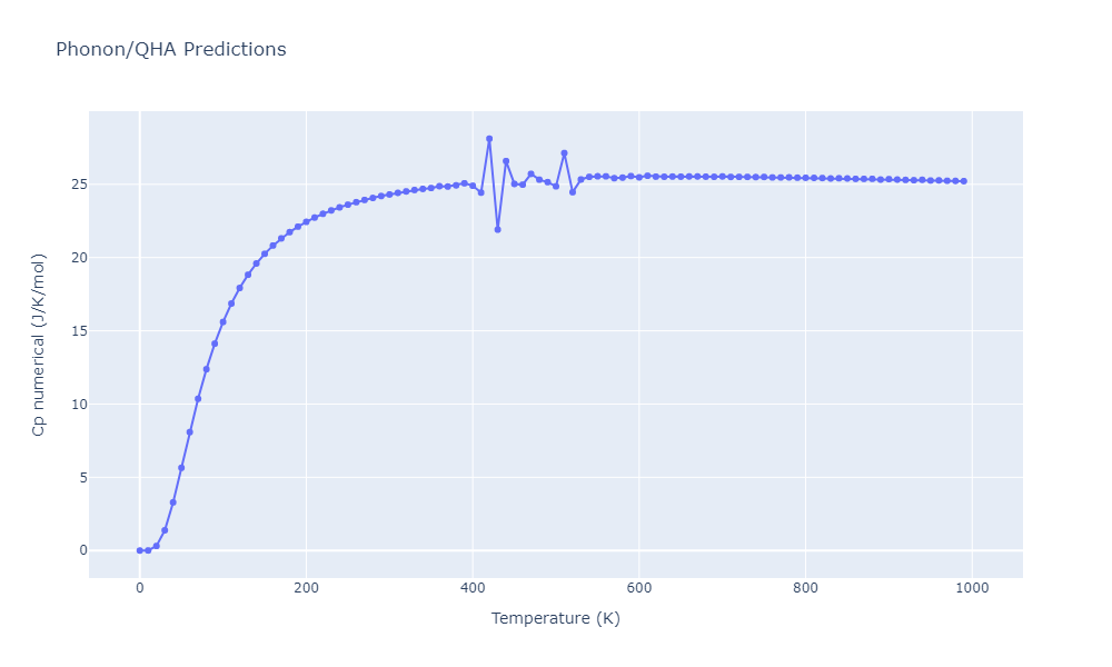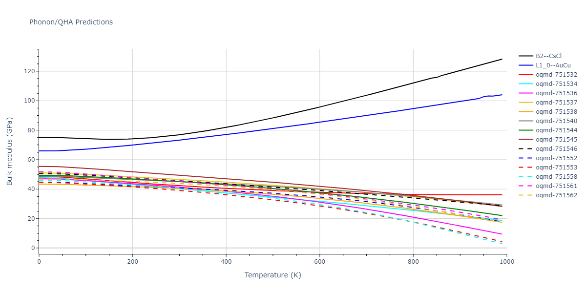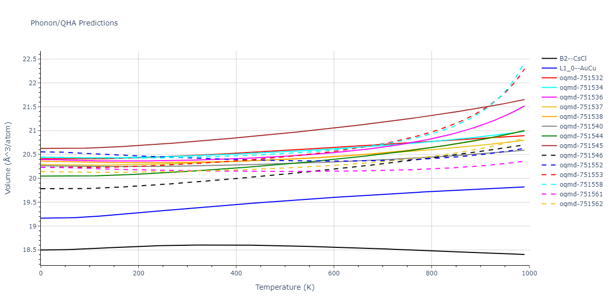 Plots of internal energy, Gibbs free energy, entropy, heat capacity and volume are shown here as a function of temperature for various crystal structures and liquid phases. The included crystal structures correspond to those in the Solid Structures vs. Temperature section, and the liquid phases to those in the Liquid Properties section. Internal energy and volume are taken from the associated structure relaxations mentioned in those previous sections. Constant pressure heat capacity is estimated using 3-point numerical derivatives of enthalpy versus temperature. Note that since all simulations done here are at 0 pressure, internal energy and enthalpy are equivalent.