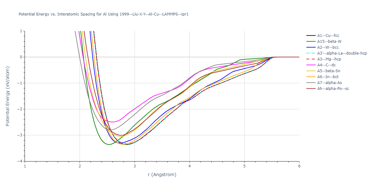 Plots of potential energy vs interatomic spacing, r, are shown below for a number of crystal structures. The structures are generated based on the ideal atomic positions and b/a and c/a lattice parameter ratios for a given crystal prototype. The size of the system is then uniformly scaled, and the energy calculated without relaxing the system. To obtain these plots, values of r are evaluated every 0.02 Å up to 6 Å.