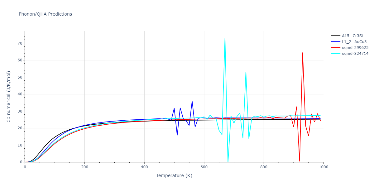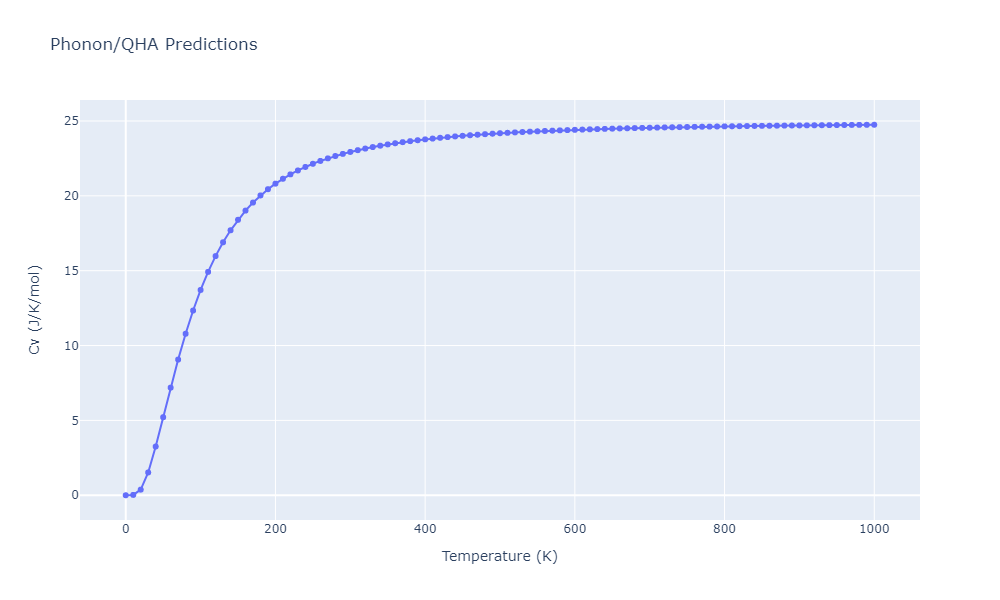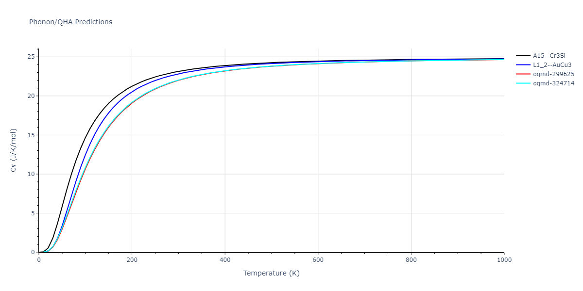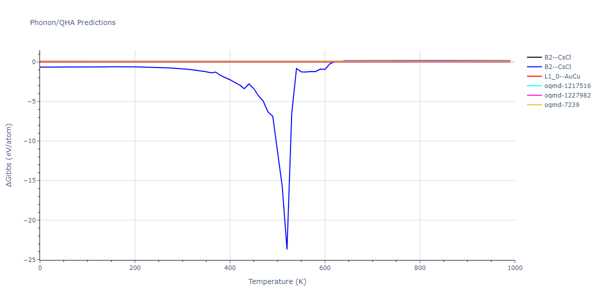 Plots of internal energy, Gibbs free energy, entropy, heat capacity and volume are shown here as a function of temperature for various crystal structures and liquid phases. The included crystal structures correspond to those in the Solid Structures vs. Temperature section, and the liquid phases to those in the Liquid Properties section. Internal energy and volume are taken from the associated structure relaxations mentioned in those previous sections. Constant pressure heat capacity is estimated using 3-point numerical derivatives of enthalpy versus temperature. Note that since all simulations done here are at 0 pressure, internal energy and enthalpy are equivalent.