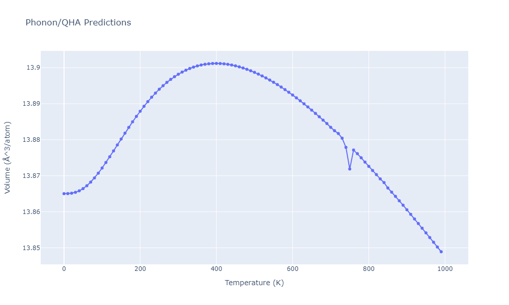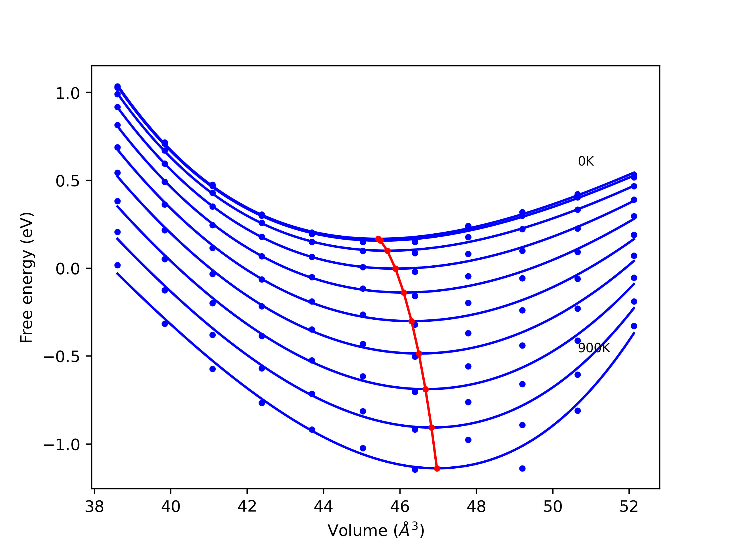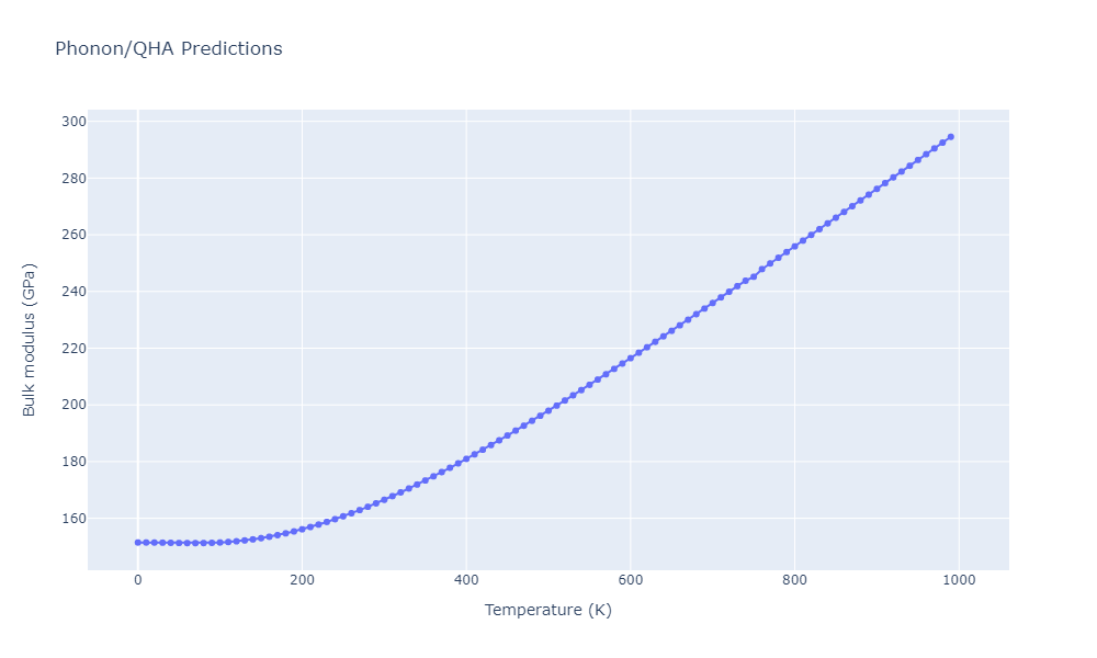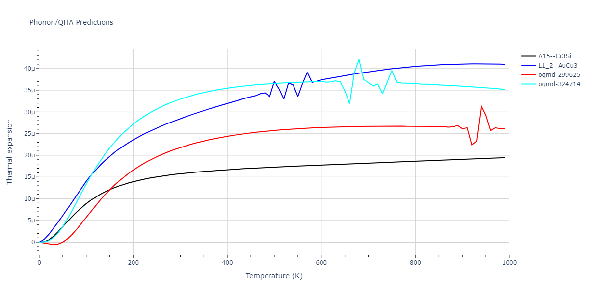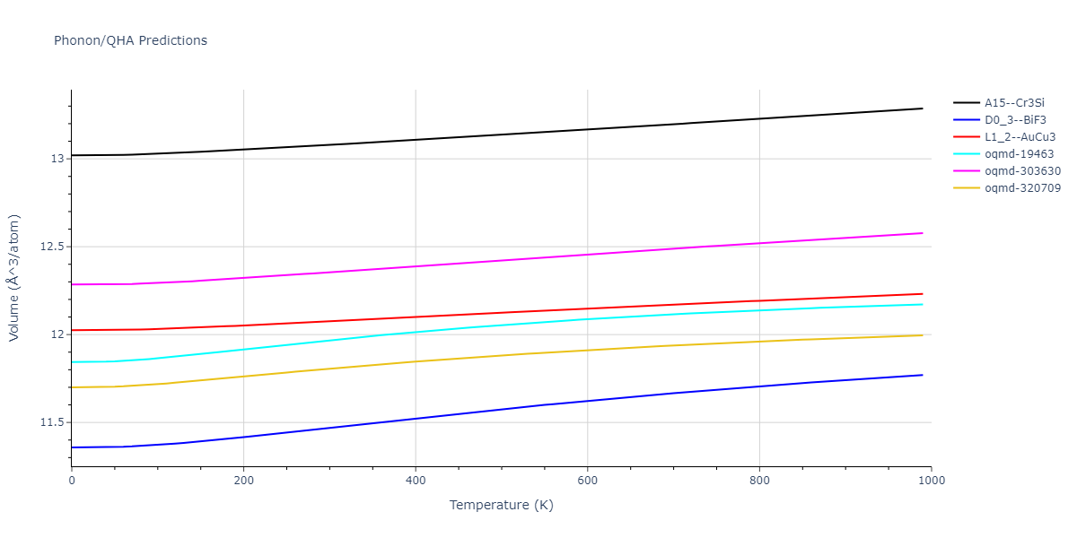 Plots of lattice and elastic constants are shown as a function of temperature. The 0K points were taken from the Crystal Structure Predictions and the Elastic Constants Predictions sections above for the unique crystal structures relaxed with the "dynamic" method. Starting from the 0 K relaxed crystal unit cells, supercell systems are created by replicating all three dimensions by the same multiplier to achieve at least 4000 atoms. The systems are then relaxed at 50 K and zero pressure using 1 million NPT steps. Lattice constants are estimated by averaging the measured box dimensions. Temperatures are iteratively increased by 50 K, with each subsequent relaxation calculation starting from the final atomic configuration at the previous temperature and relaxing for another 1 million steps.