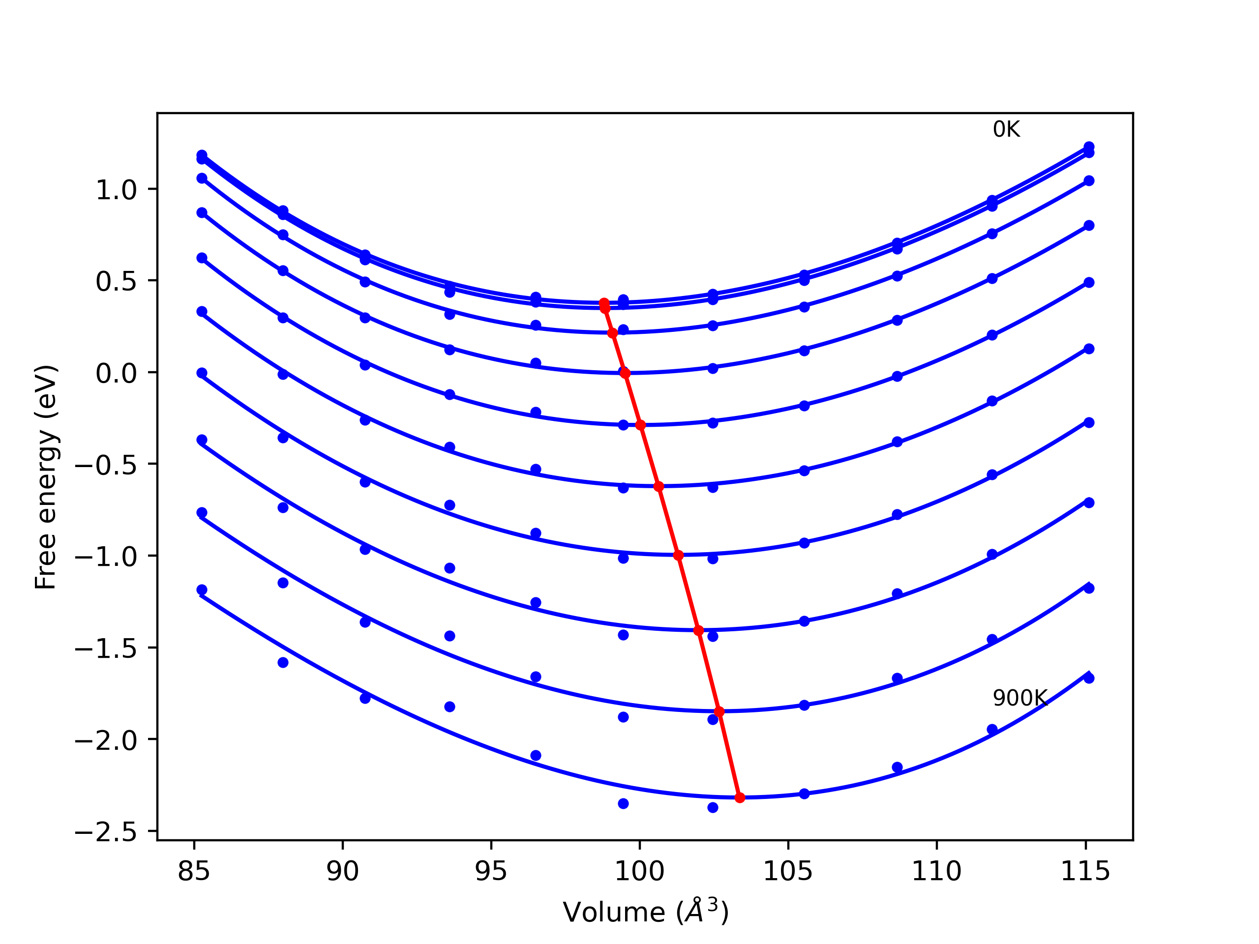 The Gibbs energies of the phases are estimated using thermodynamic integration between the interatomic potential in question and a simpler model with known Gibbs free energy values. For solids, the reference model is an Einstein solid, while for liquids it is the Uhlenbeck-Ford potential. Besides a short run at the start of the solid calculations to estimate Einstein model spring constants, the two calculations proceed similarly. Starting with the final relaxation configurations, the systems are stabilized for 25,000 steps. Then, over the next 50,000 steps the potential is swapped out for the reference potential. The system is then stabilized for another 25,000 steps with the reference model before a reverse swap of 50,000 steps is performed. The simulation ends with one final 25,000 step stabilization period. From the simulation, the irreversible work of transformation is estimated and used to compute the absolute Gibbs free energy of the target phase and potential relative to the reference potential. Entropy is estimated as the difference in enthalpy and Gibbs free energy and divided by temperature.