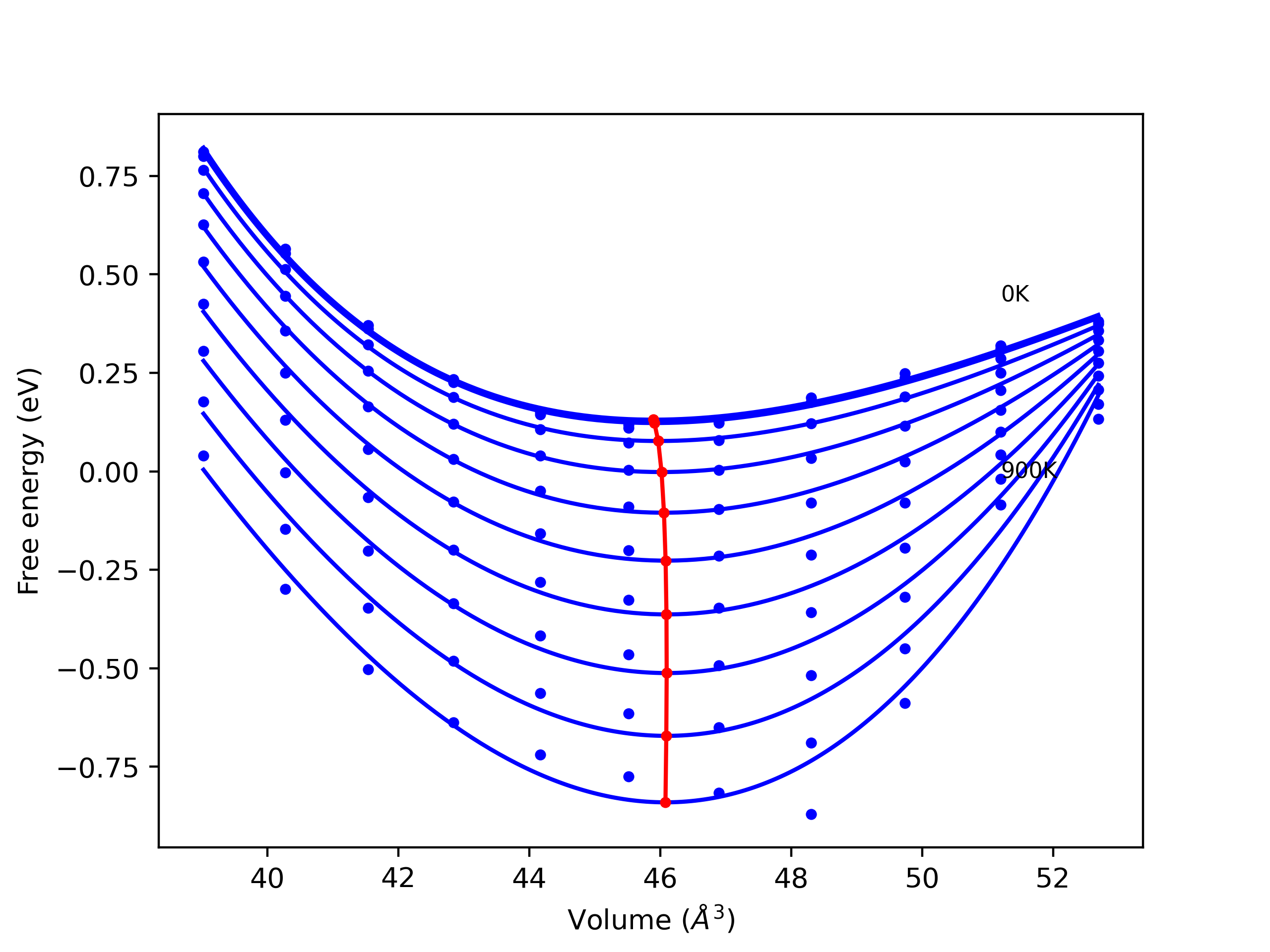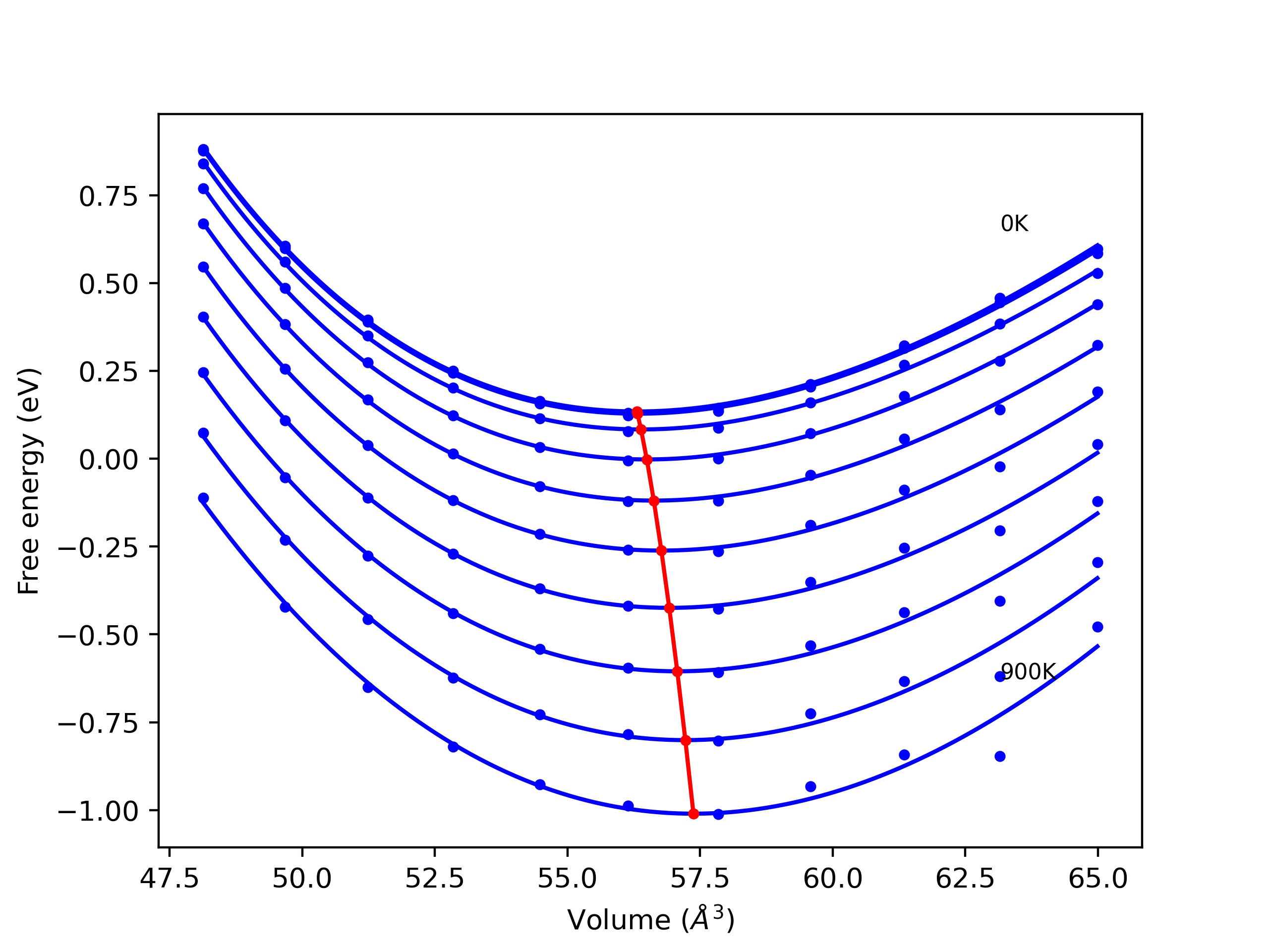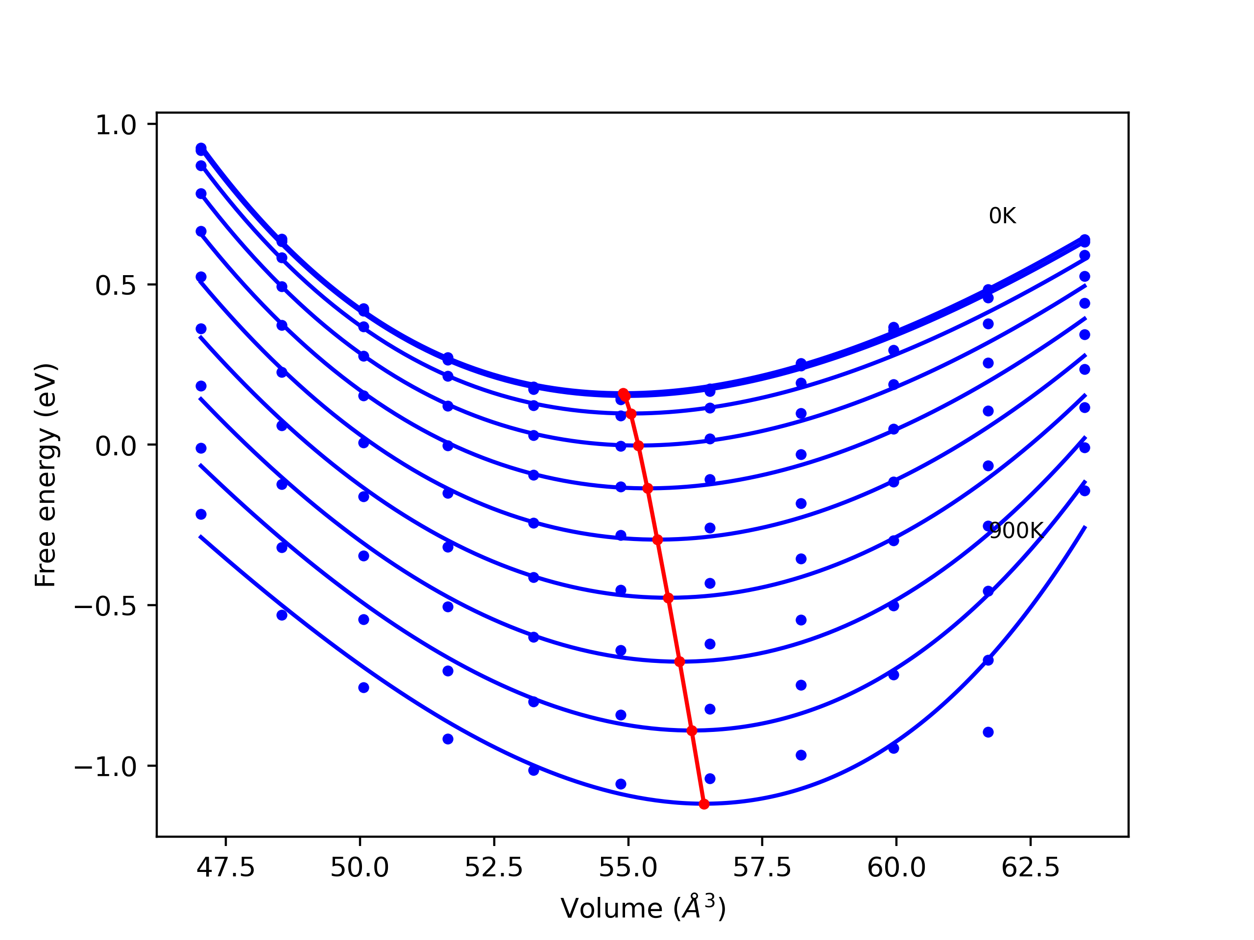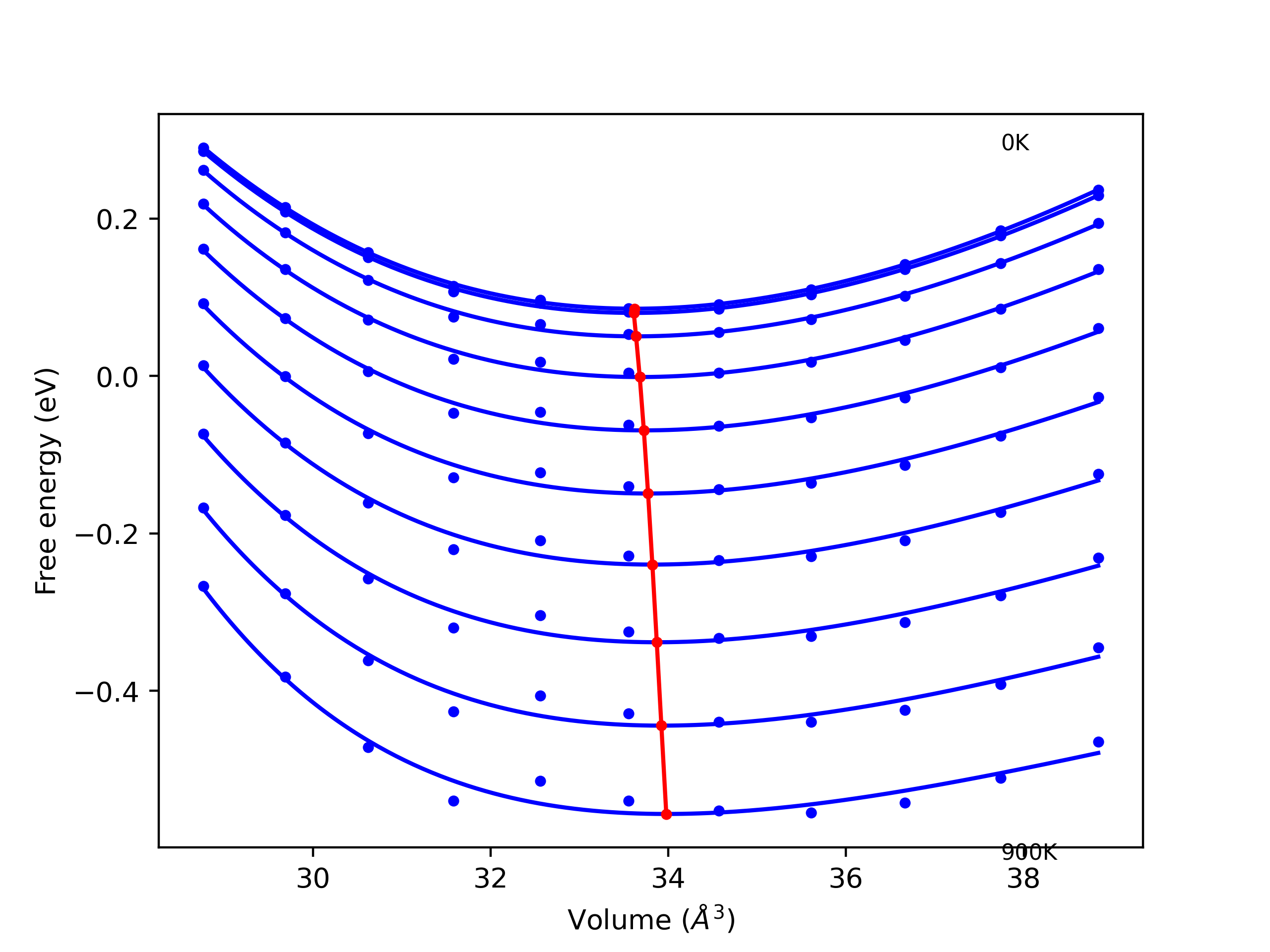 The Gibbs energies of the phases are estimated using thermodynamic integration between the interatomic potential in question and a simpler model with known Gibbs free energy values. For solids, the reference model is an Einstein solid, while for liquids it is the Uhlenbeck-Ford potential. Besides a short run at the start of the solid calculations to estimate Einstein model spring constants, the two calculations proceed similarly. Starting with the final relaxation configurations, the systems are stabilized for 25,000 steps. Then, over the next 50,000 steps the potential is swapped out for the reference potential. The system is then stabilized for another 25,000 steps with the reference model before a reverse swap of 50,000 steps is performed. The simulation ends with one final 25,000 step stabilization period. From the simulation, the irreversible work of transformation is estimated and used to compute the absolute Gibbs free energy of the target phase and potential relative to the reference potential. Entropy is estimated as the difference in enthalpy and Gibbs free energy and divided by temperature.