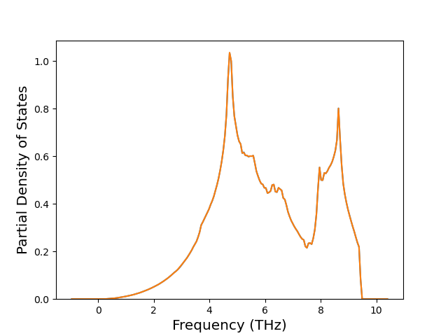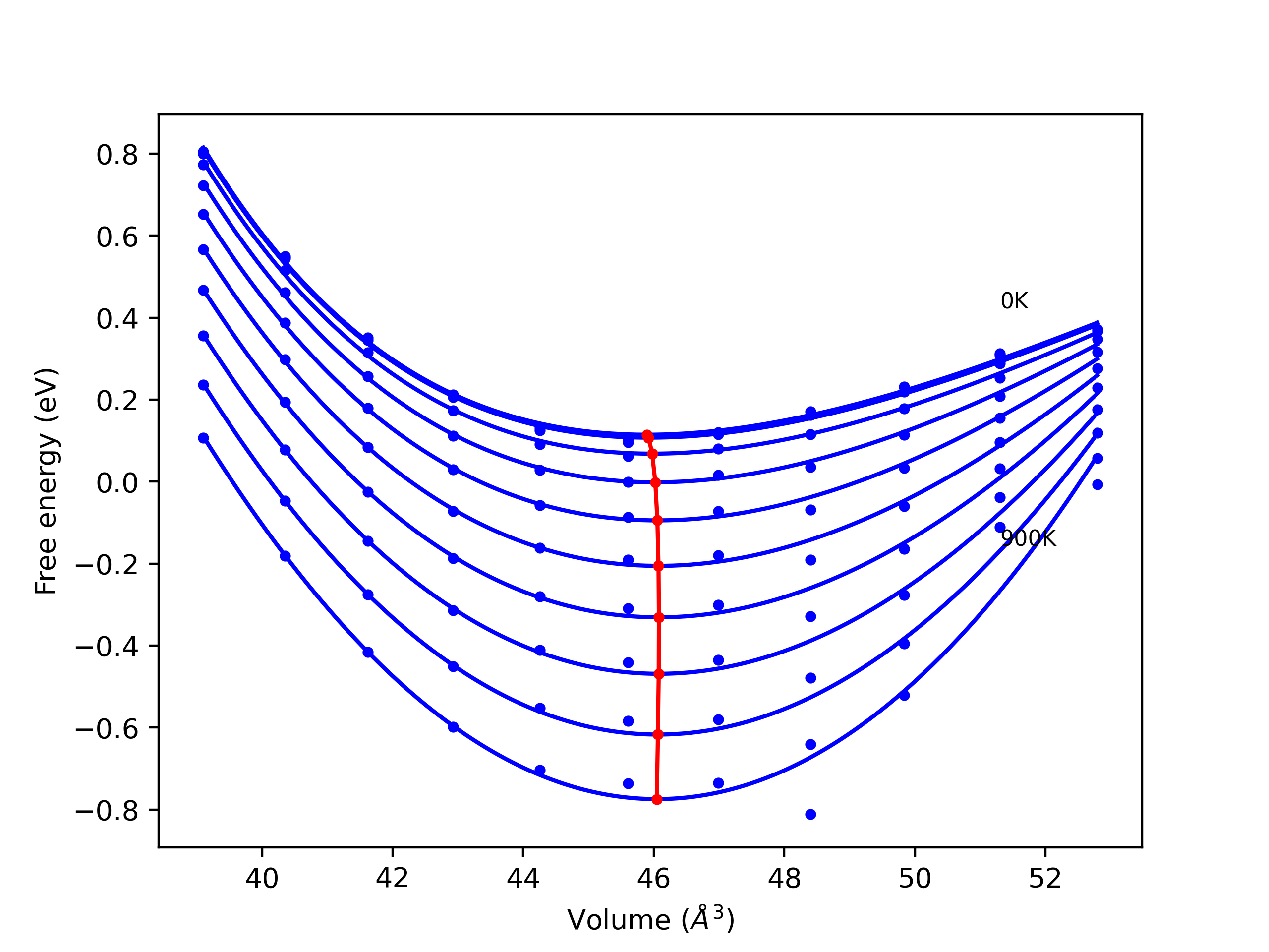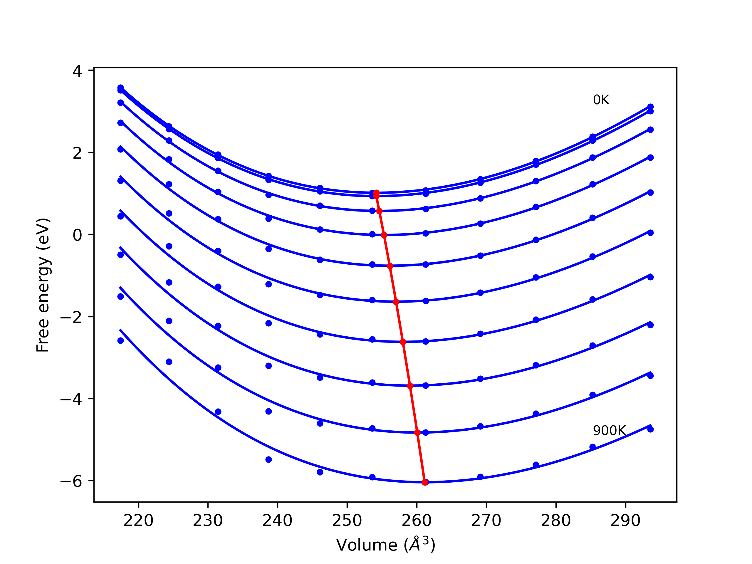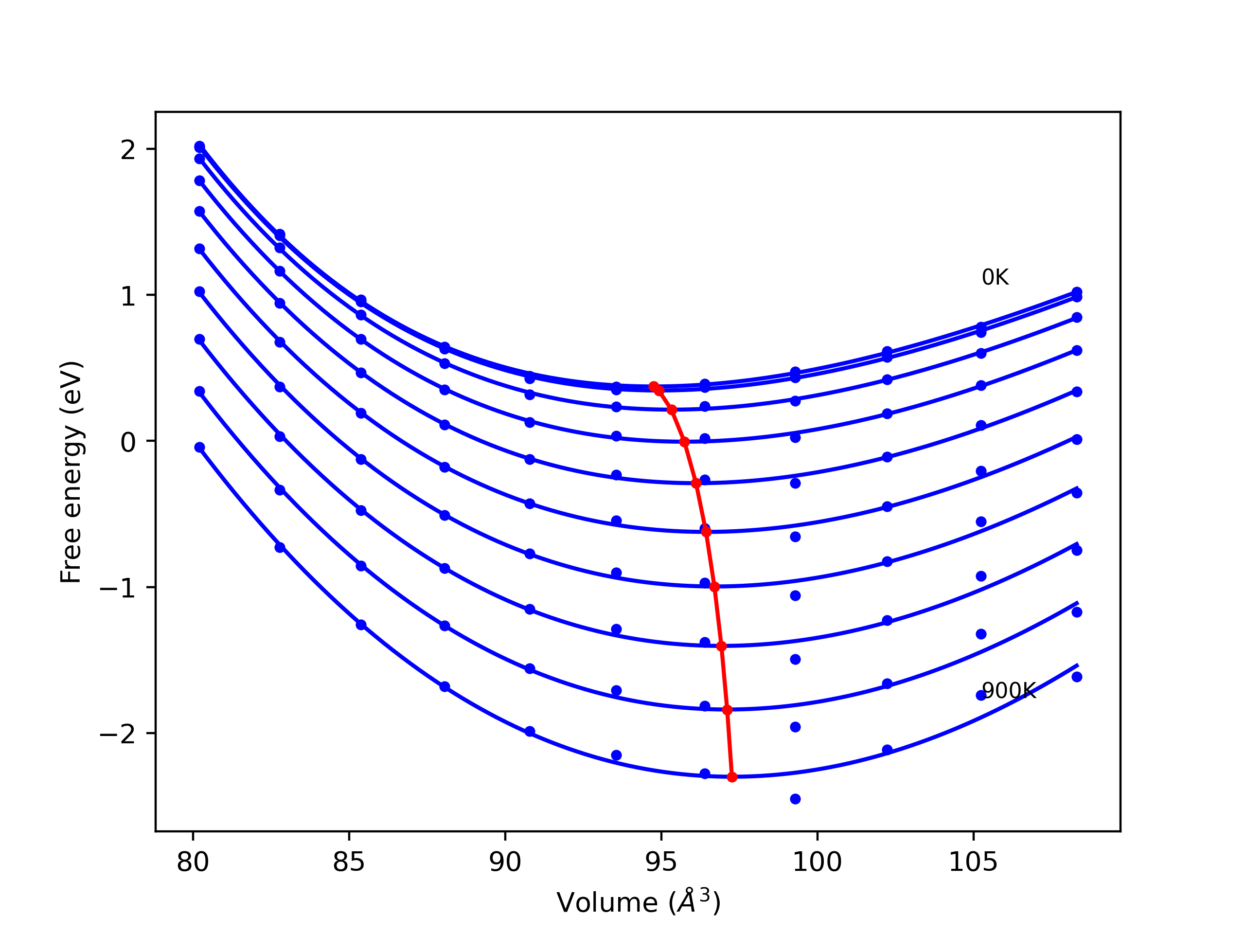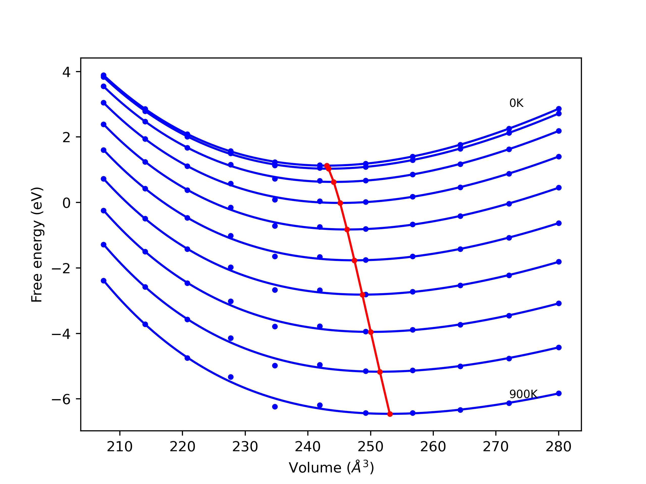 The Gibbs energies of the phases are estimated using thermodynamic integration between the interatomic potential in question and a simpler model with known Gibbs free energy values. For solids, the reference model is an Einstein solid, while for liquids it is the Uhlenbeck-Ford potential. Besides a short run at the start of the solid calculations to estimate Einstein model spring constants, the two calculations proceed similarly. Starting with the final relaxation configurations, the systems are stabilized for 25,000 steps. Then, over the next 50,000 steps the potential is swapped out for the reference potential. The system is then stabilized for another 25,000 steps with the reference model before a reverse swap of 50,000 steps is performed. The simulation ends with one final 25,000 step stabilization period. From the simulation, the irreversible work of transformation is estimated and used to compute the absolute Gibbs free energy of the target phase and potential relative to the reference potential. Entropy is estimated as the difference in enthalpy and Gibbs free energy and divided by temperature.