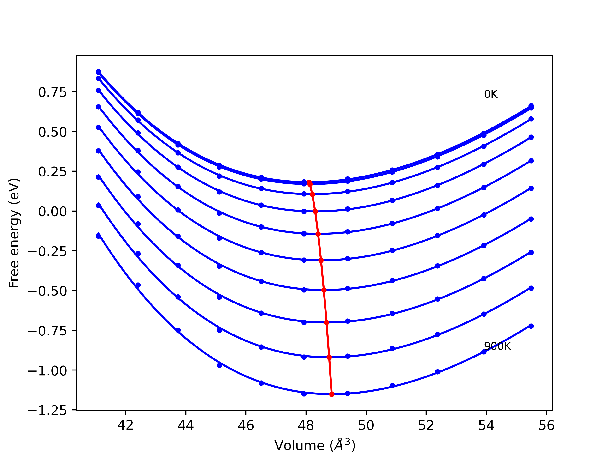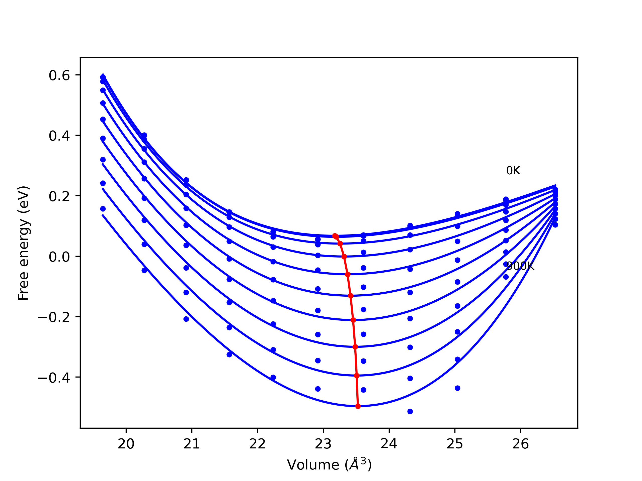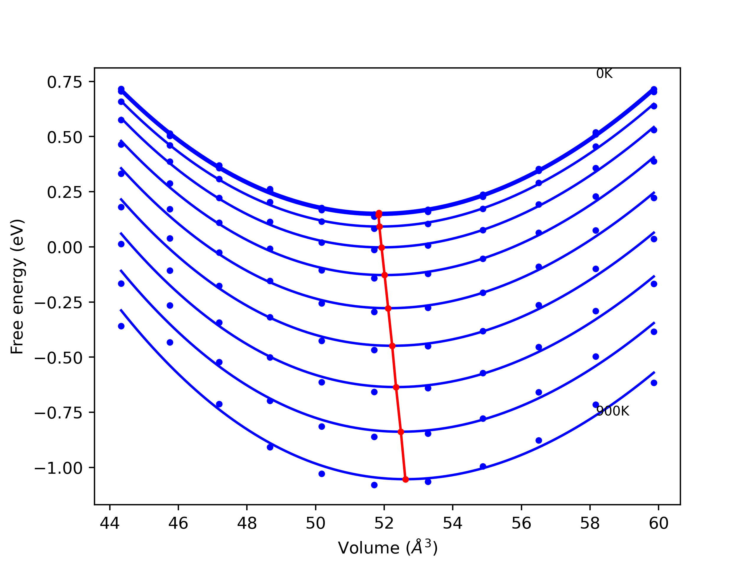 Plots of lattice and elastic constants are shown as a function of temperature. The 0K points were taken from the Crystal Structure Predictions and the Elastic Constants Predictions sections above for the unique crystal structures relaxed with the "dynamic" method. Starting from the 0 K relaxed crystal unit cells, supercell systems are created by replicating all three dimensions by the same multiplier to achieve at least 4000 atoms. The systems are then relaxed at 50 K and zero pressure using 1 million NPT steps. Lattice constants are estimated by averaging the measured box dimensions. Temperatures are iteratively increased by 50 K, with each subsequent relaxation calculation starting from the final atomic configuration at the previous temperature and relaxing for another 1 million steps.