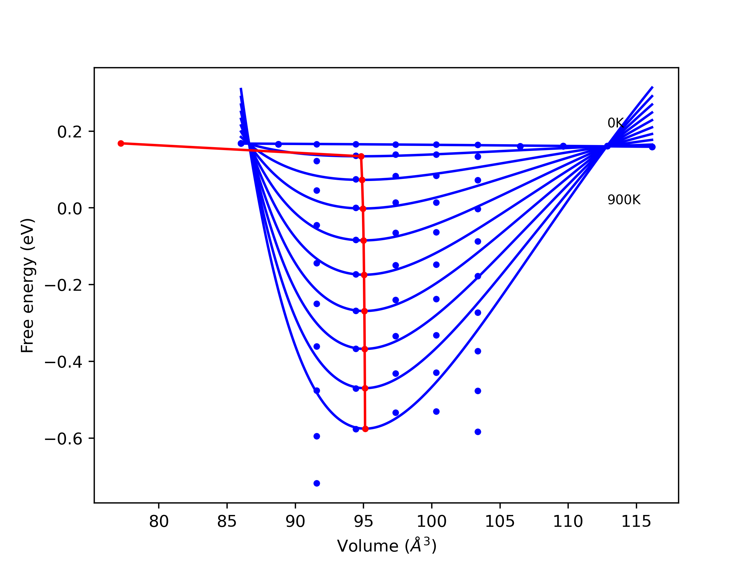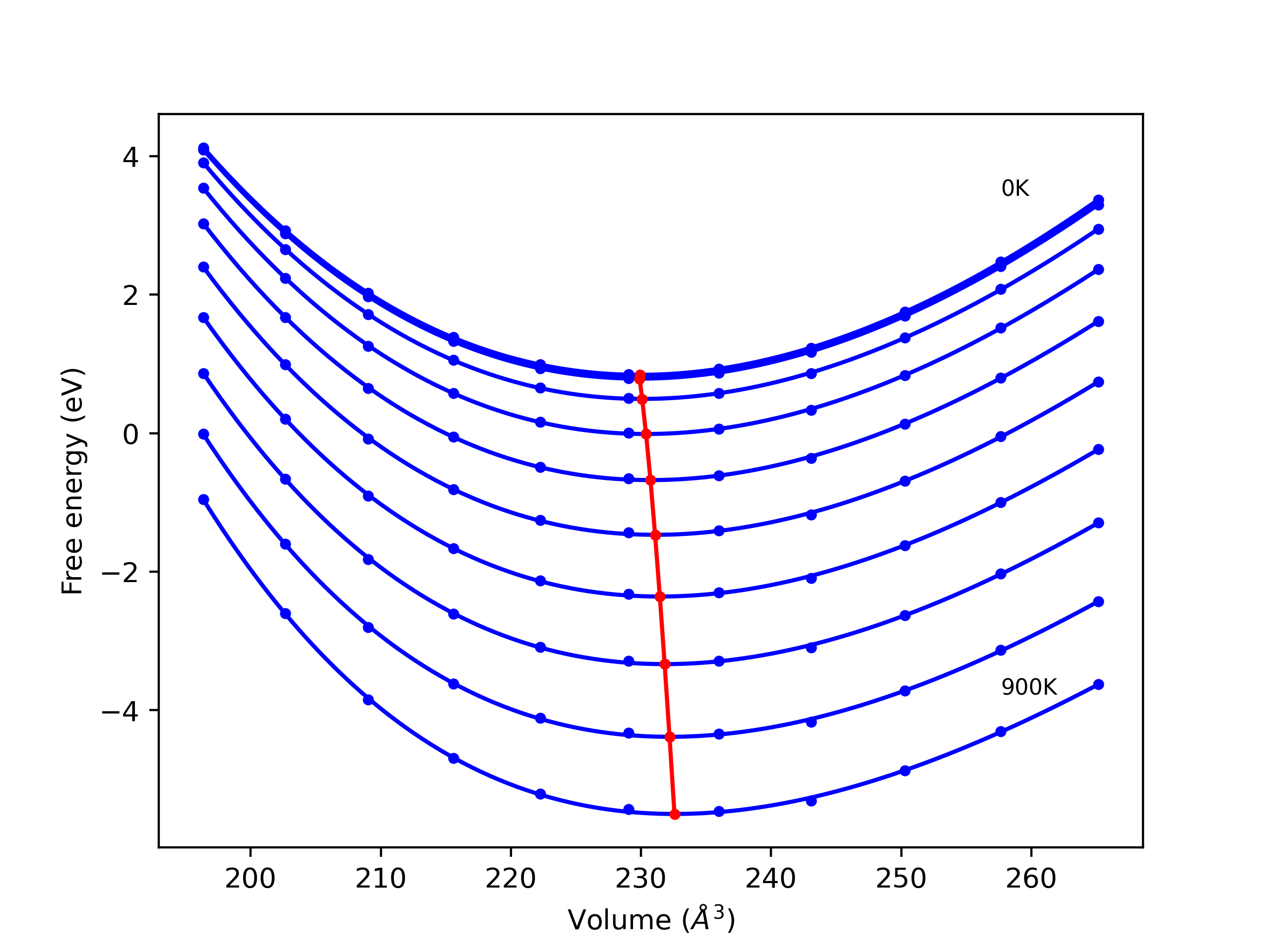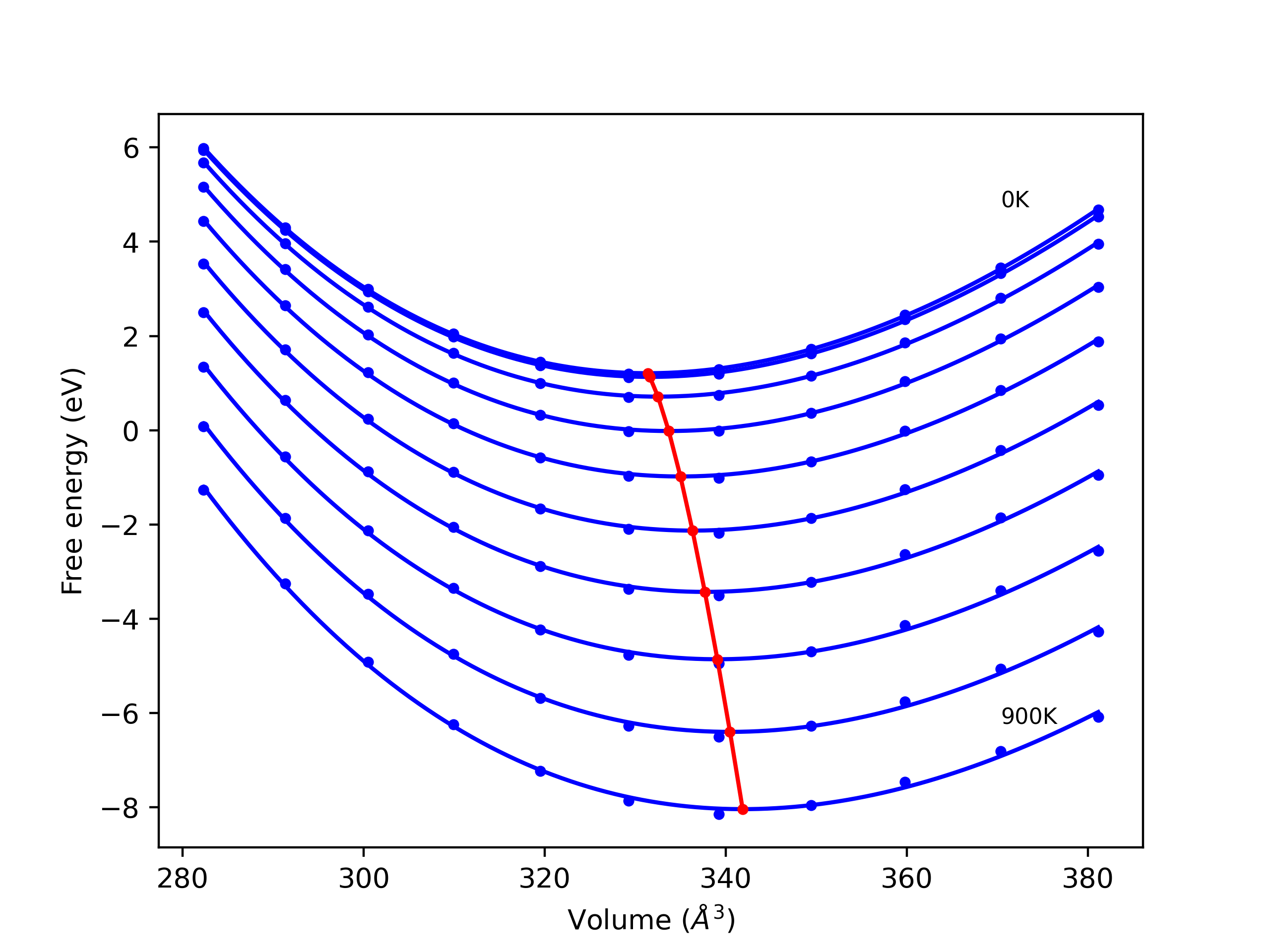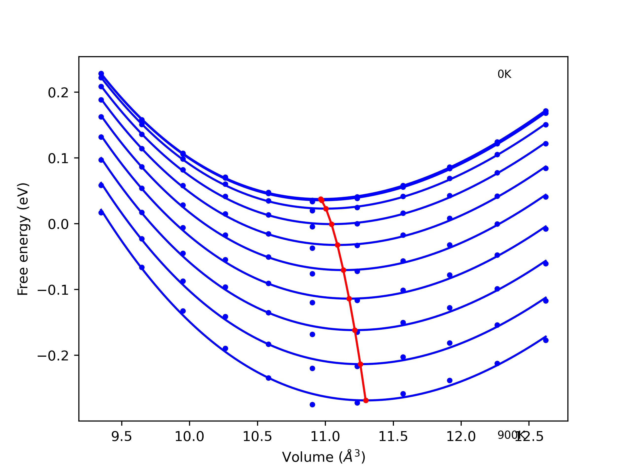 Phonon band structures and crystal properties estimated from quasi-harmonic approximation (QHA) calculations are displayed for select crystals. The calculations were performed using phonopy and LAMMPS. For the phonon calculations, 3x3 supercells of the potential-specific relaxed crystals were used. The QHA calculations were based on 11 strain states ranging from -0.05 to 0.05.