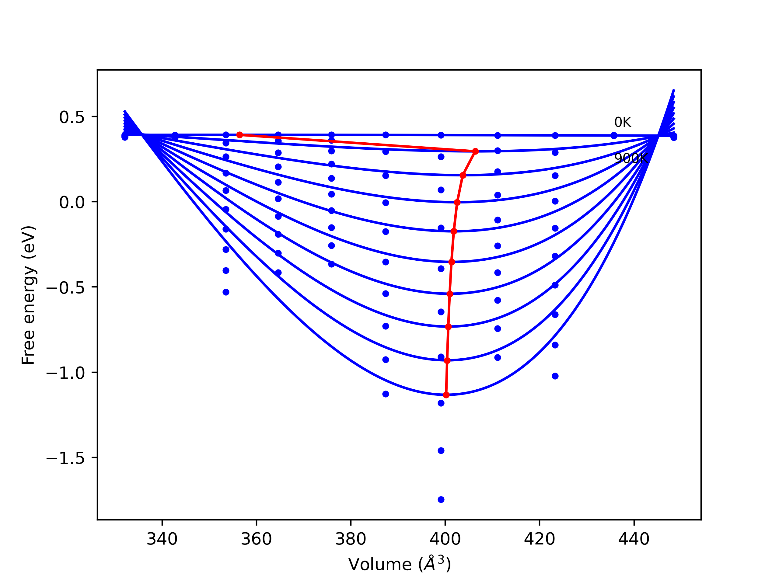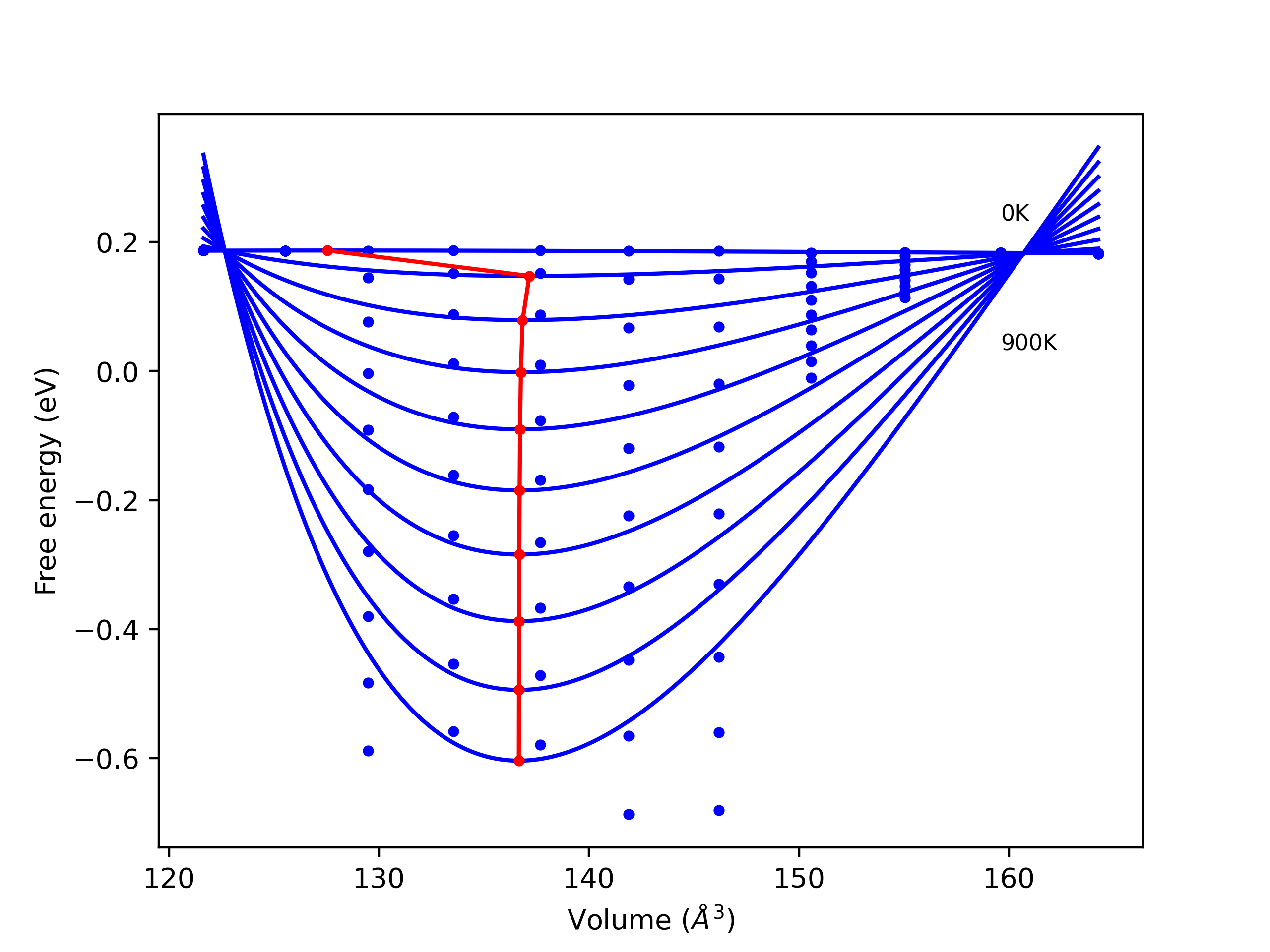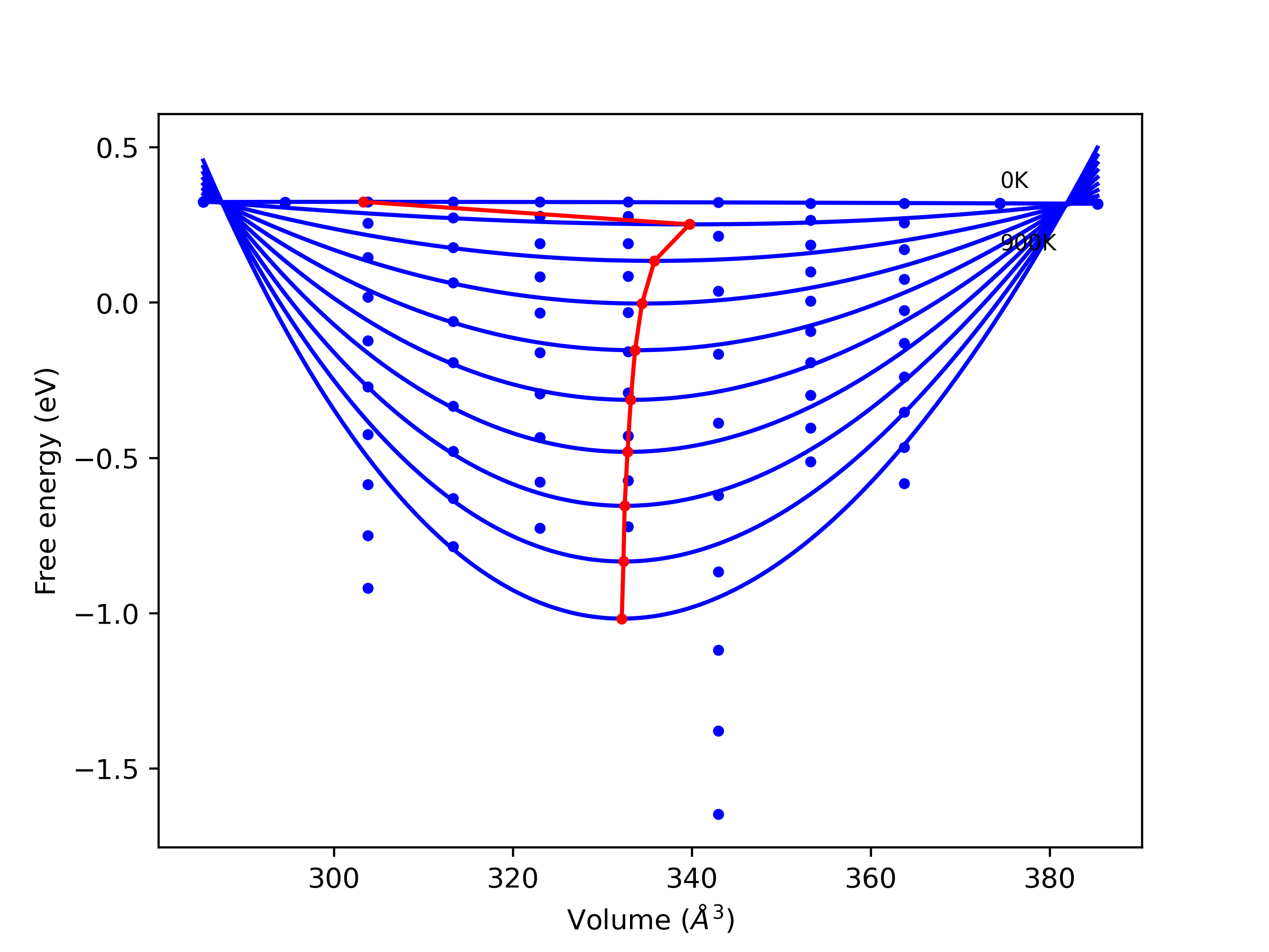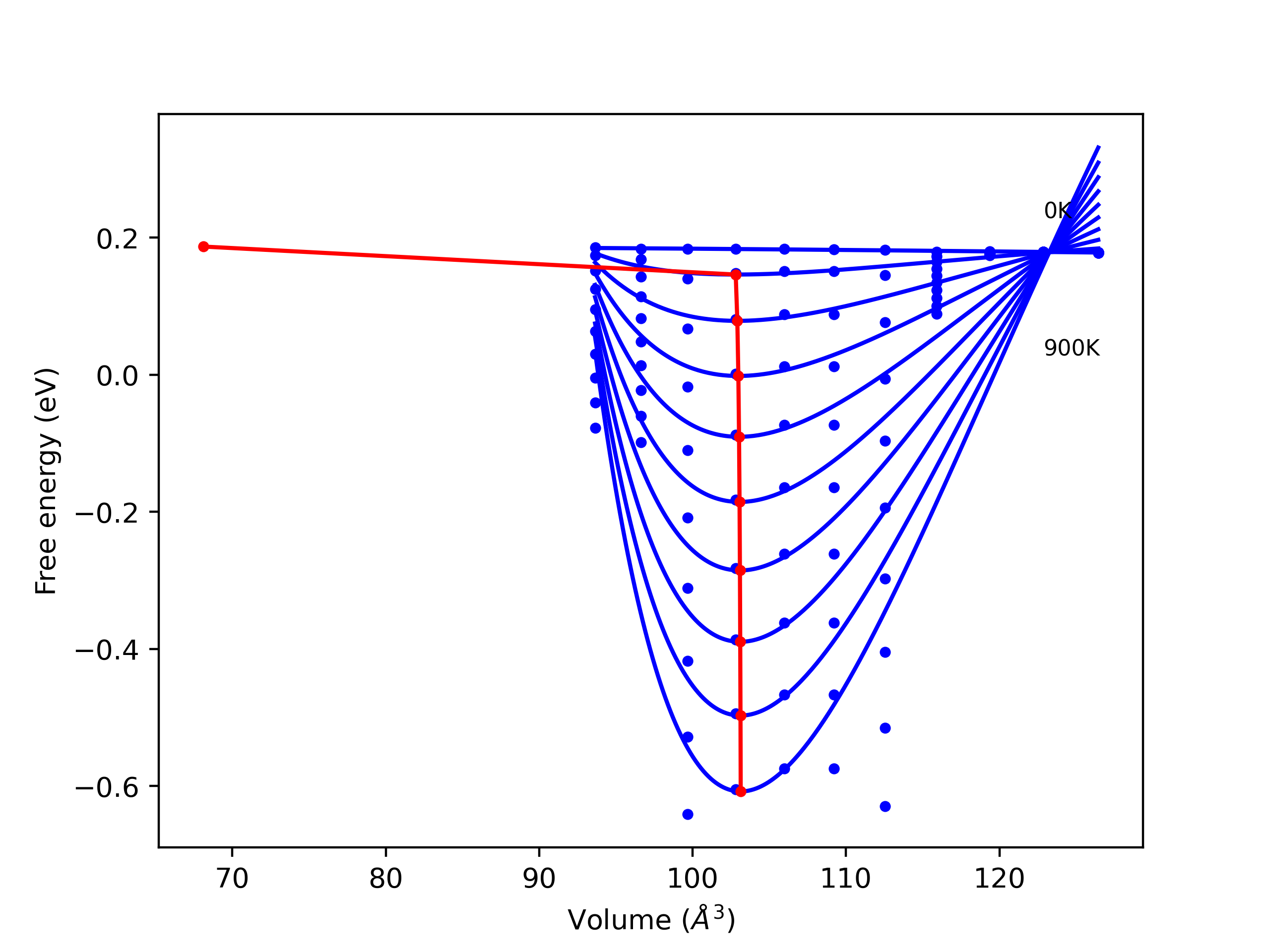 Phonon band structures and crystal properties estimated from quasi-harmonic approximation (QHA) calculations are displayed for select crystals. The calculations were performed using phonopy and LAMMPS. For the phonon calculations, 3x3 supercells of the potential-specific relaxed crystals were used. The QHA calculations were based on 11 strain states ranging from -0.05 to 0.05.
