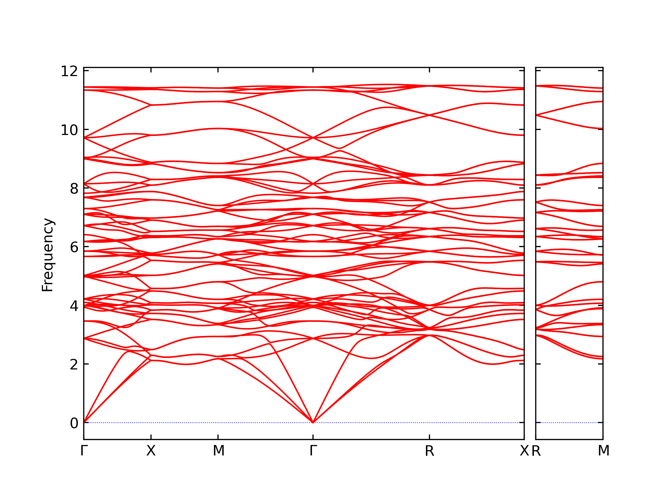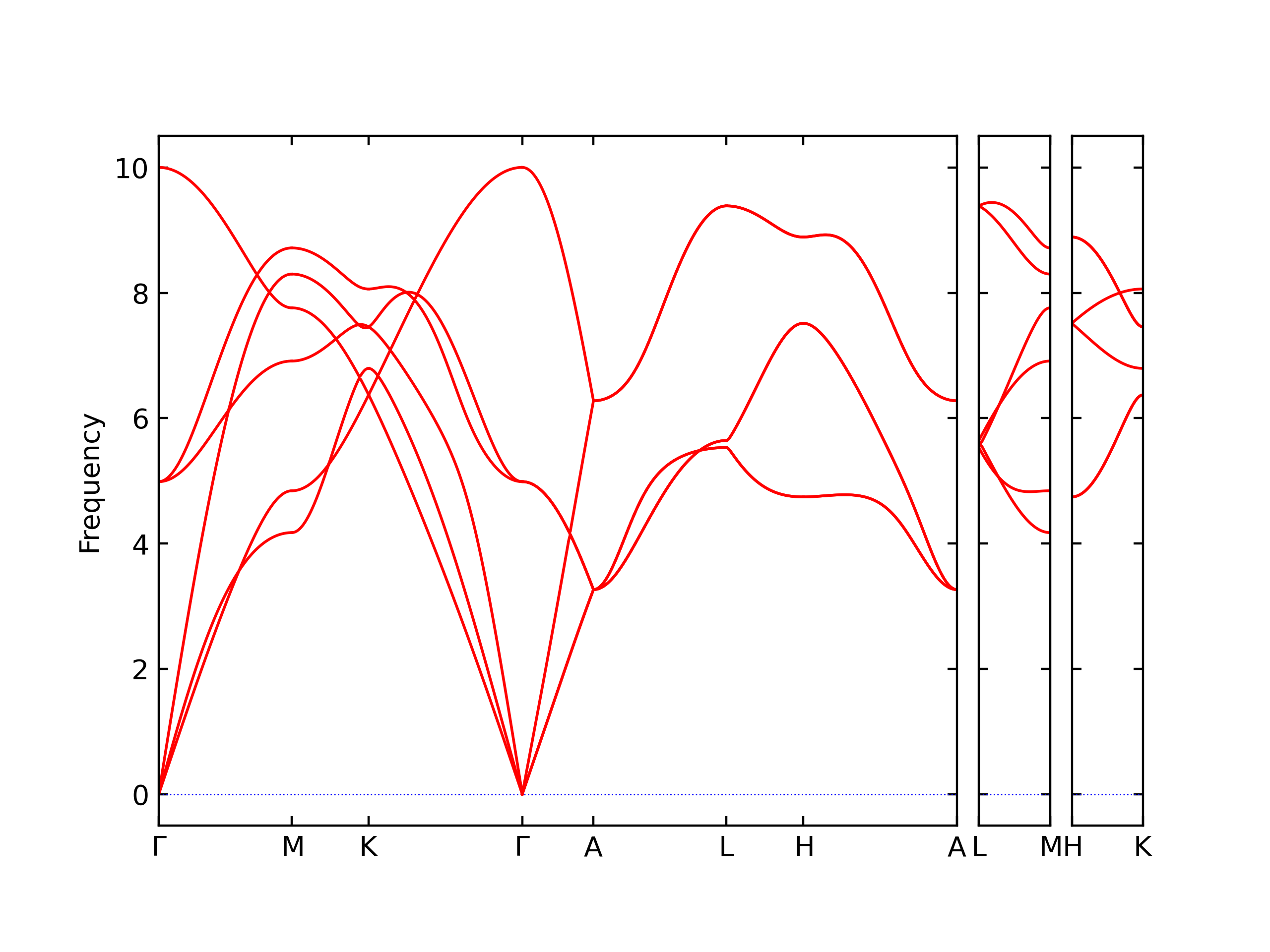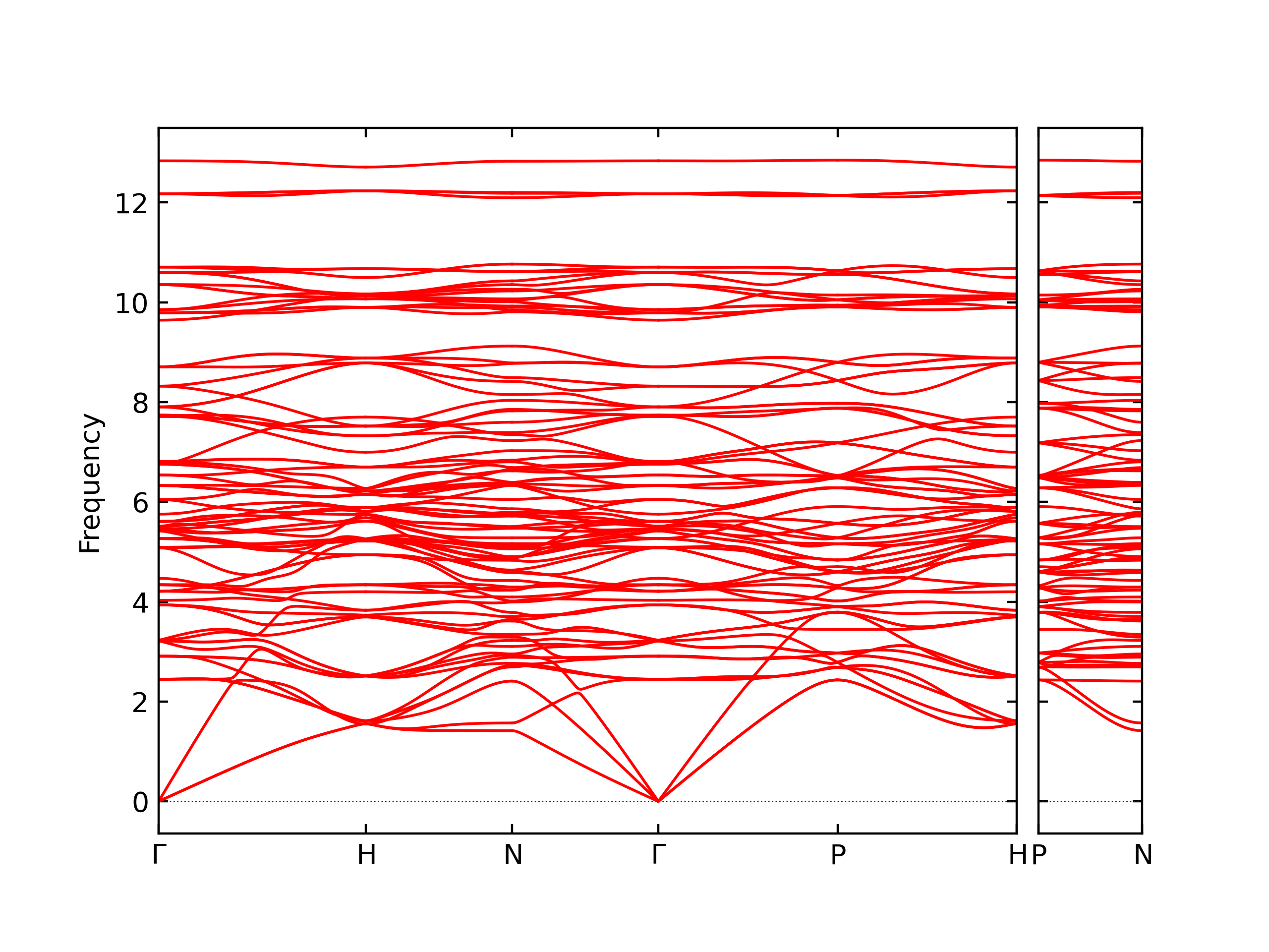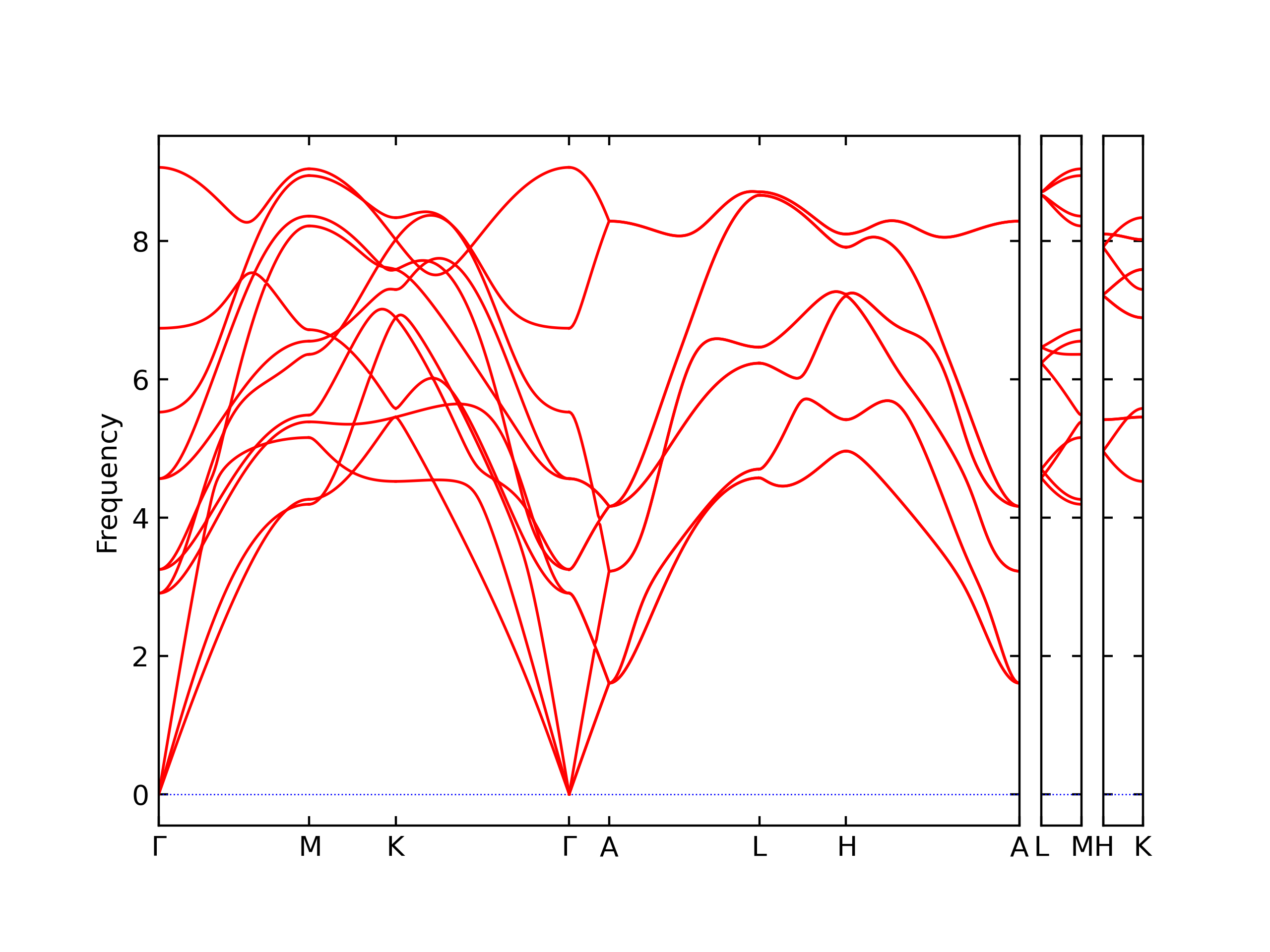 Phonon band structures and crystal properties estimated from quasi-harmonic approximation (QHA) calculations are displayed for select crystals. The calculations were performed using phonopy and LAMMPS. For the phonon calculations, 3x3 supercells of the potential-specific relaxed crystals were used. The QHA calculations were based on 11 strain states ranging from -0.05 to 0.05.