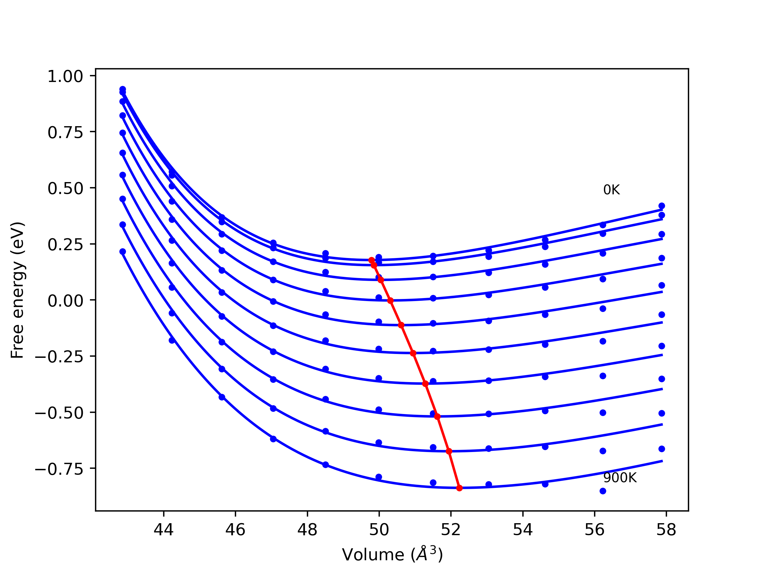 The Gibbs energies of the phases are estimated using thermodynamic integration between the interatomic potential in question and a simpler model with known Gibbs free energy values. For solids, the reference model is an Einstein solid, while for liquids it is the Uhlenbeck-Ford potential. Besides a short run at the start of the solid calculations to estimate Einstein model spring constants, the two calculations proceed similarly. Starting with the final relaxation configurations, the systems are stabilized for 25,000 steps. Then, over the next 50,000 steps the potential is swapped out for the reference potential. The system is then stabilized for another 25,000 steps with the reference model before a reverse swap of 50,000 steps is performed. The simulation ends with one final 25,000 step stabilization period. From the simulation, the irreversible work of transformation is estimated and used to compute the absolute Gibbs free energy of the target phase and potential relative to the reference potential. Entropy is estimated as the difference in enthalpy and Gibbs free energy and divided by temperature.