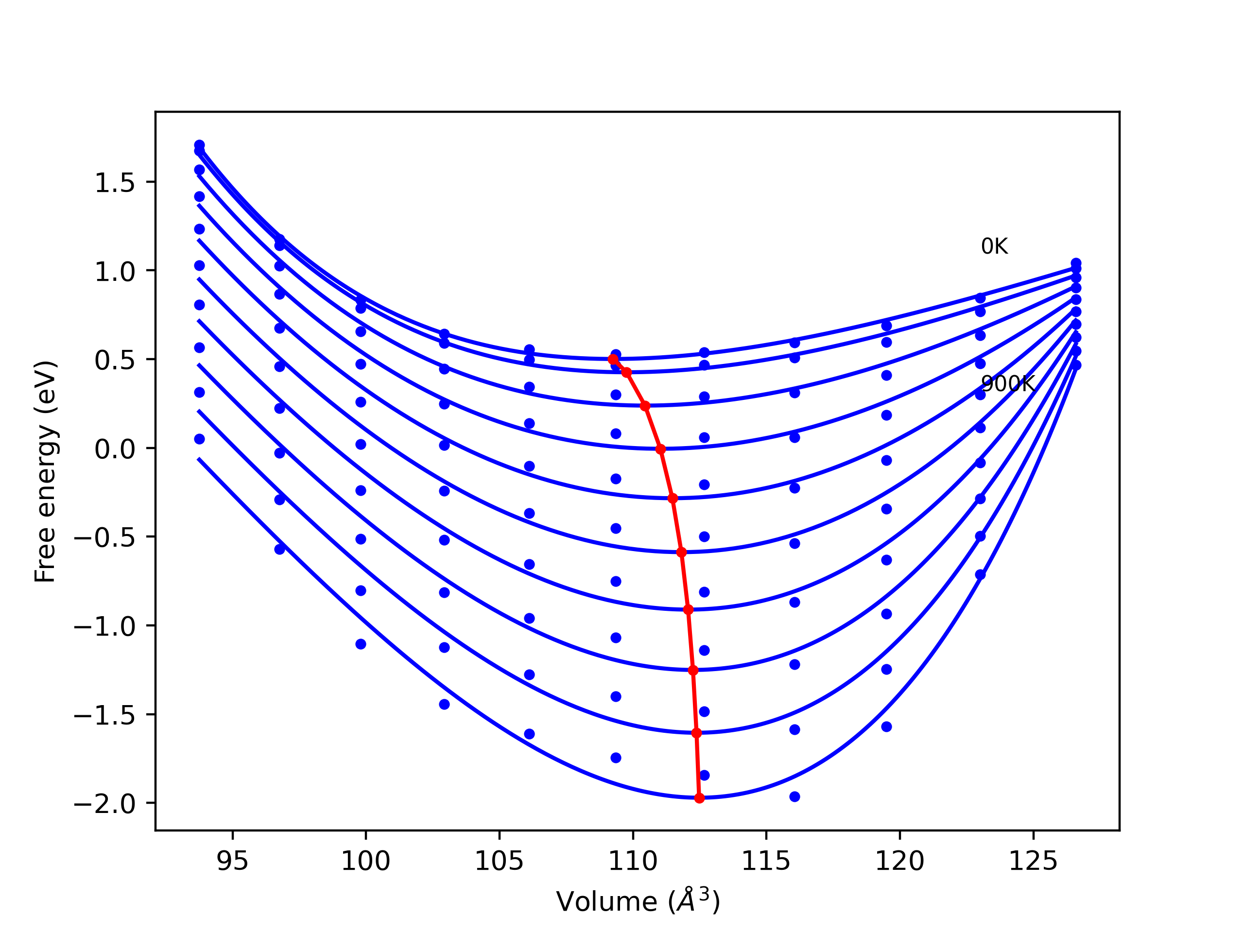 Plots of internal energy, Gibbs free energy, entropy, heat capacity and volume are shown here as a function of temperature for various crystal structures and liquid phases. The included crystal structures correspond to those in the Solid Structures vs. Temperature section, and the liquid phases to those in the Liquid Properties section. Internal energy and volume are taken from the associated structure relaxations mentioned in those previous sections. Constant pressure heat capacity is estimated using 3-point numerical derivatives of enthalpy versus temperature. Note that since all simulations done here are at 0 pressure, internal energy and enthalpy are equivalent.