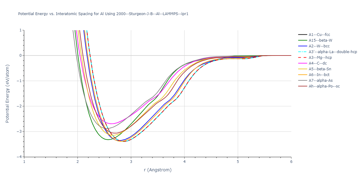 Plots of potential energy vs interatomic spacing, r, are shown below for a number of crystal structures. The structures are generated based on the ideal atomic positions and b/a and c/a lattice parameter ratios for a given crystal prototype. The size of the system is then uniformly scaled, and the energy calculated without relaxing the system. To obtain these plots, values of r are evaluated every 0.02 Å up to 6 Å.