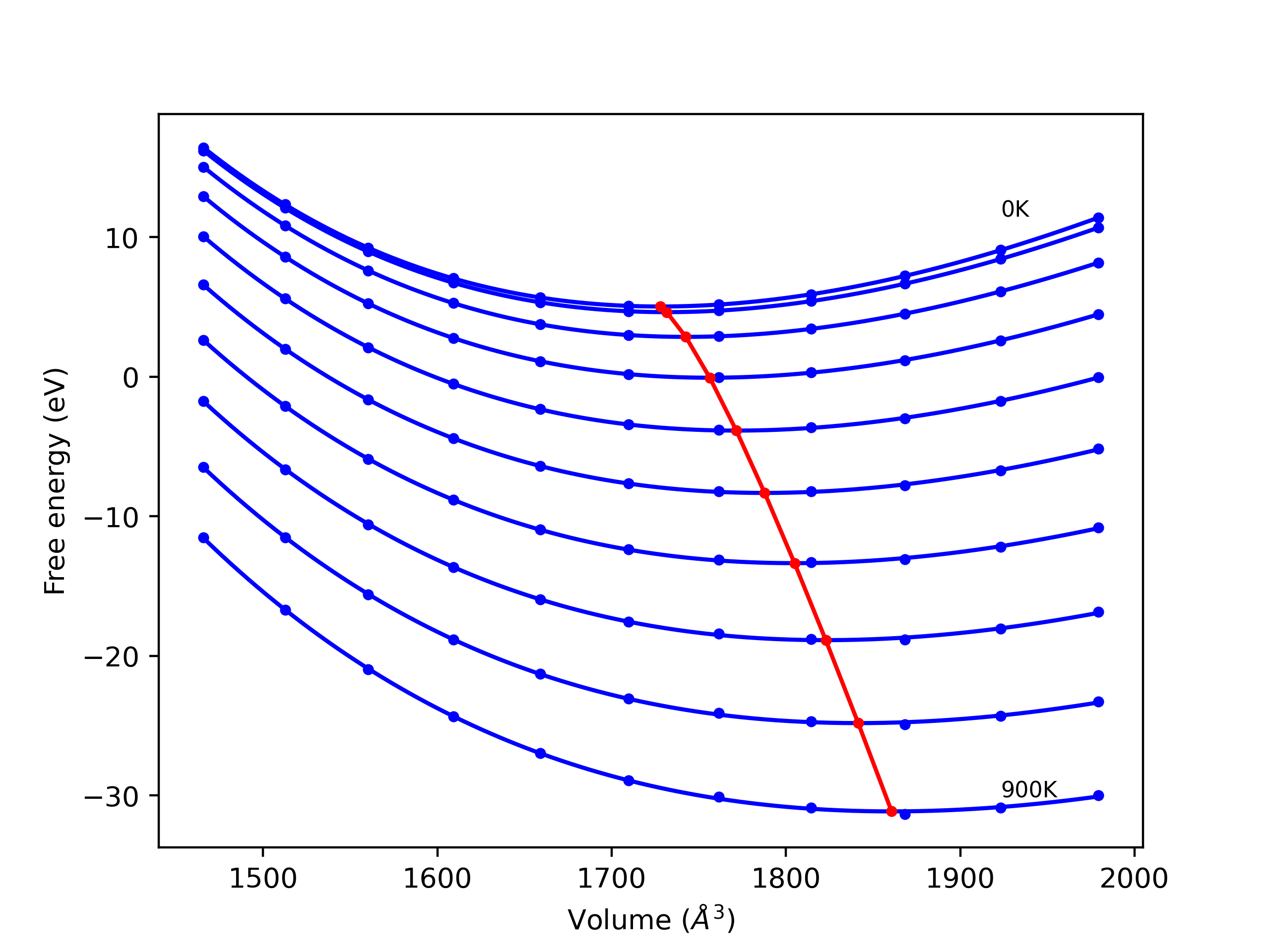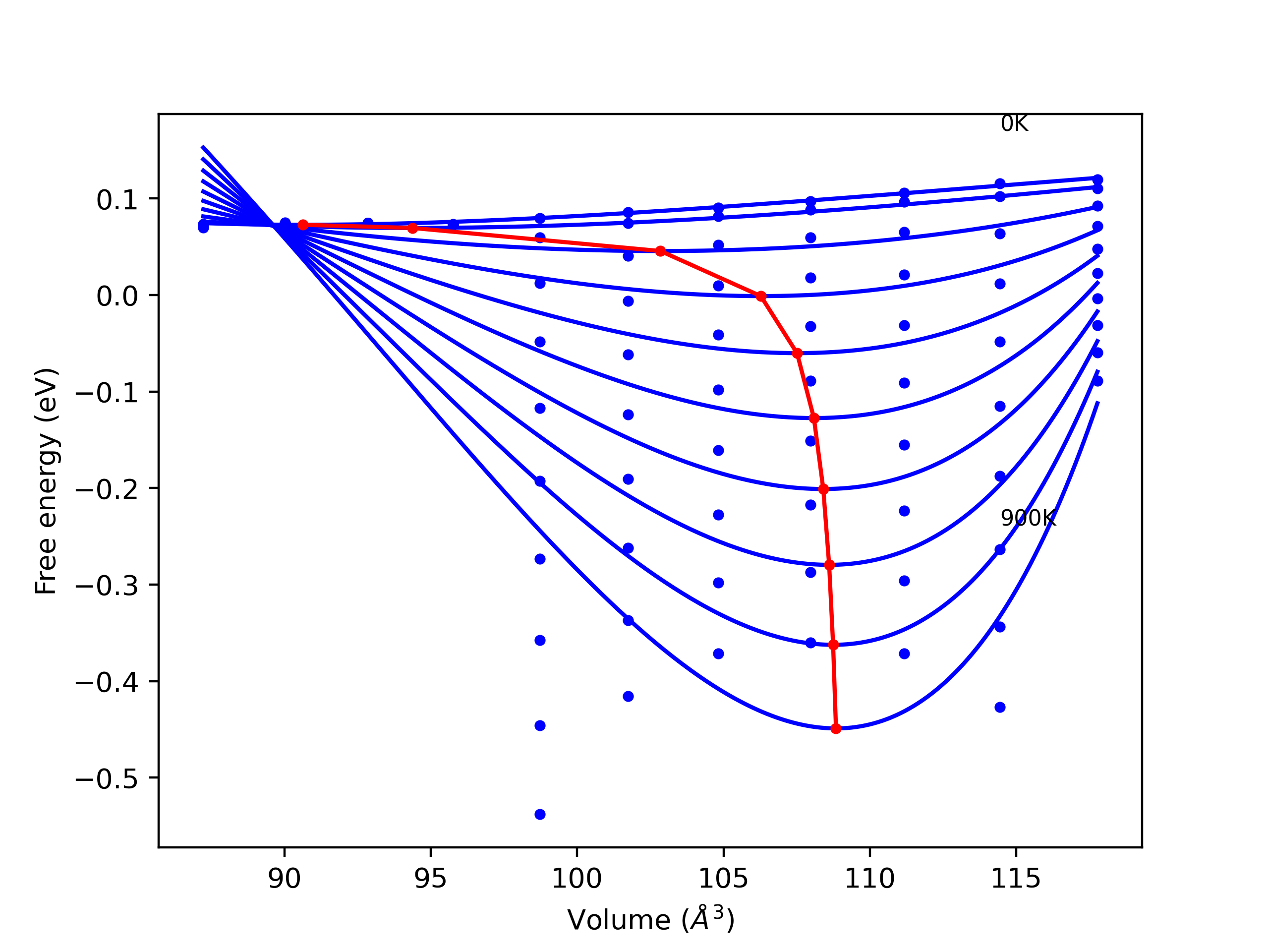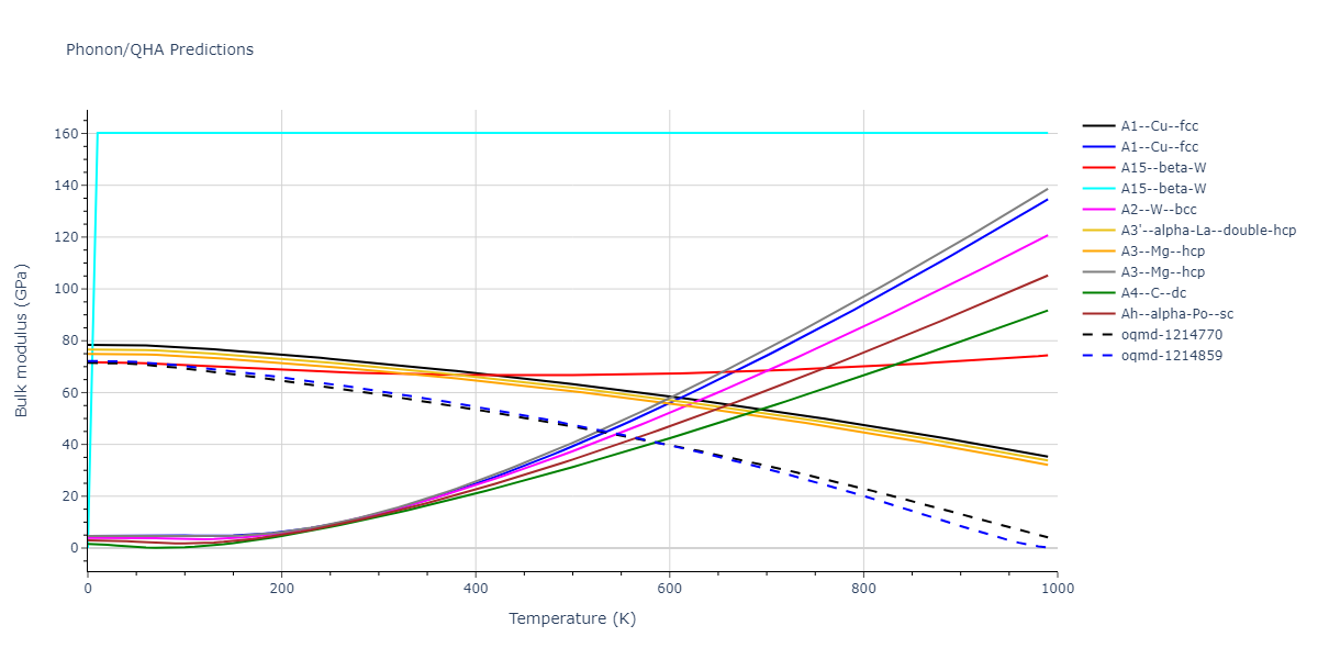 Phonon band structures and crystal properties estimated from quasi-harmonic approximation (QHA) calculations are displayed for select crystals. The calculations were performed using phonopy and LAMMPS. For the phonon calculations, 3x3 supercells of the potential-specific relaxed crystals were used. The QHA calculations were based on 11 strain states ranging from -0.05 to 0.05.