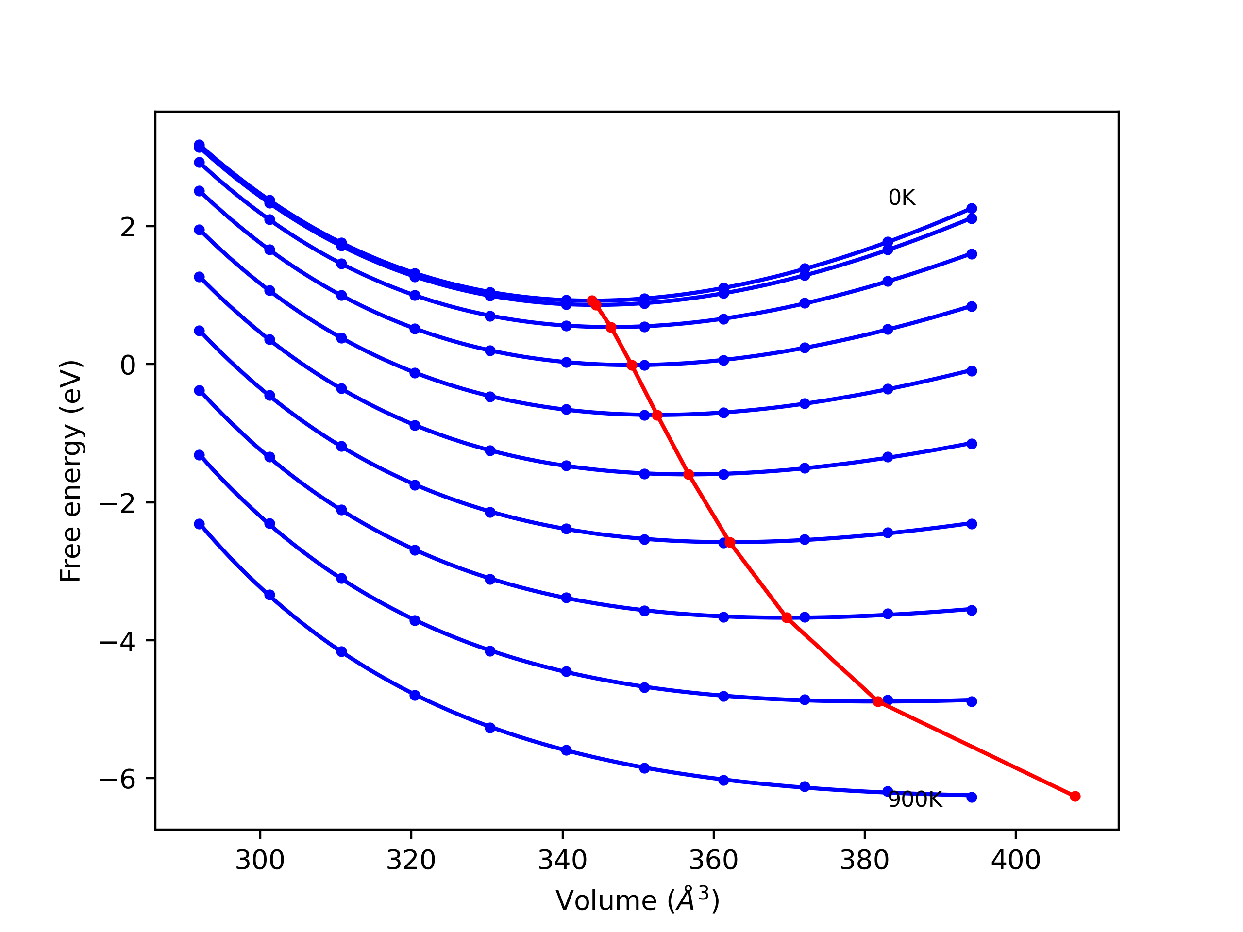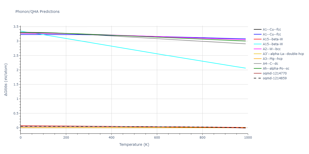 Phonon band structures and crystal properties estimated from quasi-harmonic approximation (QHA) calculations are displayed for select crystals. The calculations were performed using phonopy and LAMMPS. For the phonon calculations, 3x3 supercells of the potential-specific relaxed crystals were used. The QHA calculations were based on 11 strain states ranging from -0.05 to 0.05.