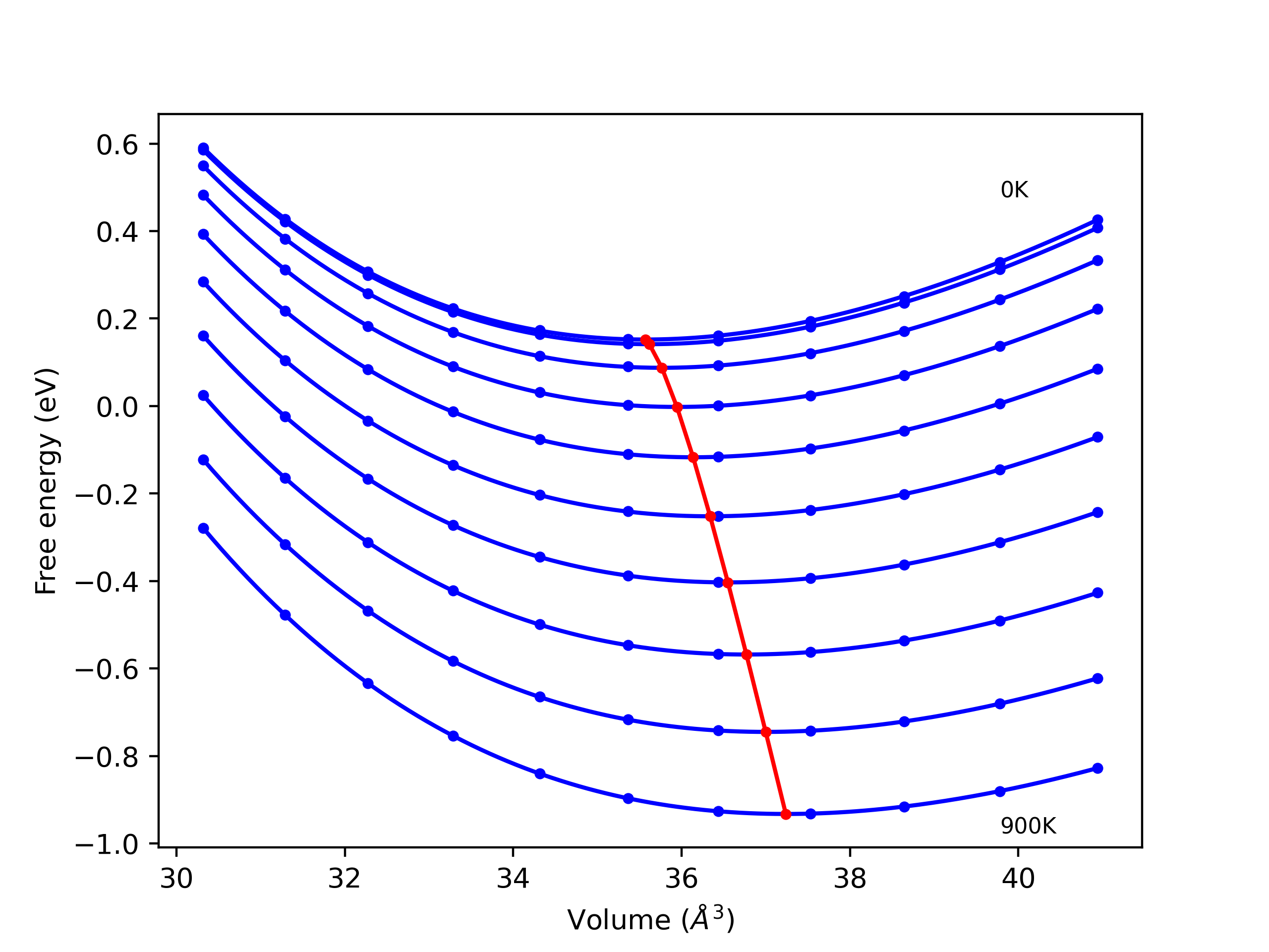 Phonon band structures and crystal properties estimated from quasi-harmonic approximation (QHA) calculations are displayed for select crystals. The calculations were performed using phonopy and LAMMPS. For the phonon calculations, 3x3 supercells of the potential-specific relaxed crystals were used. The QHA calculations were based on 11 strain states ranging from -0.05 to 0.05.