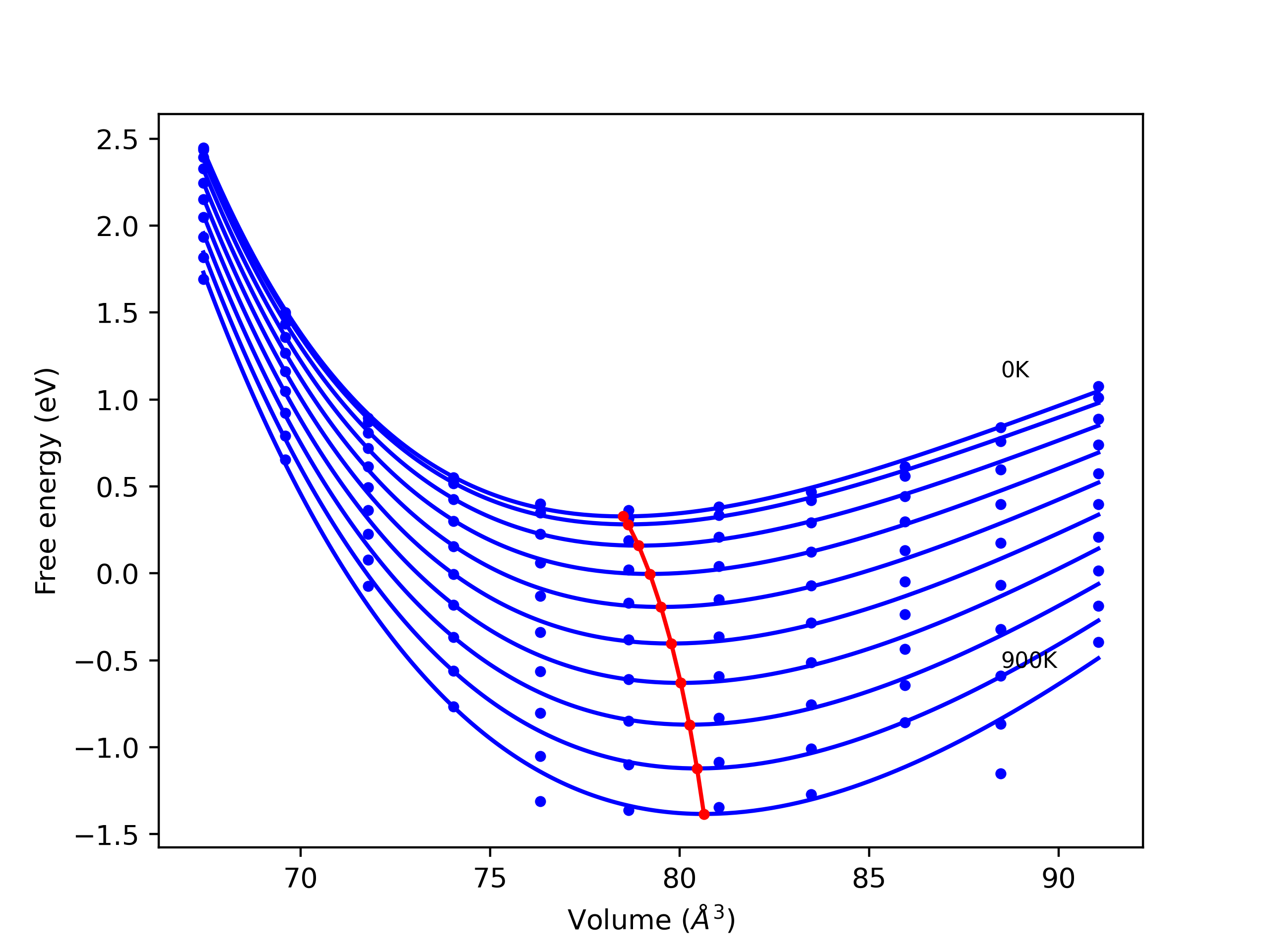 The Gibbs energies of the phases are estimated using thermodynamic integration between the interatomic potential in question and a simpler model with known Gibbs free energy values. For solids, the reference model is an Einstein solid, while for liquids it is the Uhlenbeck-Ford potential. Besides a short run at the start of the solid calculations to estimate Einstein model spring constants, the two calculations proceed similarly. Starting with the final relaxation configurations, the systems are stabilized for 25,000 steps. Then, over the next 50,000 steps the potential is swapped out for the reference potential. The system is then stabilized for another 25,000 steps with the reference model before a reverse swap of 50,000 steps is performed. The simulation ends with one final 25,000 step stabilization period. From the simulation, the (ir)reversible work of transformation is estimated and used to compute the absolute Gibbs free energy of the target phase and potential. Entropy is estimated as the difference in enthalpy and Gibbs free energy and divided by temperature.