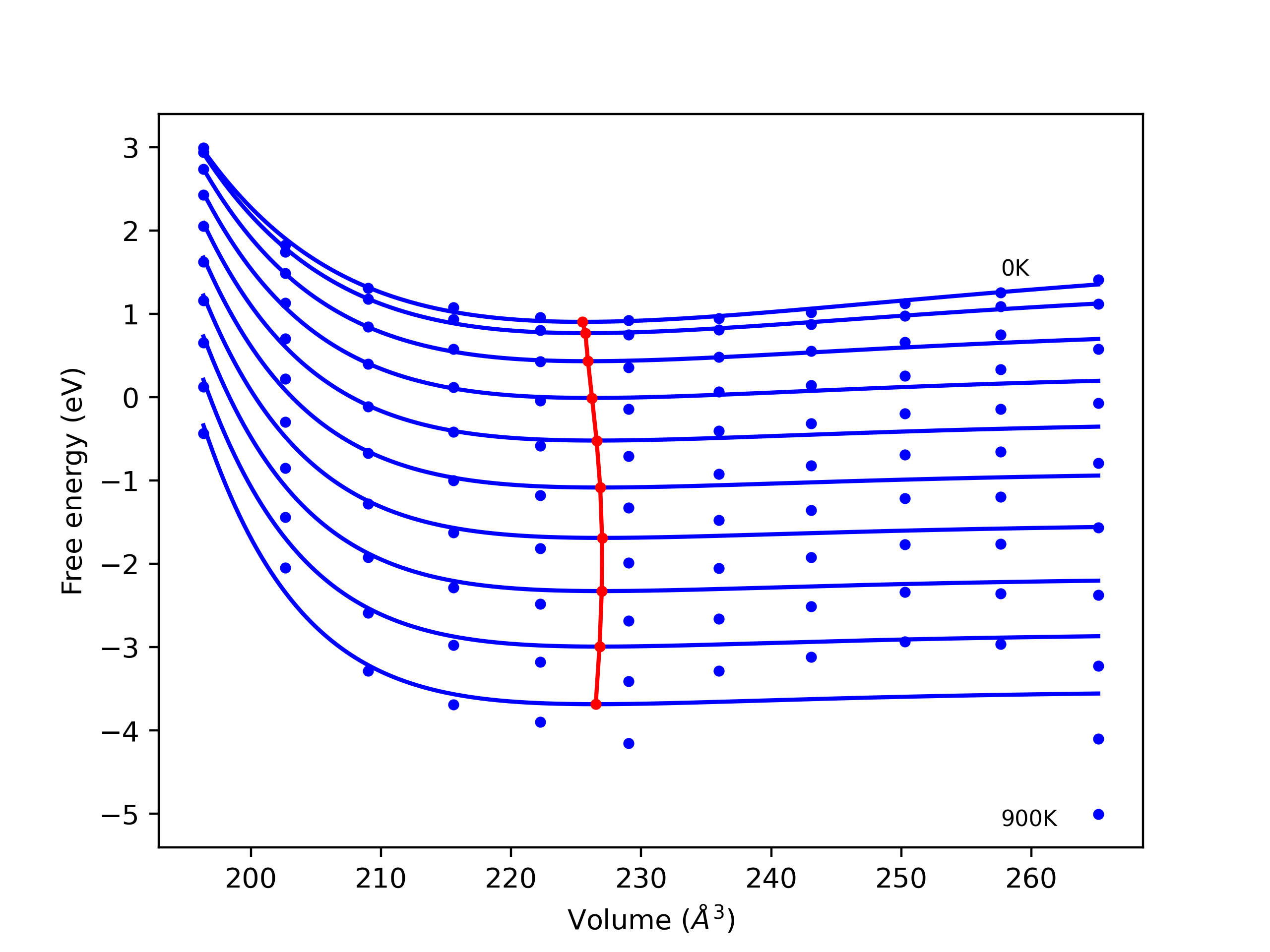 Plots of lattice and elastic constants are shown as a function of temperature. The 0K points were taken from the Crystal Structure Predictions and the Elastic Constants Predictions sections above for the unique crystal structures relaxed with the "dynamic" method. Starting from the 0K relaxed crystal unit cells, supercell systems are created by replicating all three dimensions by the same multiplier to achieve at least 4000 atoms. The systems are then relaxed at 50K and zero pressure using 1 million NPT steps. Lattice constants are estimated by averaging the measured box dimensions. Temperatures are iteratively increased by 50 K, with each subsequent relaxation calculation starting from the final atomic configuration at the previous temperature and relaxing for another 1 million steps.