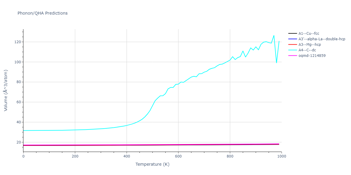 Phonon band structures and crystal properties estimated from quasi-harmonic approximation (QHA) calculations are displayed for select crystals. The calculations were performed using phonopy and LAMMPS. For the phonon calculations, 3x3 supercells of the potential-specific relaxed crystals were used. The QHA calculations were based on 11 strain states ranging from -0.05 to 0.05.