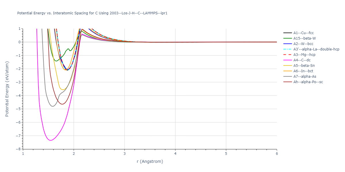 Plots of potential energy vs interatomic spacing, r, are shown below for a number of crystal structures. The structures are generated based on the ideal atomic positions and b/a and c/a lattice parameter ratios for a given crystal prototype. The size of the system is then uniformly scaled, and the energy calculated without relaxing the system. To obtain these plots, values of r are evaluated every 0.02 Å up to 6 Å.