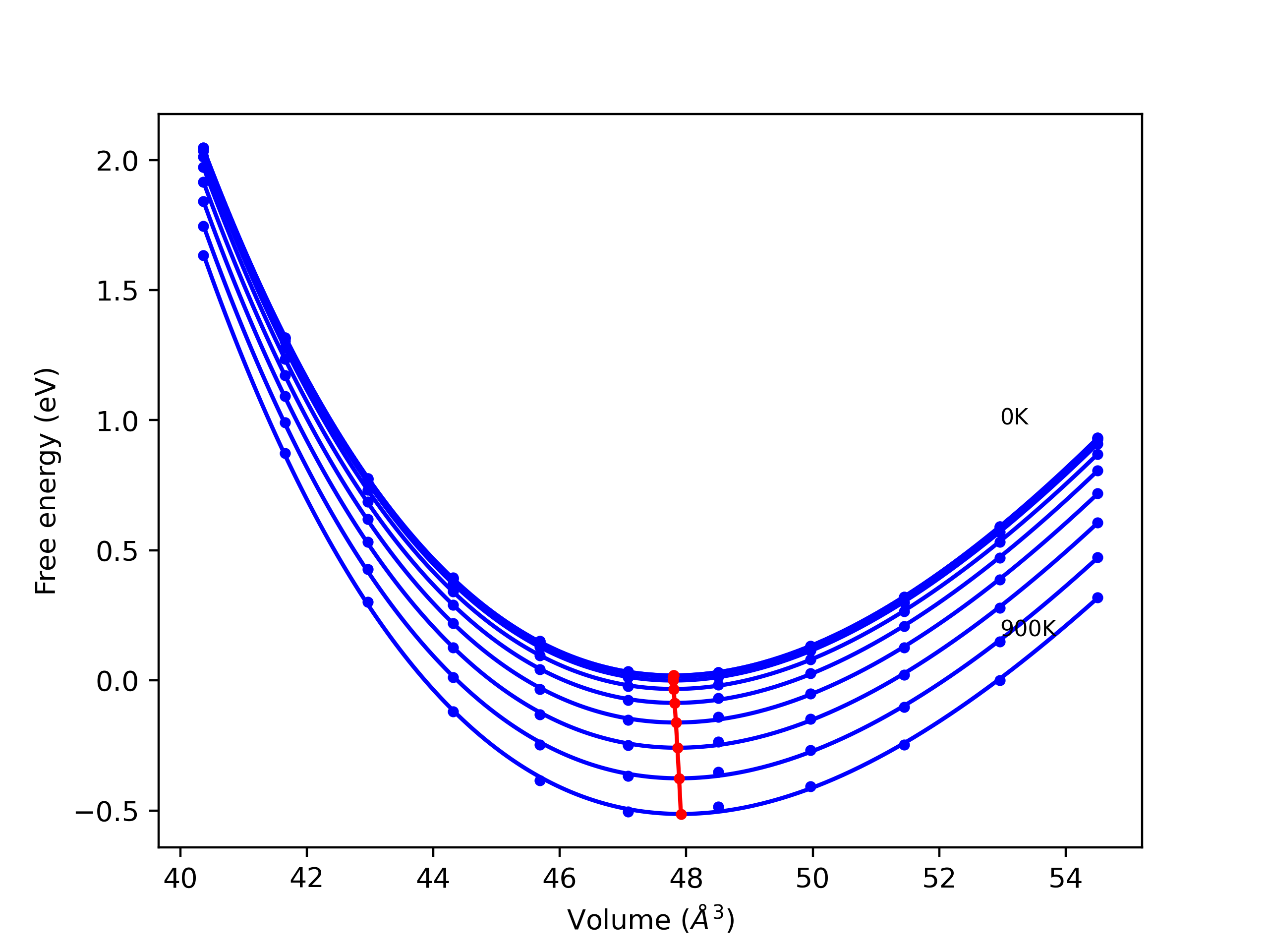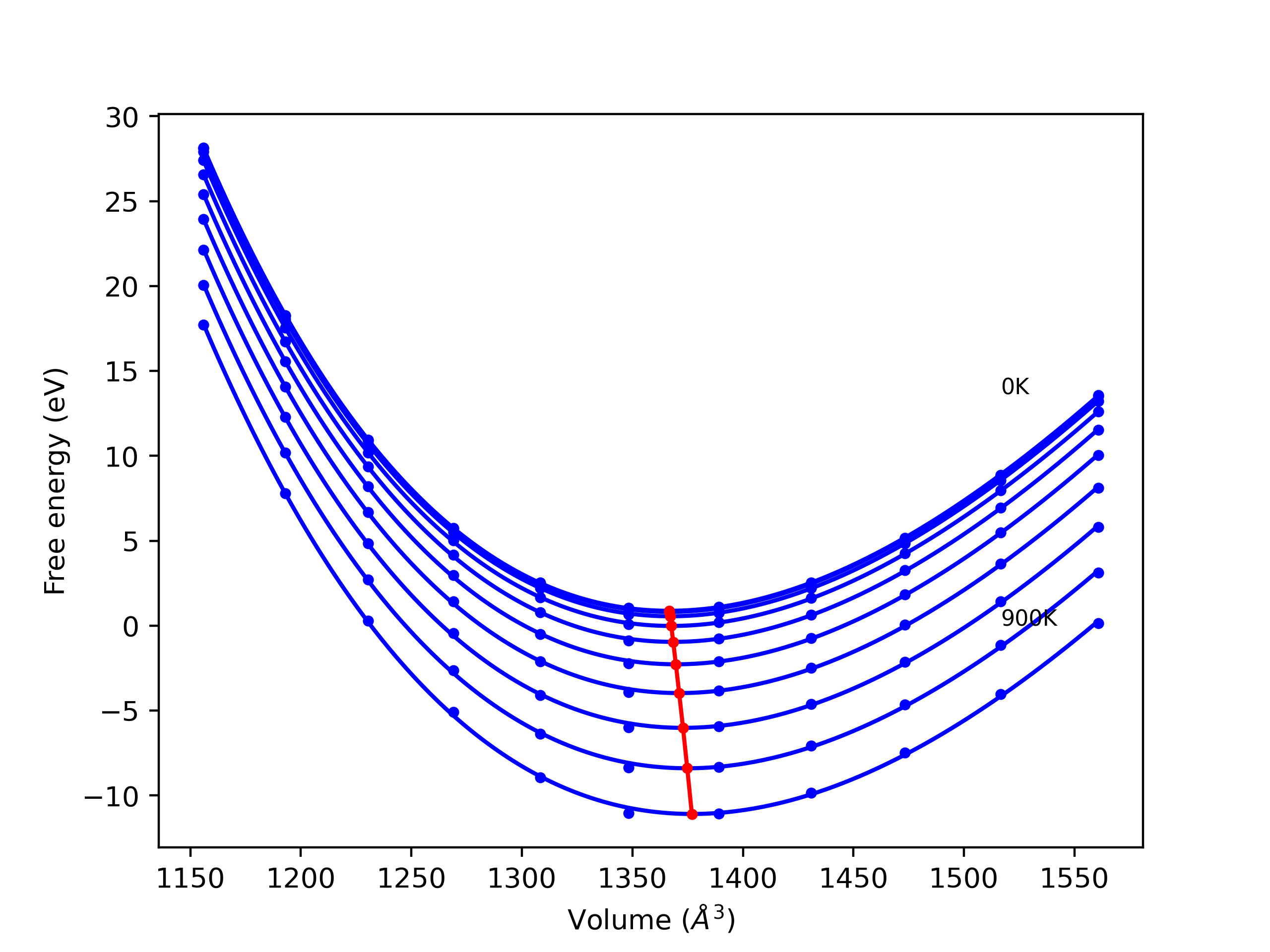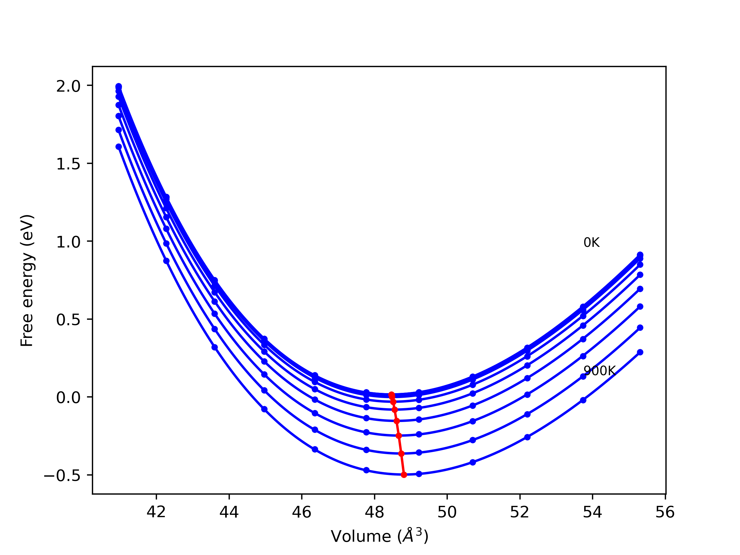 Plots of internal energy, Gibbs free energy, entropy, heat capacity and volume are shown here as a function of temperature for various crystal structures and liquid phases. The included crystal structures correspond to those in the Solid Structures vs. Temperature section, and the liquid phases to those in the Liquid Properties section. Internal energy and volume are taken from the associated structure relaxations mentioned in those previous sections. Constant pressure heat capacity is estimated using 3-point numerical derivatives of enthalpy versus temperature. Note that since all simulations done here are at 0 pressure, internal energy and enthalpy are equivalent.