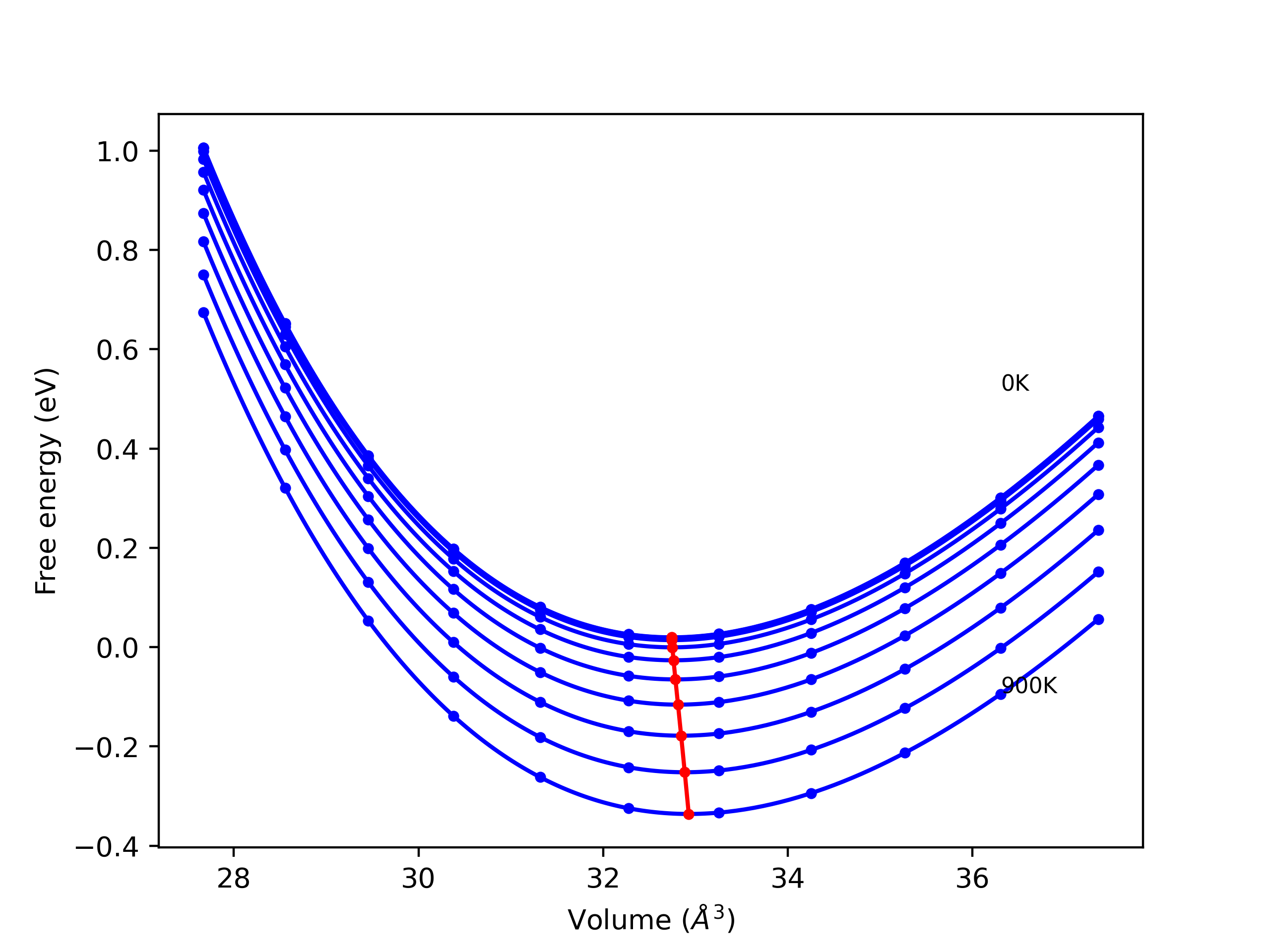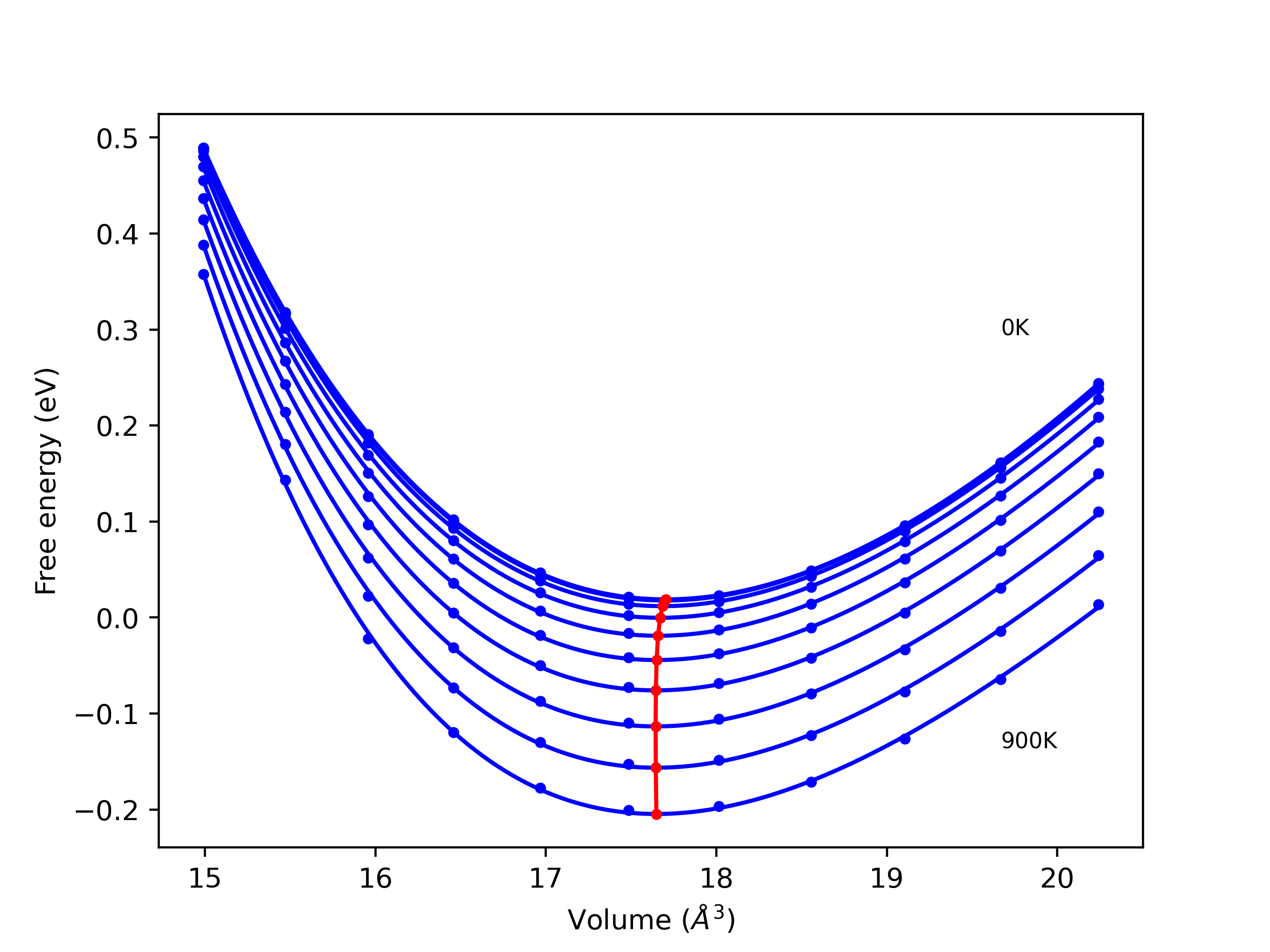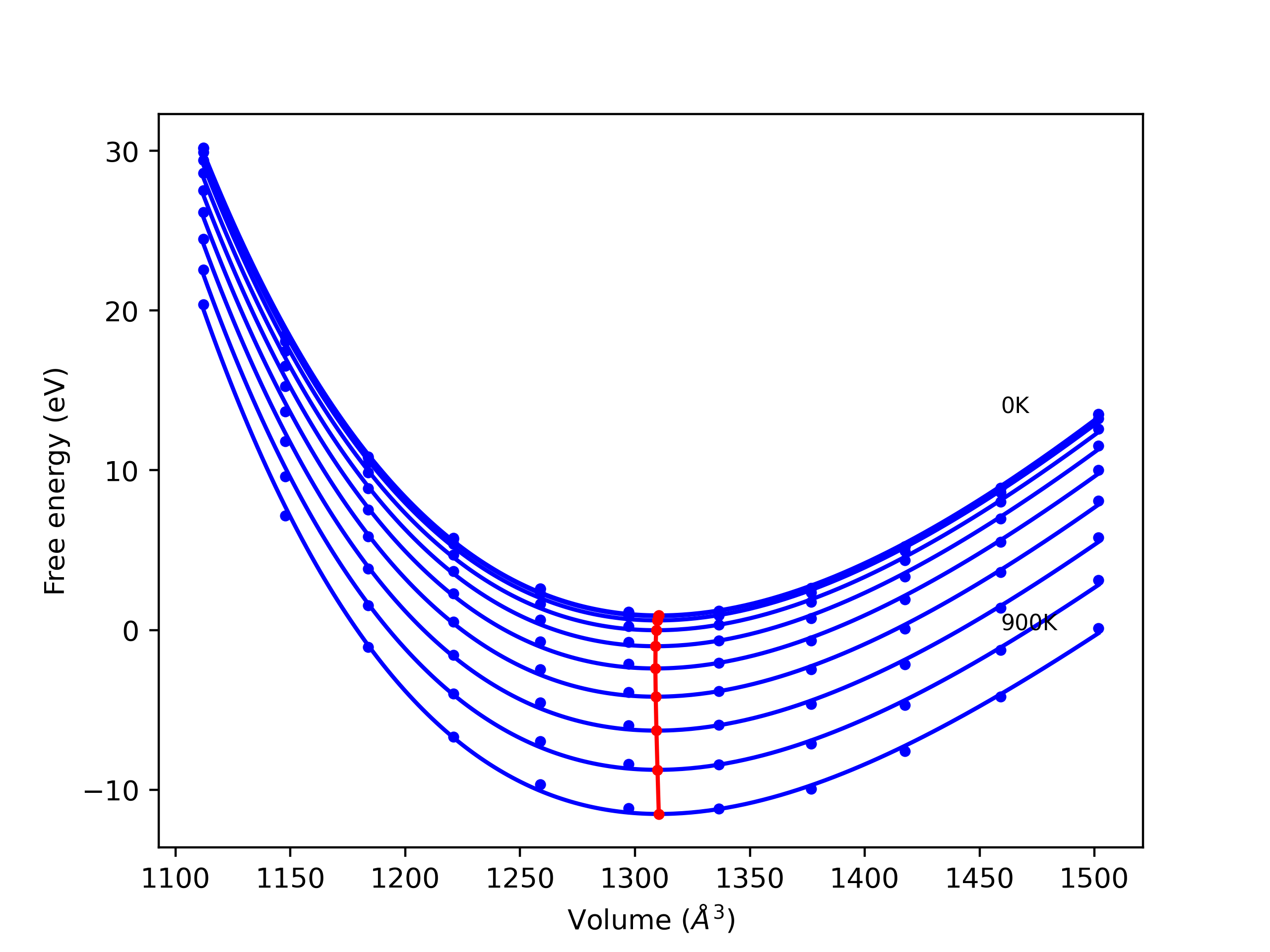 Plots of internal energy, Gibbs free energy, entropy, heat capacity and volume are shown here as a function of temperature for various crystal structures and liquid phases. The included crystal structures correspond to those in the Solid Structures vs. Temperature section, and the liquid phases to those in the Liquid Properties section. Internal energy and volume are taken from the associated structure relaxations mentioned in those previous sections. Constant pressure heat capacity is estimated using 3-point numerical derivatives of enthalpy versus temperature. Note that since all simulations done here are at 0 pressure, internal energy and enthalpy are equivalent.
