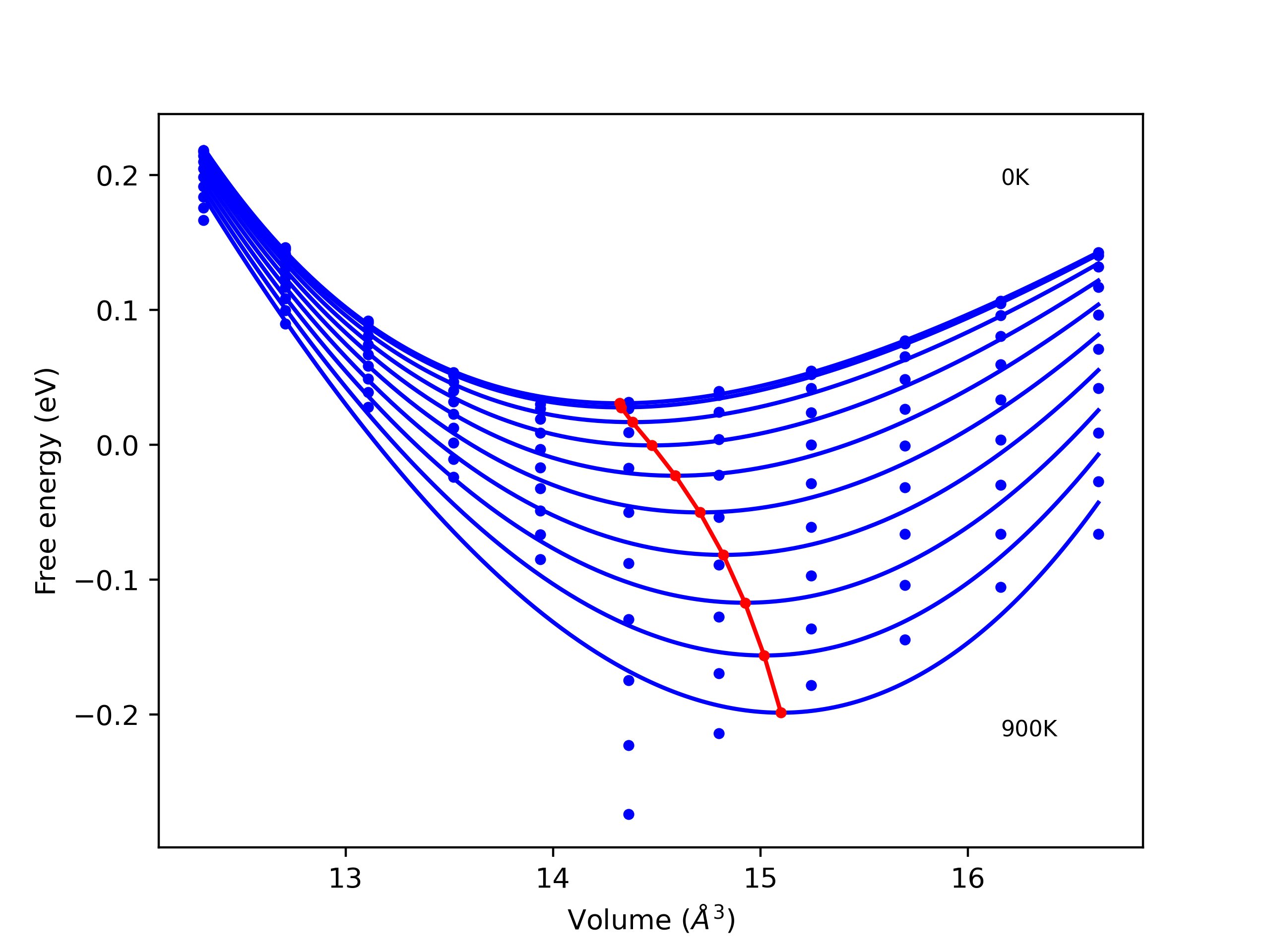 The Gibbs energies of the phases are estimated using thermodynamic integration between the interatomic potential in question and a simpler model with known Gibbs free energy values. For solids, the reference model is an Einstein solid, while for liquids it is the Uhlenbeck-Ford potential. Besides a short run at the start of the solid calculations to estimate Einstein model spring constants, the two calculations proceed similarly. Starting with the final relaxation configurations, the systems are stabilized for 25,000 steps. Then, over the next 50,000 steps the potential is swapped out for the reference potential. The system is then stabilized for another 25,000 steps with the reference model before a reverse swap of 50,000 steps is performed. The simulation ends with one final 25,000 step stabilization period. From the simulation, the (ir)reversible work of transformation is estimated and used to compute the absolute Gibbs free energy of the target phase and potential. Entropy is estimated as the difference in enthalpy and Gibbs free energy and divided by temperature.
