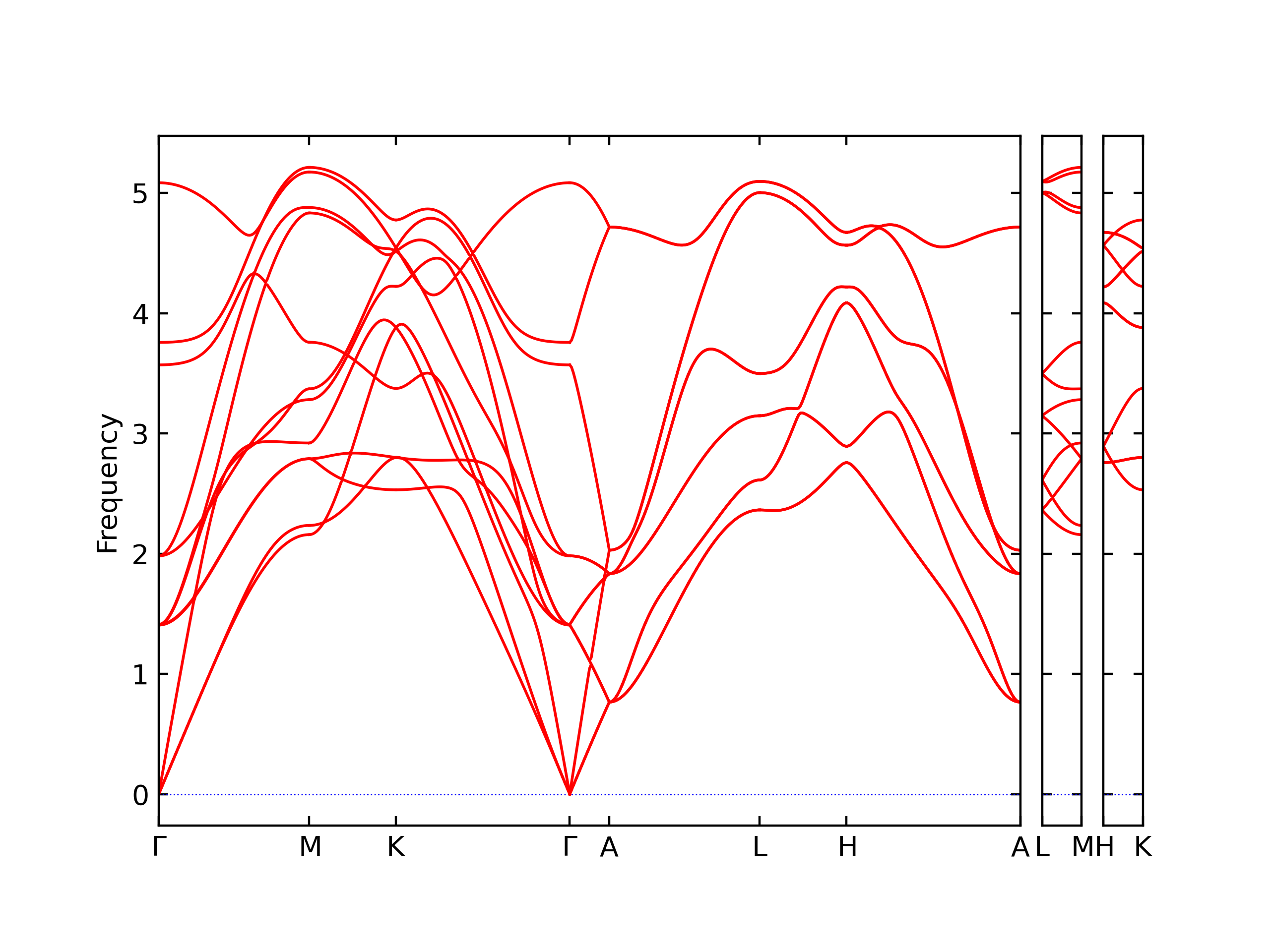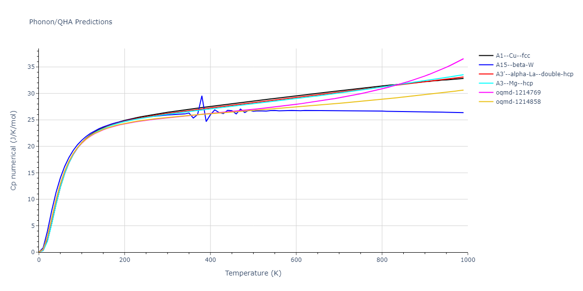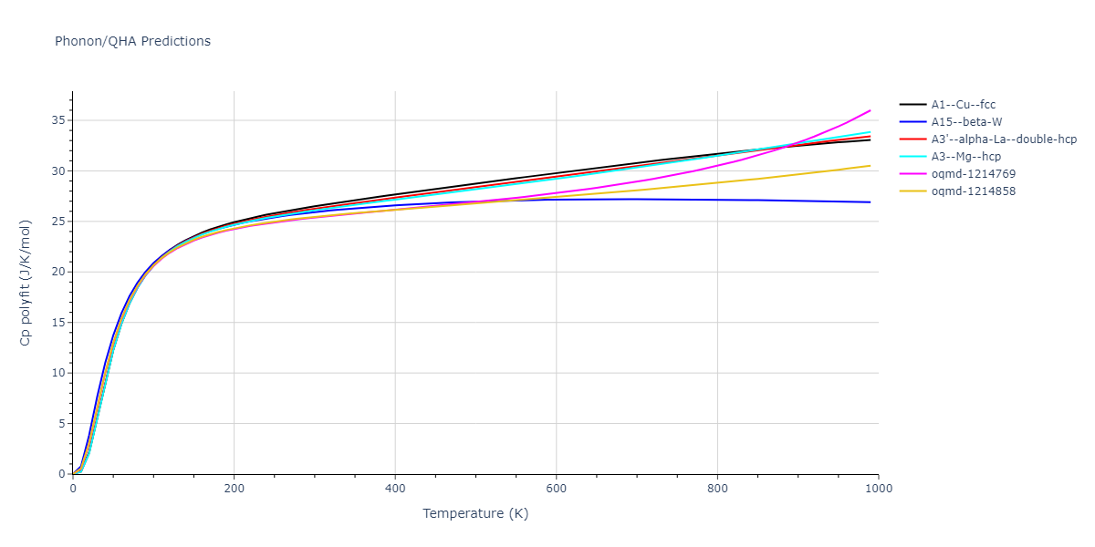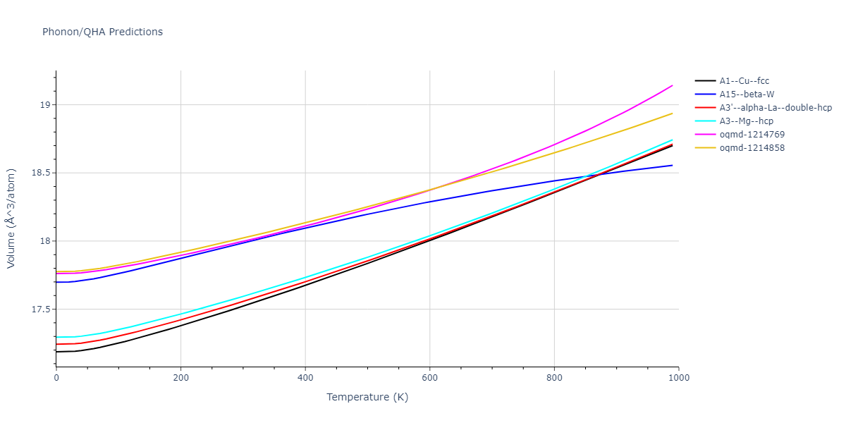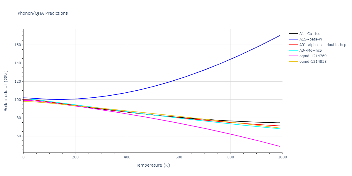 Phonon band structures and crystal properties estimated from quasi-harmonic approximation (QHA) calculations are displayed for select crystals. The calculations were performed using phonopy and LAMMPS. For the phonon calculations, 3x3 supercells of the potential-specific relaxed crystals were used. The QHA calculations were based on 11 strain states ranging from -0.05 to 0.05.