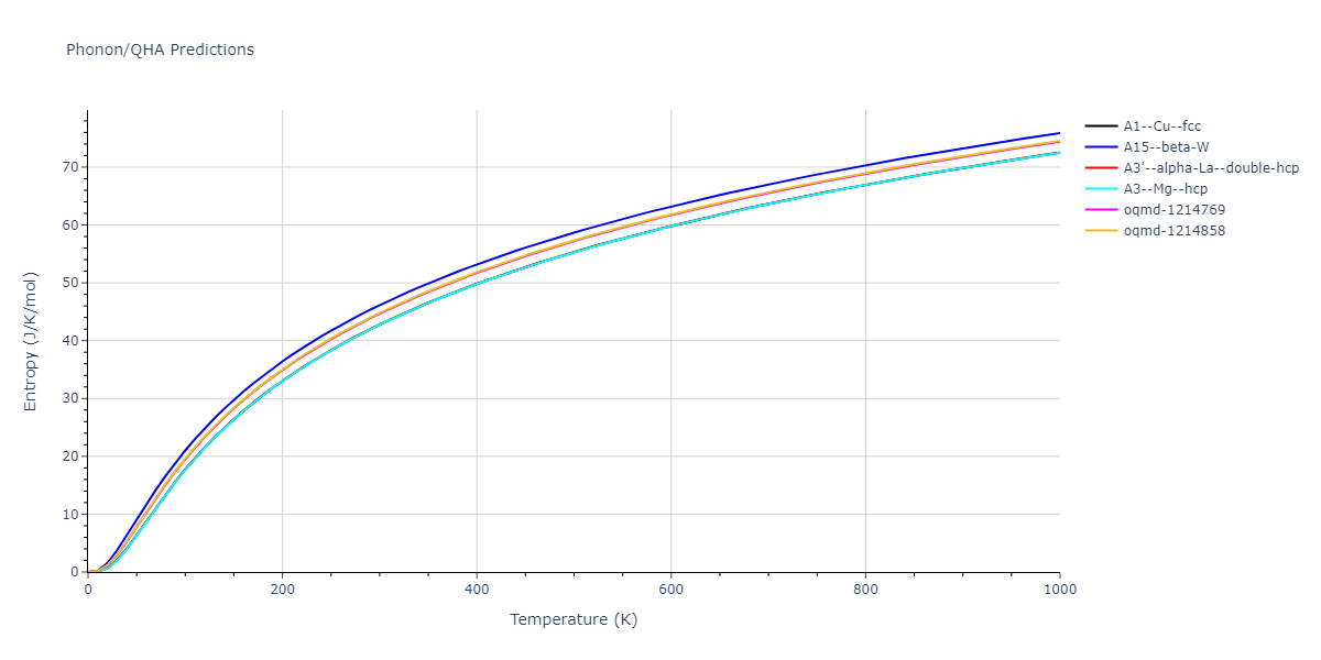 Plots of internal energy, Gibbs free energy, entropy, heat capacity and volume are shown here as a function of temperature for various crystal structures and liquid phases. The included crystal structures correspond to those in the Solid Structures vs. Temperature section, and the liquid phases to those in the Liquid Properties section. Internal energy and volume are taken from the associated structure relaxations mentioned in those previous sections. Constant pressure heat capacity is estimated using 3-point numerical derivatives of enthalpy versus temperature. Note that since all simulations done here are at 0 pressure, internal energy and enthalpy are equivalent.