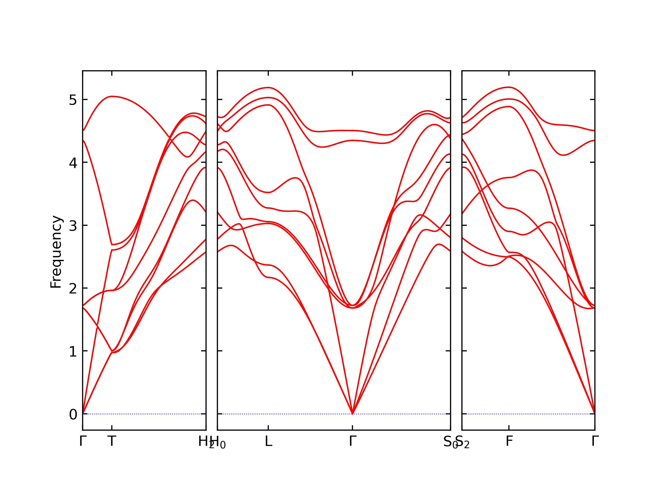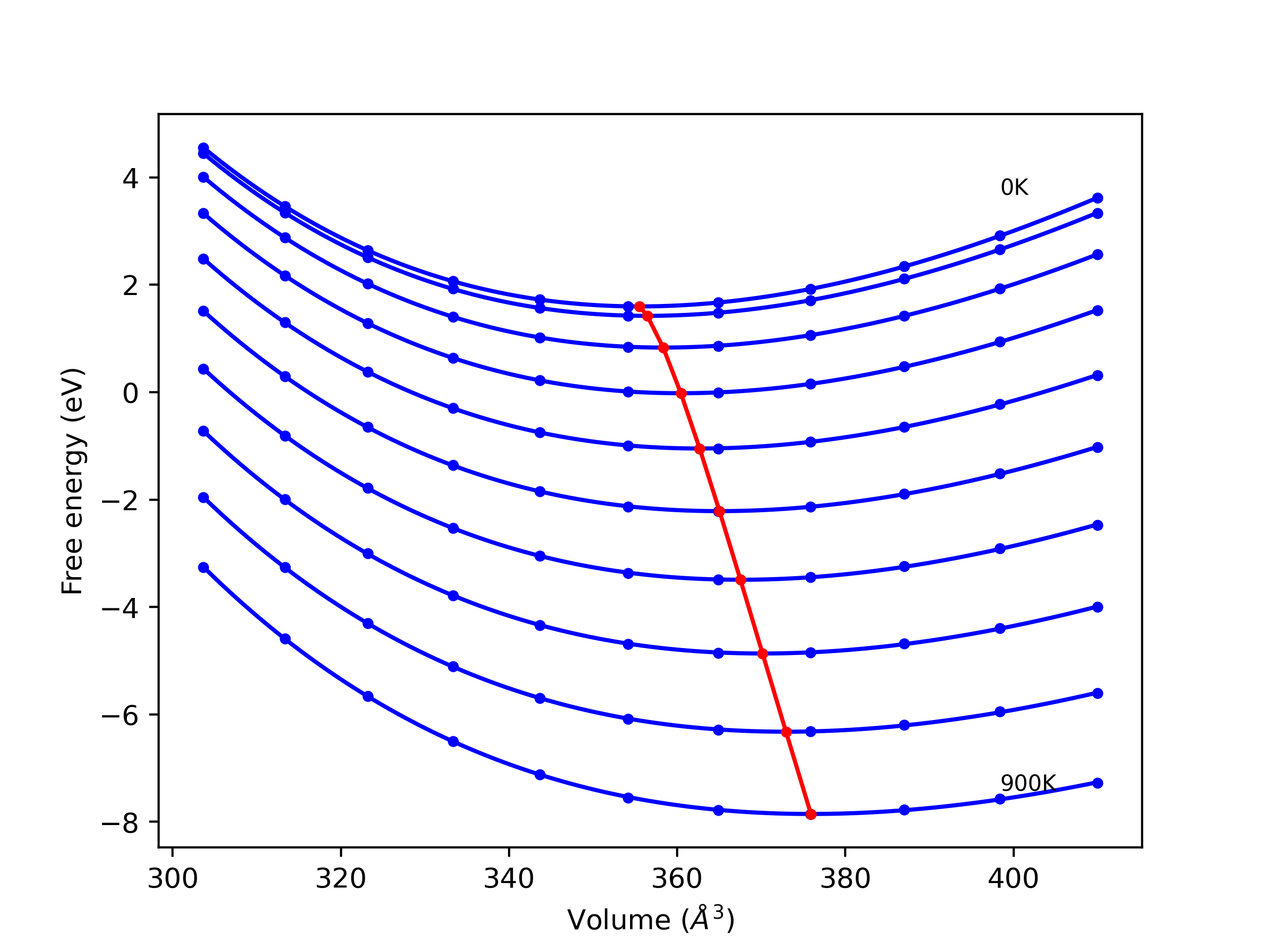 Phonon band structures and crystal properties estimated from quasi-harmonic approximation (QHA) calculations are displayed for select crystals. The calculations were performed using phonopy and LAMMPS. For the phonon calculations, 3x3 supercells of the potential-specific relaxed crystals were used. The QHA calculations were based on 11 strain states ranging from -0.05 to 0.05.