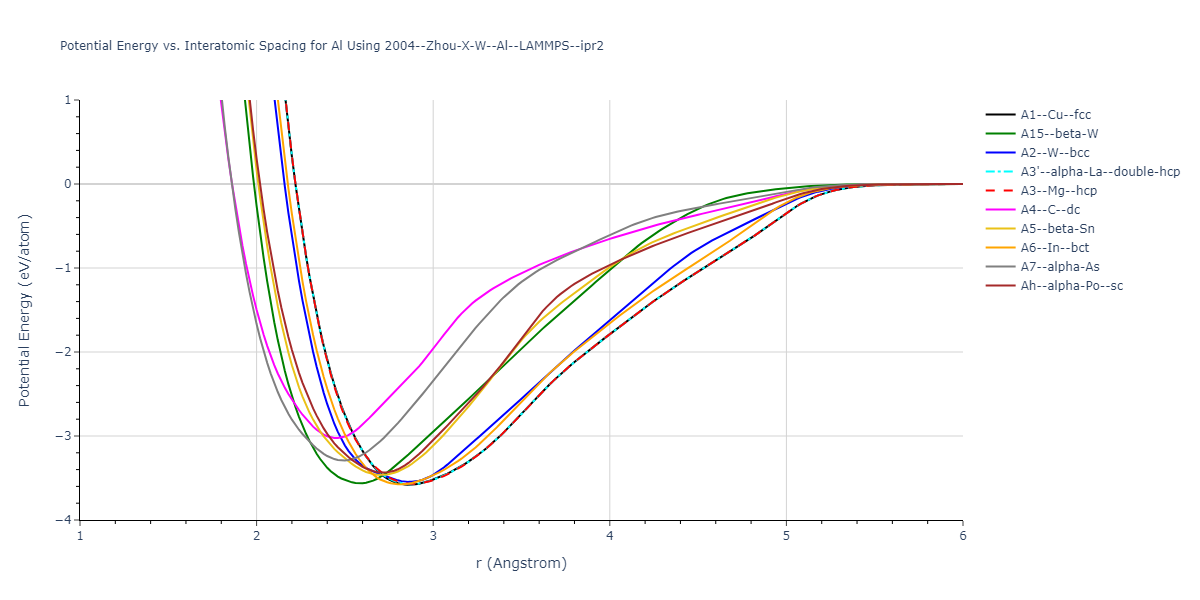 Plots of potential energy vs interatomic spacing, r, are shown below for a number of crystal structures. The structures are generated based on the ideal atomic positions and b/a and c/a lattice parameter ratios for a given crystal prototype. The size of the system is then uniformly scaled, and the energy calculated without relaxing the system. To obtain these plots, values of r are evaluated every 0.02 Å up to 6 Å.