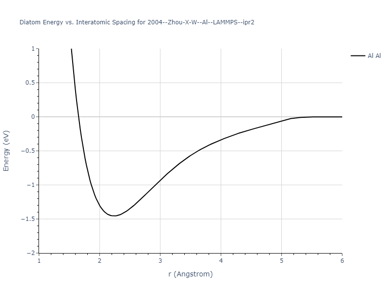 Plots of the potential energy vs interatomic spacing, r, are shown below for all diatom sets associated with the interatomic potential. This calculation provides insights into the functional form of the potential's two-body interactions. A system consisting of only two atoms is created, and the potential energy is evaluated for the atoms separated by 0.02 Å <= r <= 6.0> Å in intervals of 0.02 Å. Two plots are shown: one for the "standard" interaction distance range, and one for small values of r. The small r plot is useful for determining whether the potential is suitable for radiation studies.