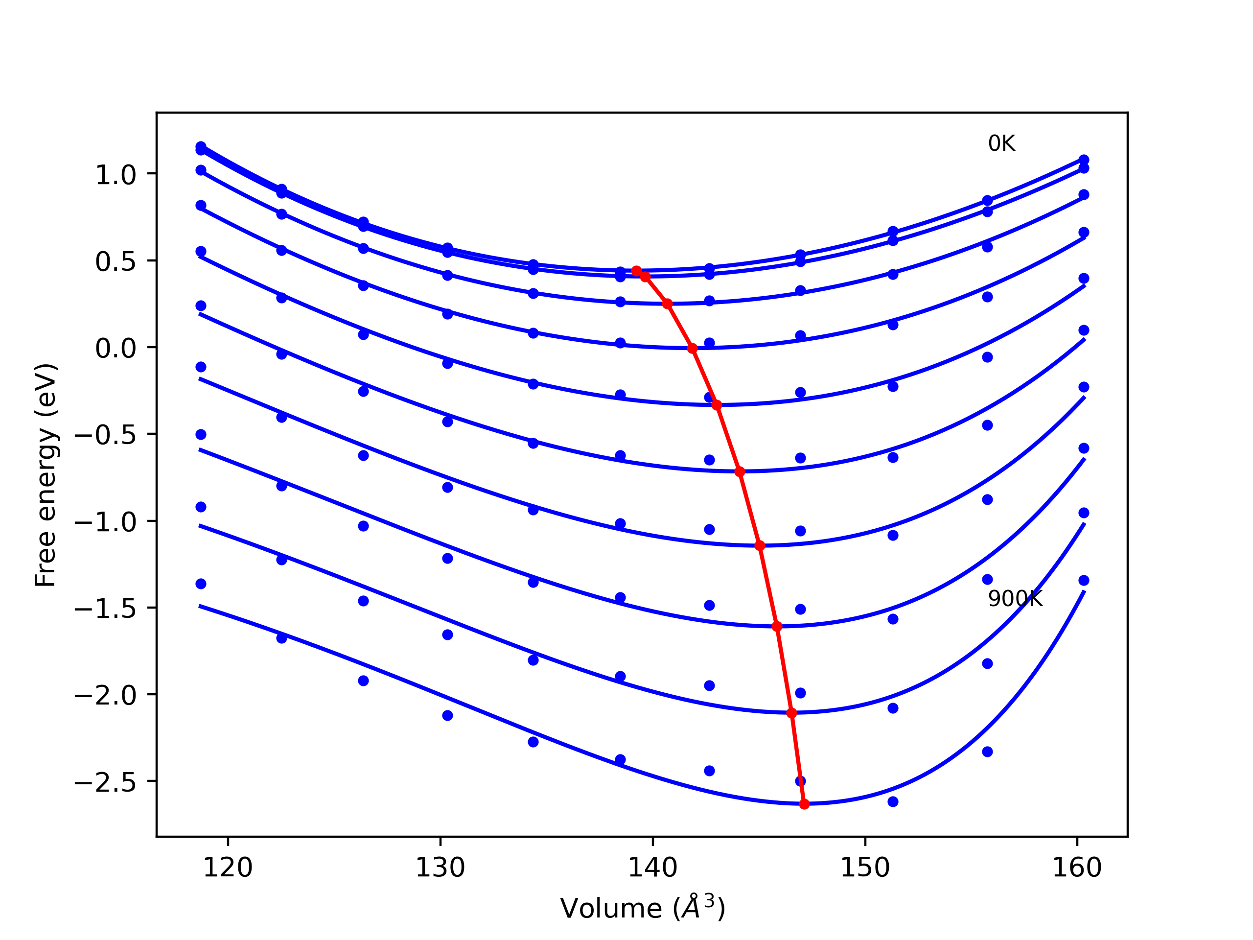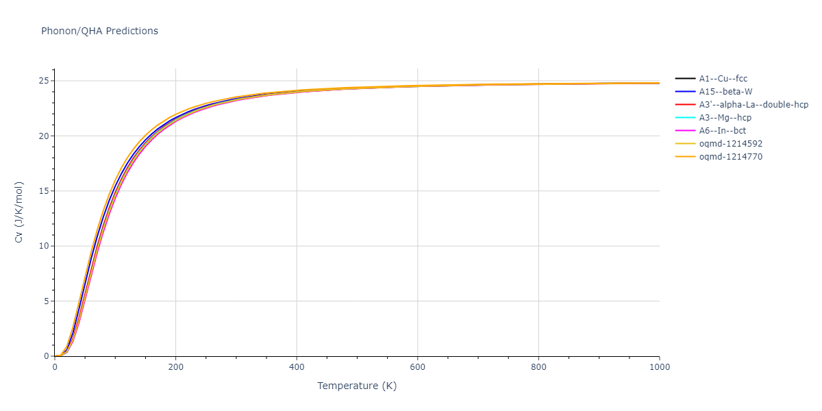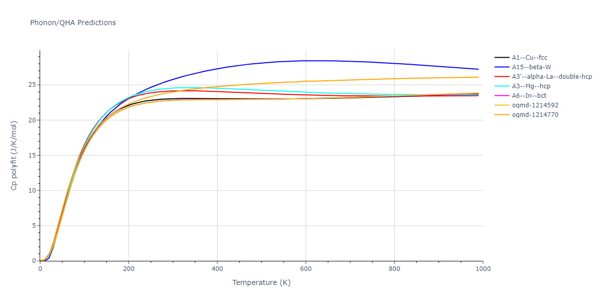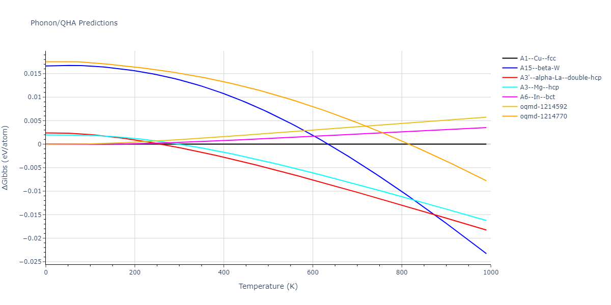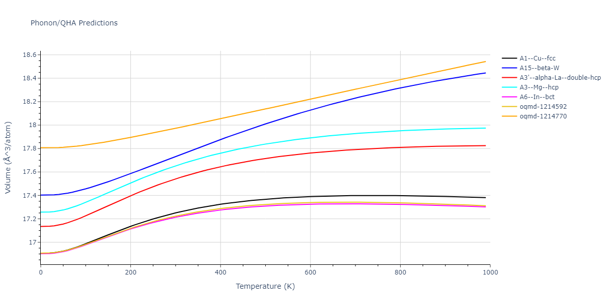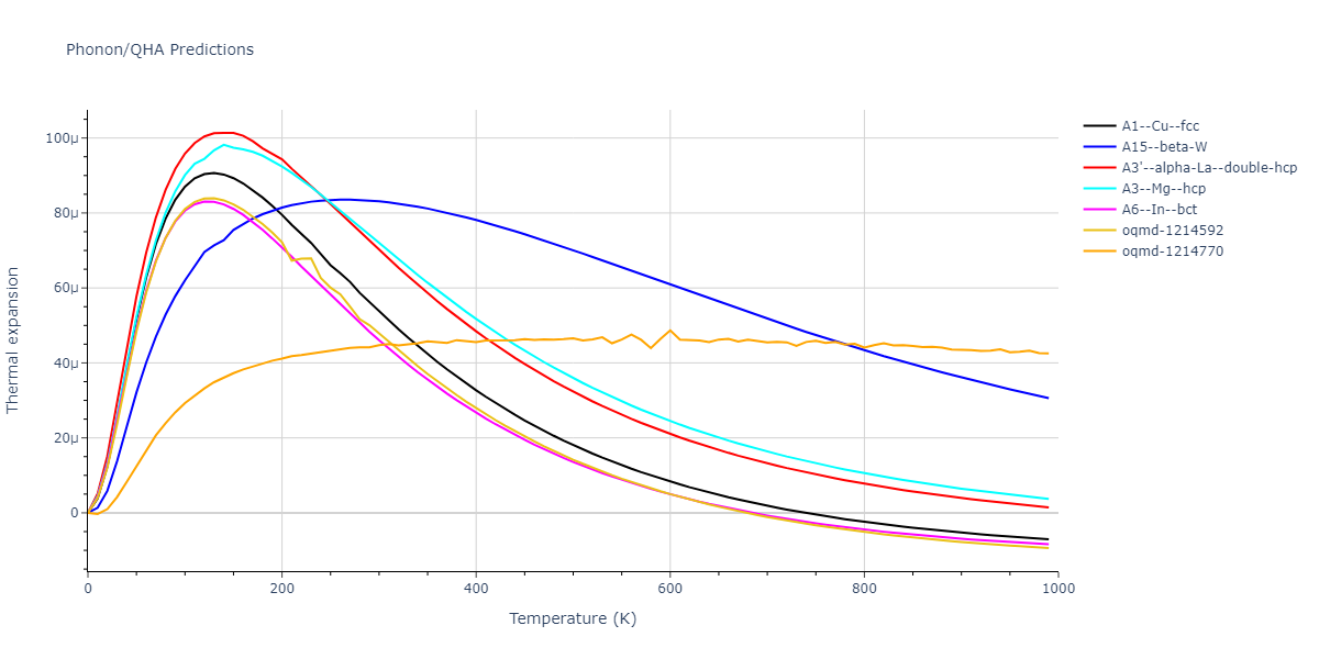 Phonon band structures and crystal properties estimated from quasi-harmonic approximation (QHA) calculations are displayed for select crystals. The calculations were performed using phonopy and LAMMPS. For the phonon calculations, 3x3 supercells of the potential-specific relaxed crystals were used. The QHA calculations were based on 11 strain states ranging from -0.05 to 0.05.
