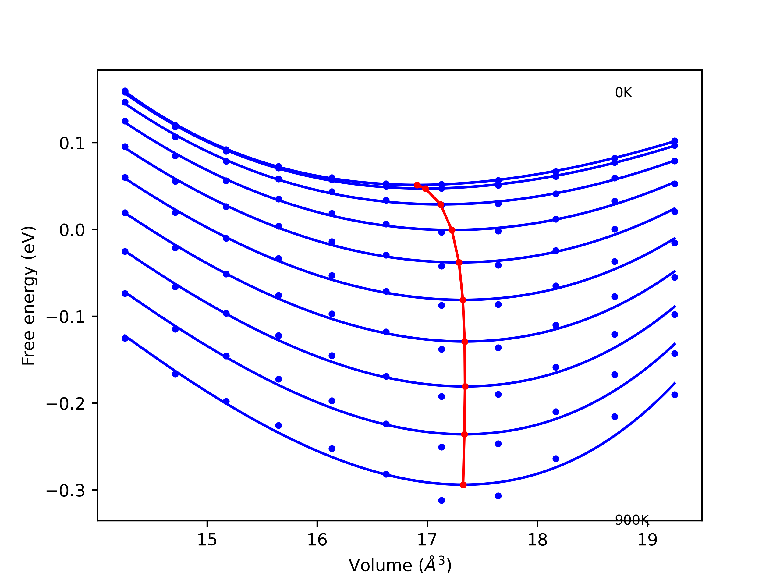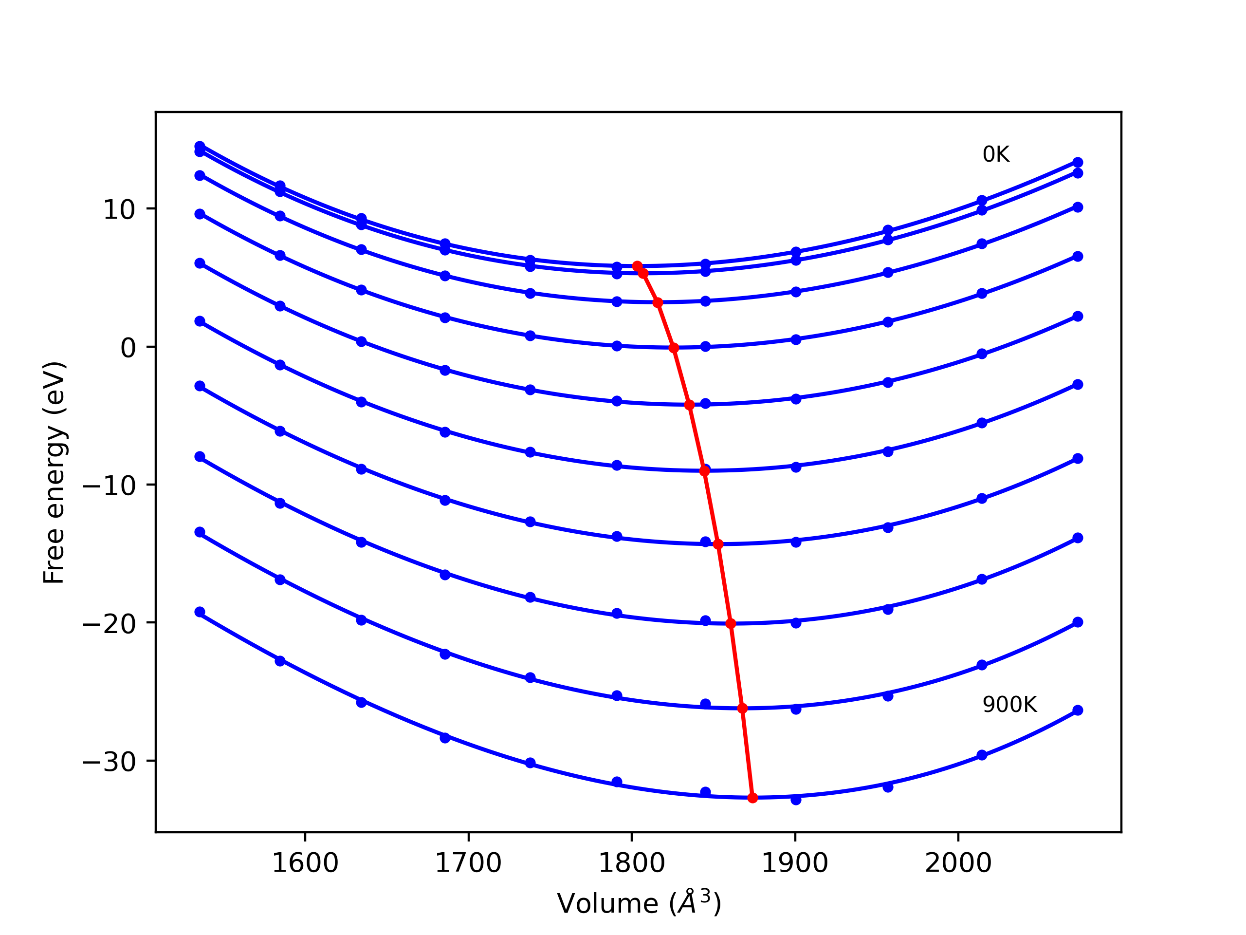 The Gibbs energies of the phases are estimated using thermodynamic integration between the interatomic potential in question and a simpler model with known Gibbs free energy values. For solids, the reference model is an Einstein solid, while for liquids it is the Uhlenbeck-Ford potential. Besides a short run at the start of the solid calculations to estimate Einstein model spring constants, the two calculations proceed similarly. Starting with the final relaxation configurations, the systems are stabilized for 25,000 steps. Then, over the next 50,000 steps the potential is swapped out for the reference potential. The system is then stabilized for another 25,000 steps with the reference model before a reverse swap of 50,000 steps is performed. The simulation ends with one final 25,000 step stabilization period. From the simulation, the (ir)reversible work of transformation is estimated and used to compute the absolute Gibbs free energy of the target phase and potential. Entropy is estimated as the difference in enthalpy and Gibbs free energy and divided by temperature.