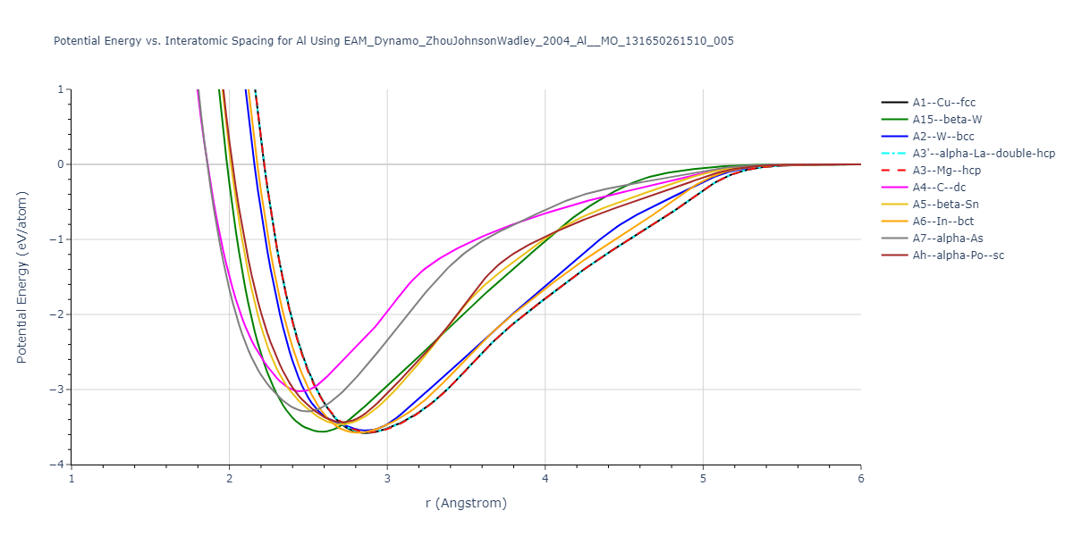Plots of potential energy vs interatomic spacing, r, are shown below for a number of crystal structures. The structures are generated based on the ideal atomic positions and b/a and c/a lattice parameter ratios for a given crystal prototype. The size of the system is then uniformly scaled, and the energy calculated without relaxing the system. To obtain these plots, values of r are evaluated every 0.02 Å up to 6 Å.