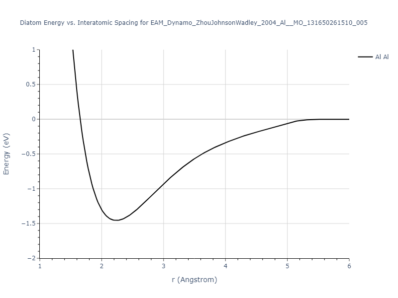 Plots of the potential energy vs interatomic spacing, r, are shown below for all diatom sets associated with the interatomic potential. This calculation provides insights into the functional form of the potential's two-body interactions. A system consisting of only two atoms is created, and the potential energy is evaluated for the atoms separated by 0.02 Å <= r <= 6.0> Å in intervals of 0.02 Å. Two plots are shown: one for the "standard" interaction distance range, and one for small values of r. The small r plot is useful for determining whether the potential is suitable for radiation studies.