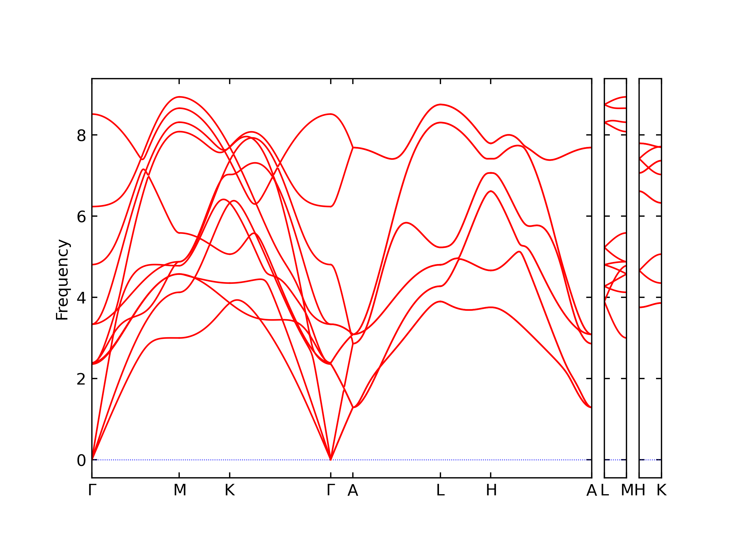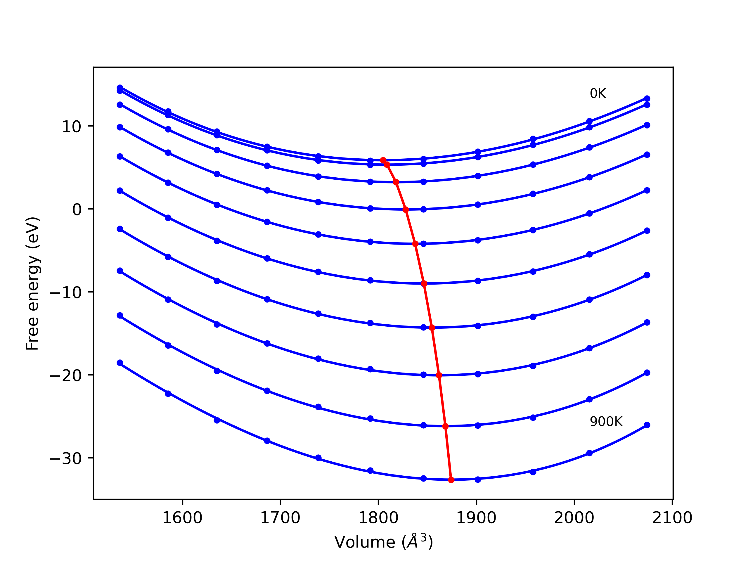 Phonon band structures and crystal properties estimated from quasi-harmonic approximation (QHA) calculations are displayed for select crystals. The calculations were performed using phonopy and LAMMPS. For the phonon calculations, 3x3 supercells of the potential-specific relaxed crystals were used. The QHA calculations were based on 11 strain states ranging from -0.05 to 0.05.
