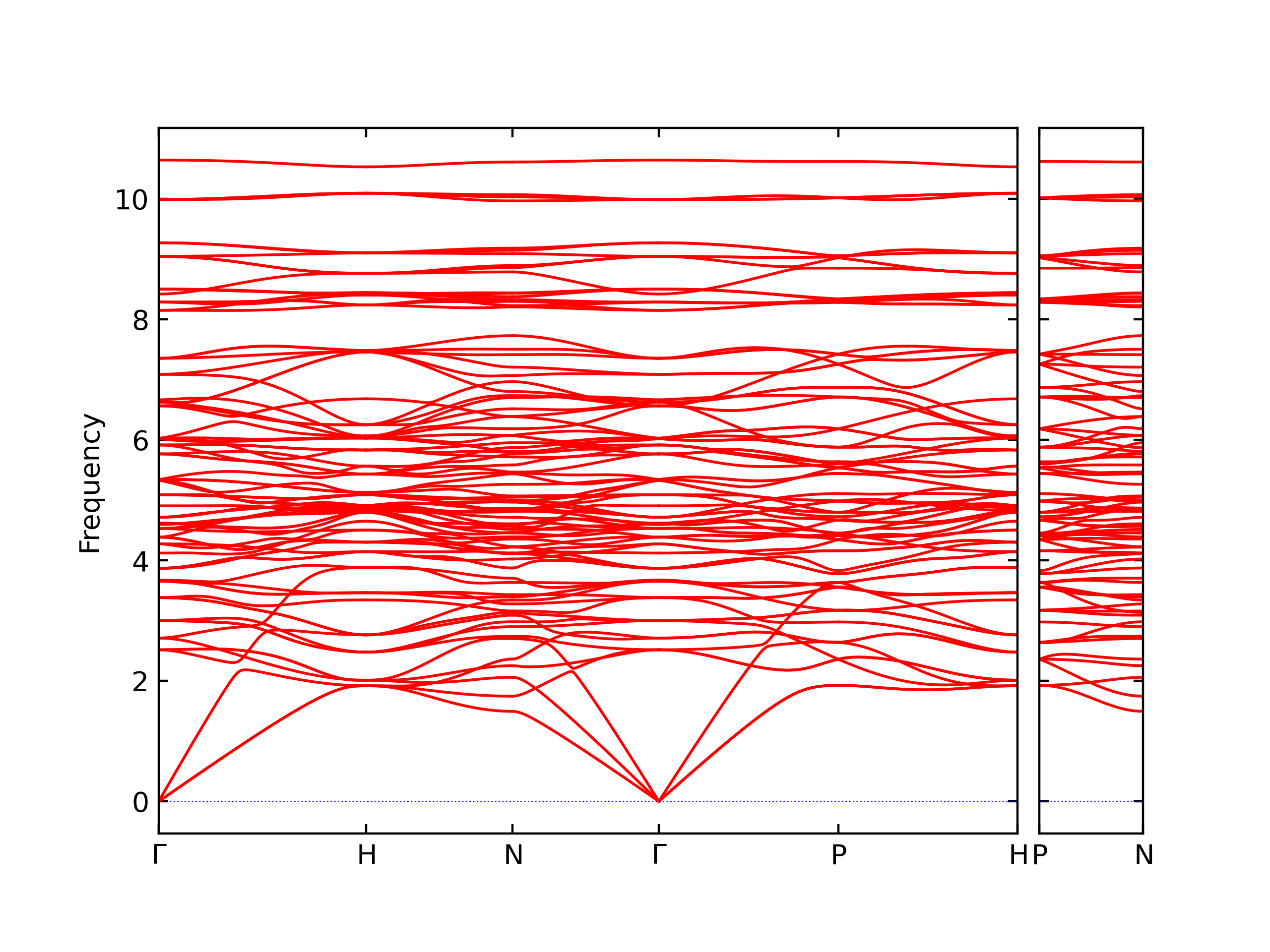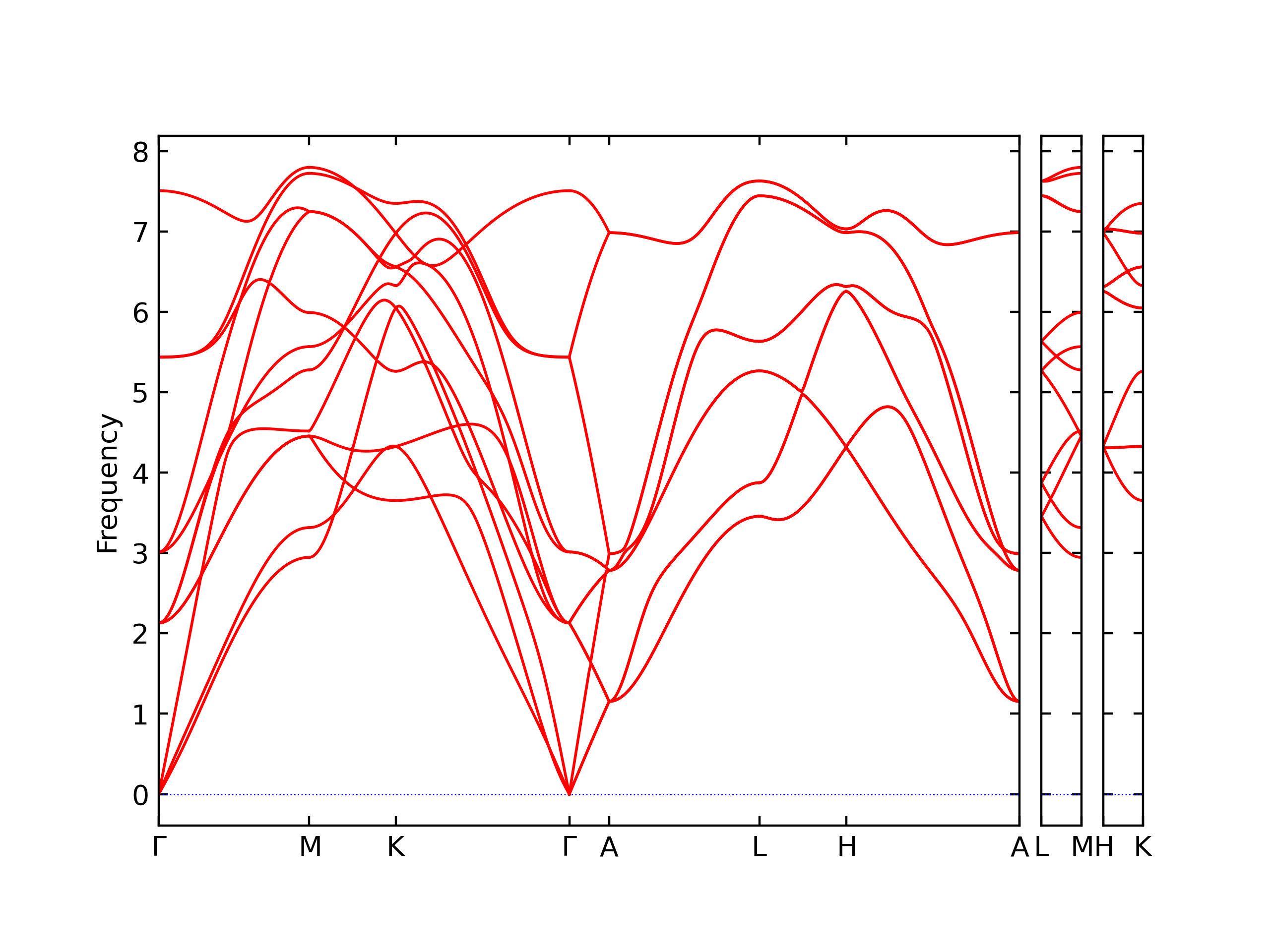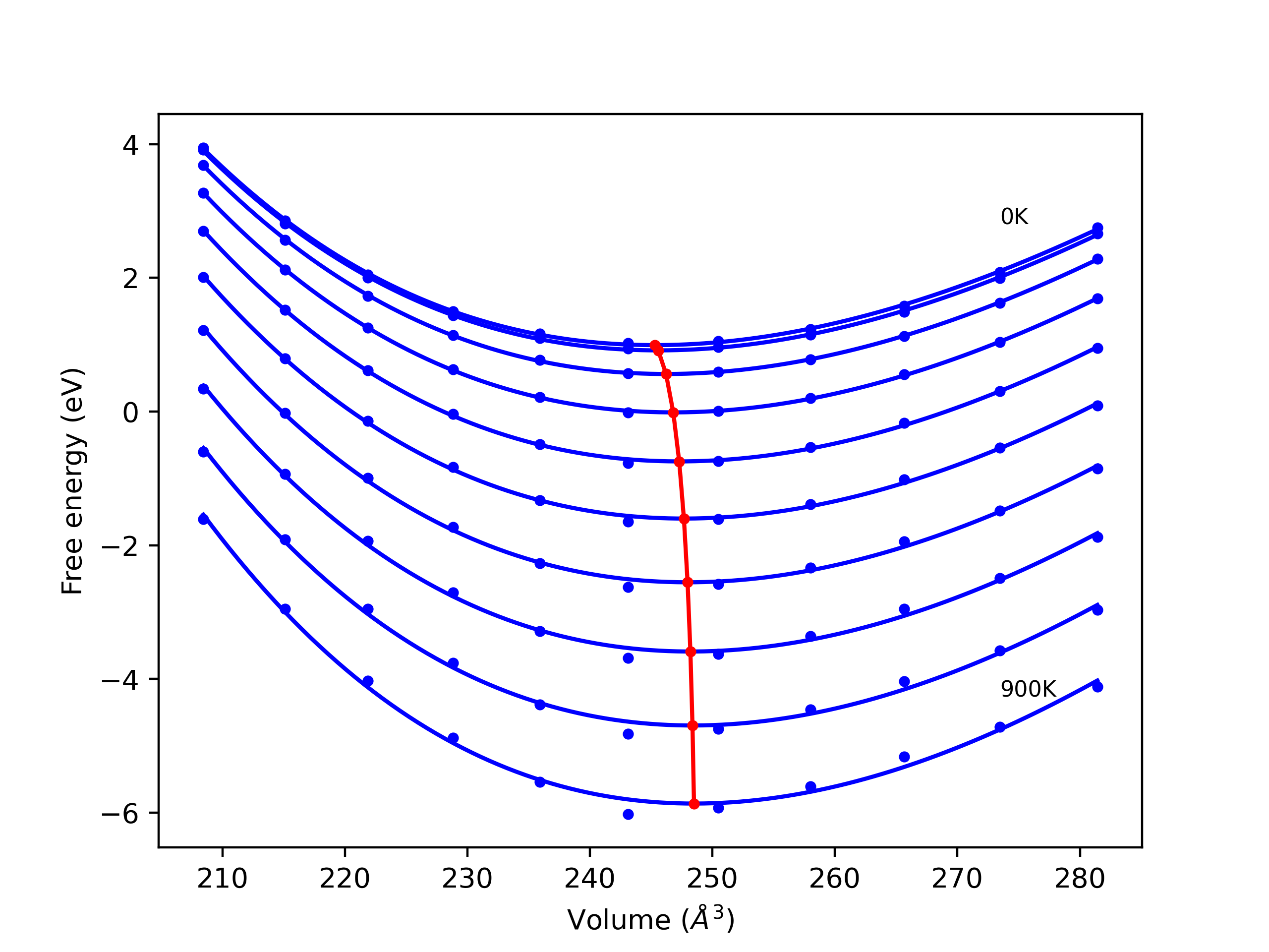Phonon band structures and crystal properties estimated from quasi-harmonic approximation (QHA) calculations are displayed for select crystals. The calculations were performed using phonopy and LAMMPS. For the phonon calculations, 3x3 supercells of the potential-specific relaxed crystals were used. The QHA calculations were based on 11 strain states ranging from -0.05 to 0.05.
