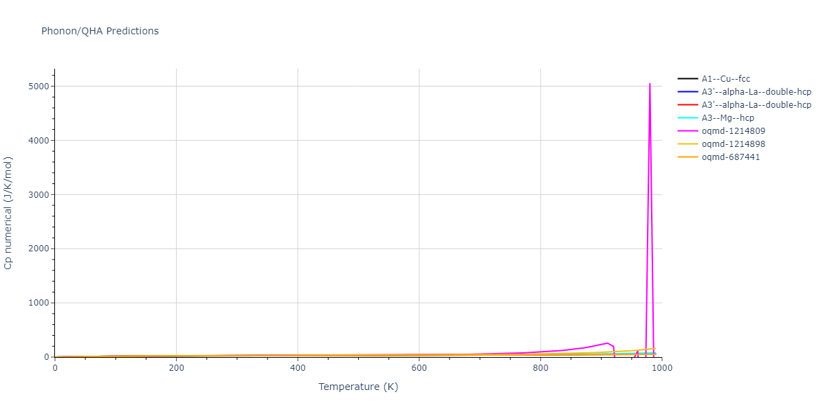 Plots of internal energy, Gibbs free energy, entropy, heat capacity and volume are shown here as a function of temperature for various crystal structures and liquid phases. The included crystal structures correspond to those in the Solid Structures vs. Temperature section, and the liquid phases to those in the Liquid Properties section. Internal energy and volume are taken from the associated structure relaxations mentioned in those previous sections. Constant pressure heat capacity is estimated using 3-point numerical derivatives of enthalpy versus temperature. Note that since all simulations done here are at 0 pressure, internal energy and enthalpy are equivalent.