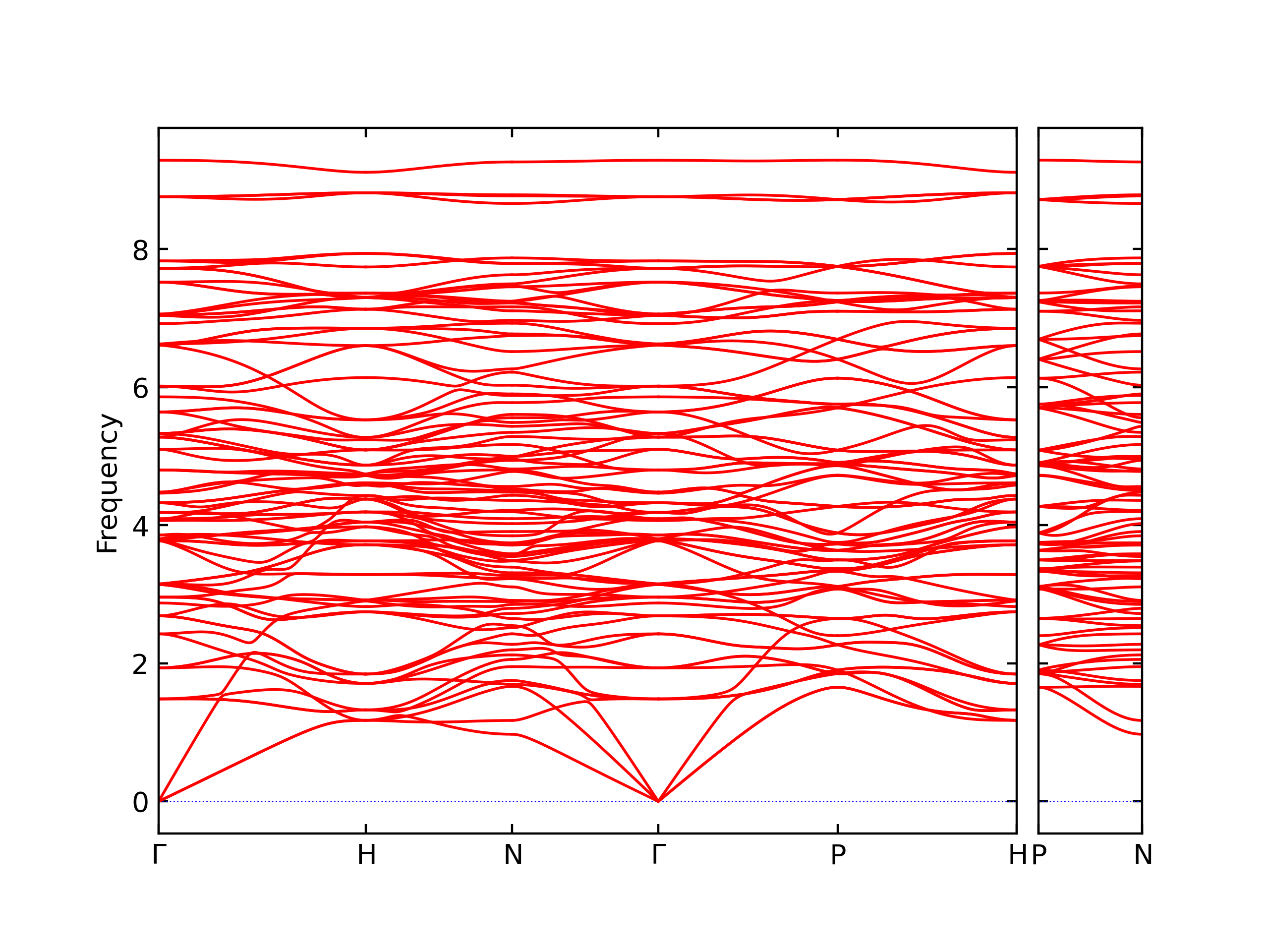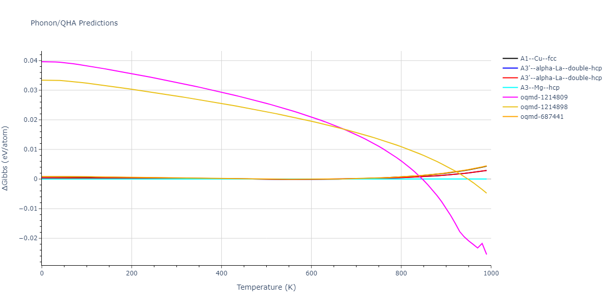 Phonon band structures and crystal properties estimated from quasi-harmonic approximation (QHA) calculations are displayed for select crystals. The calculations were performed using phonopy and LAMMPS. For the phonon calculations, 3x3 supercells of the potential-specific relaxed crystals were used. The QHA calculations were based on 11 strain states ranging from -0.05 to 0.05.