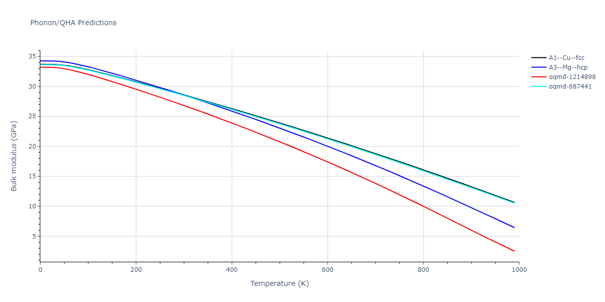 Phonon band structures and crystal properties estimated from quasi-harmonic approximation (QHA) calculations are displayed for select crystals. The calculations were performed using phonopy and LAMMPS. For the phonon calculations, 3x3 supercells of the potential-specific relaxed crystals were used. The QHA calculations were based on 11 strain states ranging from -0.05 to 0.05.