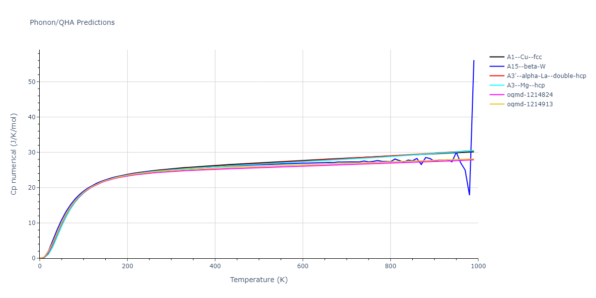 Phonon band structures and crystal properties estimated from quasi-harmonic approximation (QHA) calculations are displayed for select crystals. The calculations were performed using phonopy and LAMMPS. For the phonon calculations, 3x3 supercells of the potential-specific relaxed crystals were used. The QHA calculations were based on 11 strain states ranging from -0.05 to 0.05.