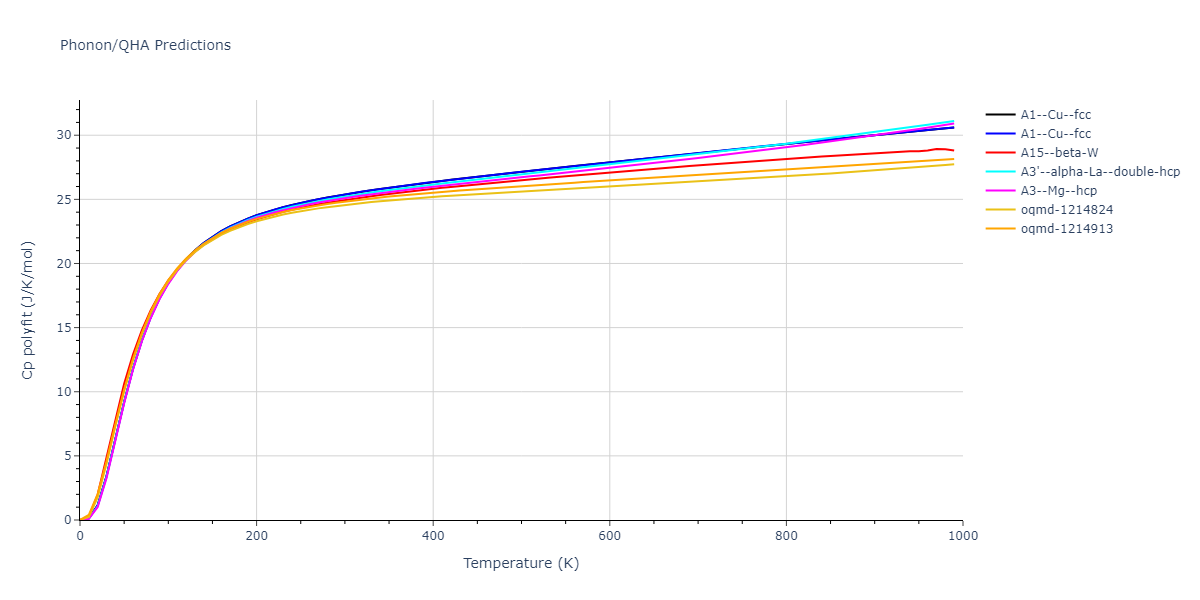 Phonon band structures and crystal properties estimated from quasi-harmonic approximation (QHA) calculations are displayed for select crystals. The calculations were performed using phonopy and LAMMPS. For the phonon calculations, 3x3 supercells of the potential-specific relaxed crystals were used. The QHA calculations were based on 11 strain states ranging from -0.05 to 0.05.
