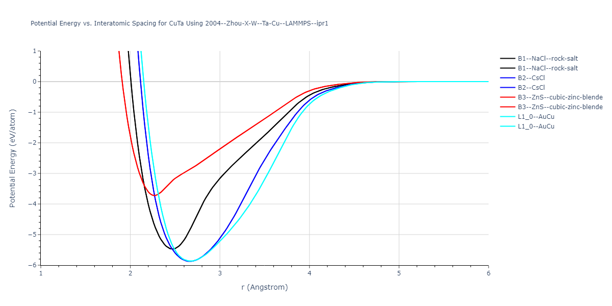 Plots of potential energy vs interatomic spacing, r, are shown below for a number of crystal structures. The structures are generated based on the ideal atomic positions and b/a and c/a lattice parameter ratios for a given crystal prototype. The size of the system is then uniformly scaled, and the energy calculated without relaxing the system. To obtain these plots, values of r are evaluated every 0.02 Å up to 6 Å.