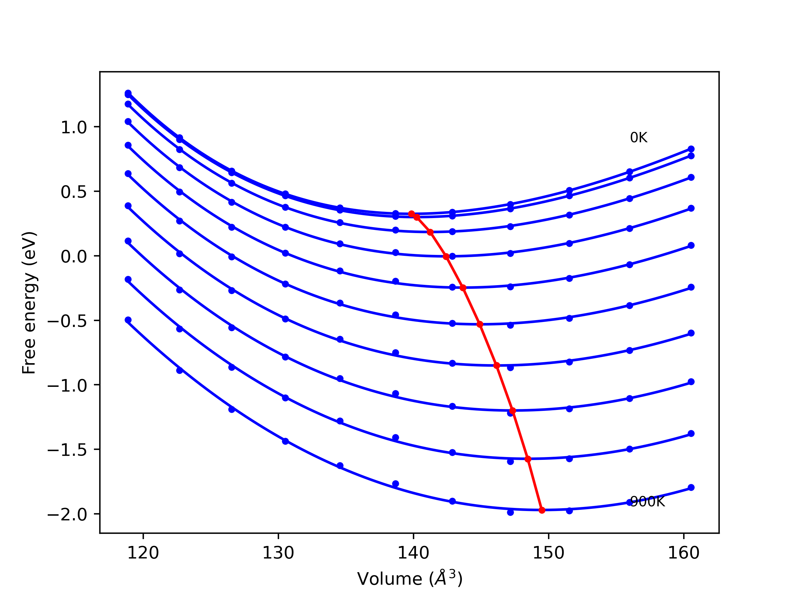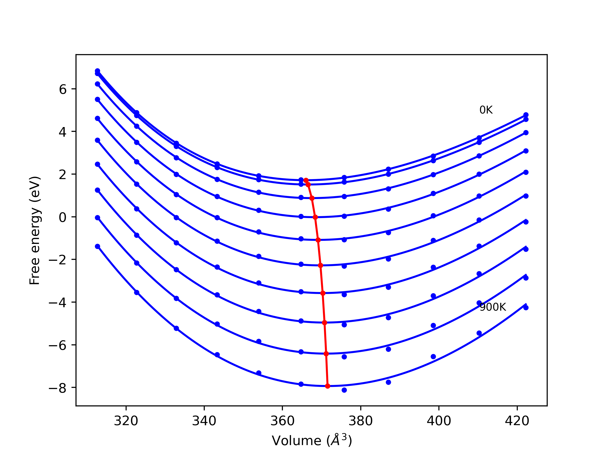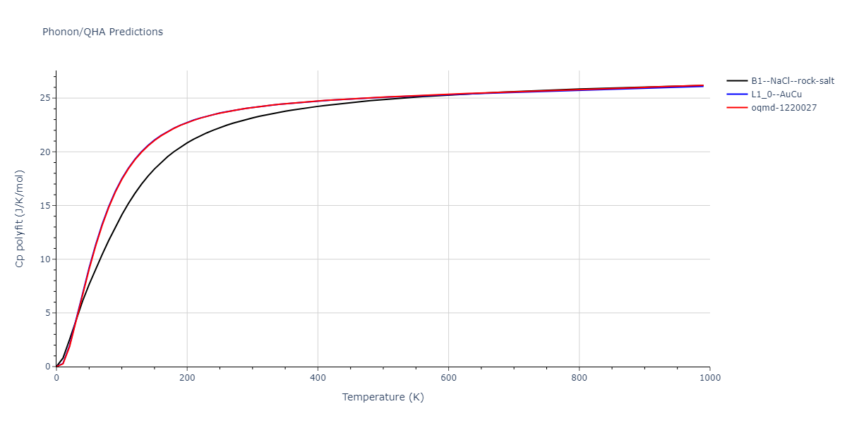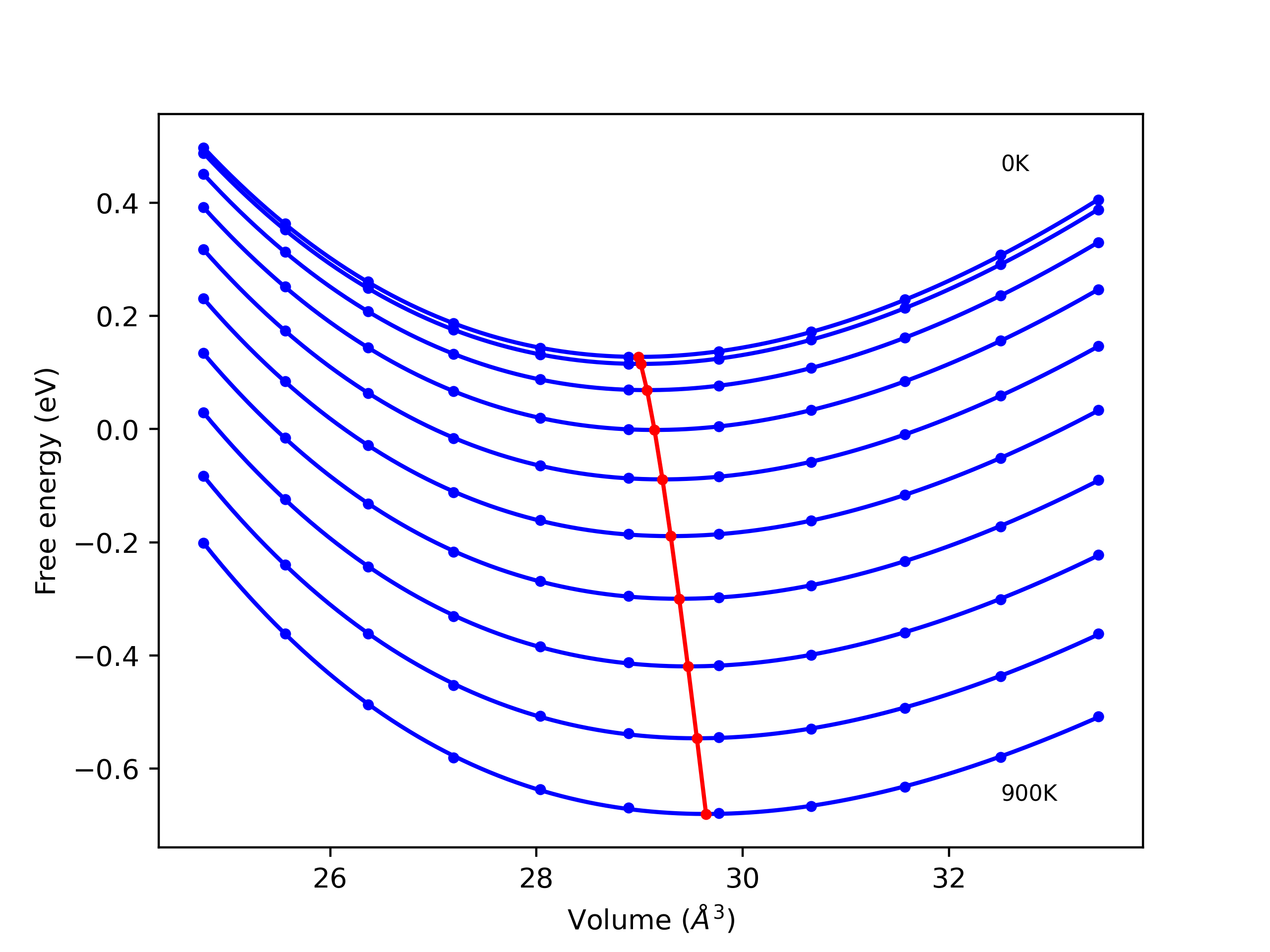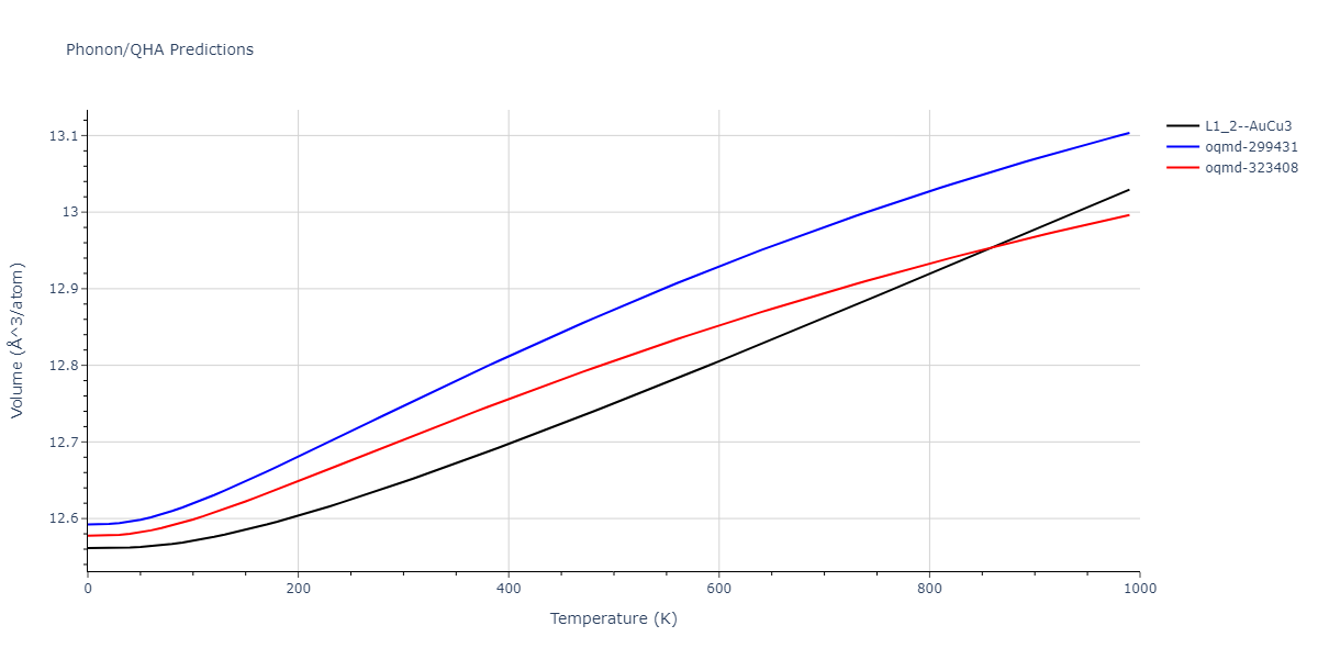 Phonon band structures and crystal properties estimated from quasi-harmonic approximation (QHA) calculations are displayed for select crystals. The calculations were performed using phonopy and LAMMPS. For the phonon calculations, 3x3 supercells of the potential-specific relaxed crystals were used. The QHA calculations were based on 11 strain states ranging from -0.05 to 0.05.